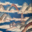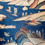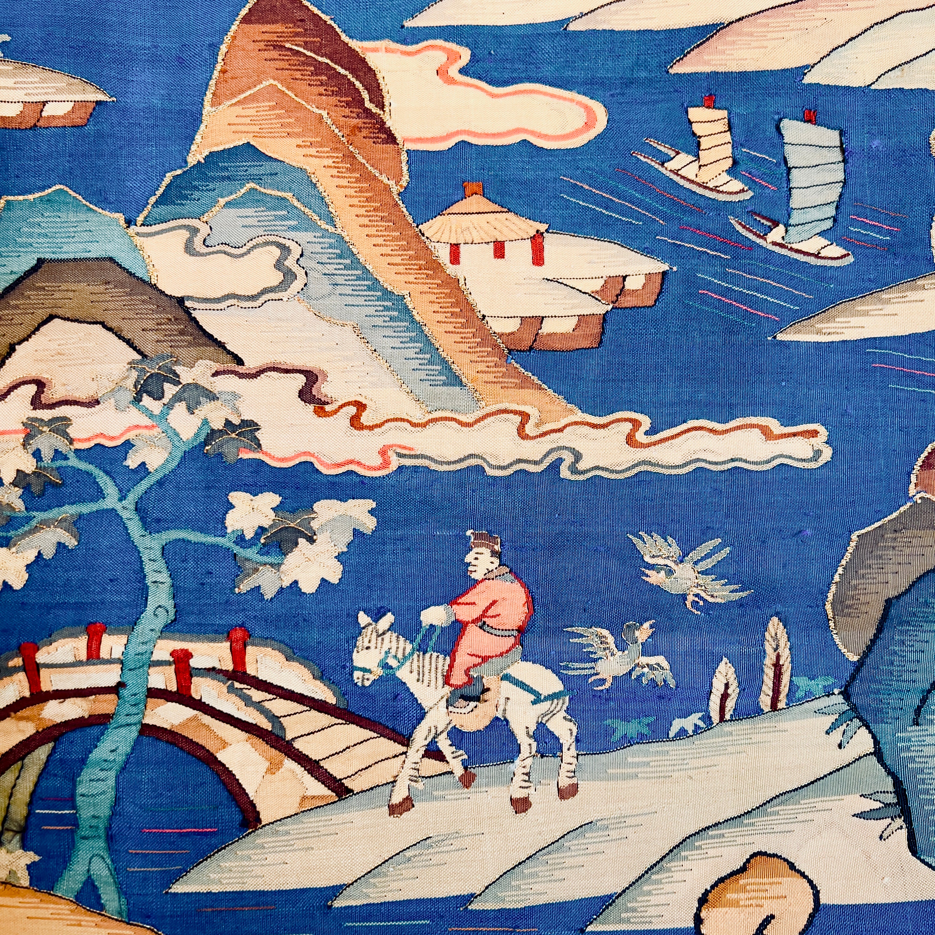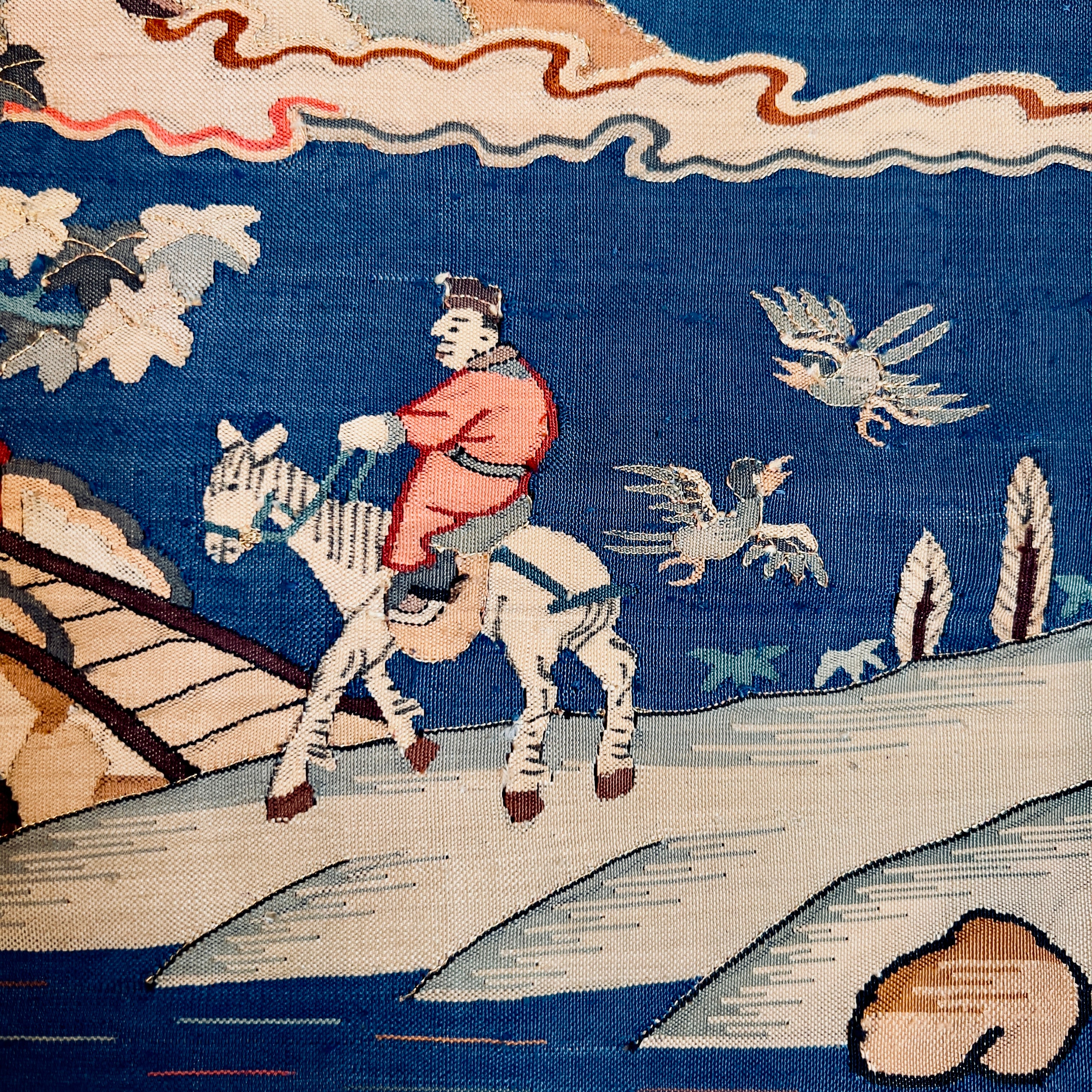 Grand panneau chinois en kesi représentant un paysage de lettrés, tissé en soie et fil d’or sur fond bleu. La composition montre dans la partie haute une chaîne de montagnes stylisées parmi les nuages, avec une petite pagode. Au centre, un cavalier en robe rouge traverse un pont, accompagné d’oiseaux en vol. Dans la partie basse, deux personnages sont installés dans un pavillon ouvert, entourés de rochers, d’arbres en fleurs et de petits îlots rocheux. L’ensemble reprend les codes classiques du paysage lettré chinois : montagnes, eau, pont, pavillon et personnages cultivés, sans référence explicite à un épisode littéraire précis.