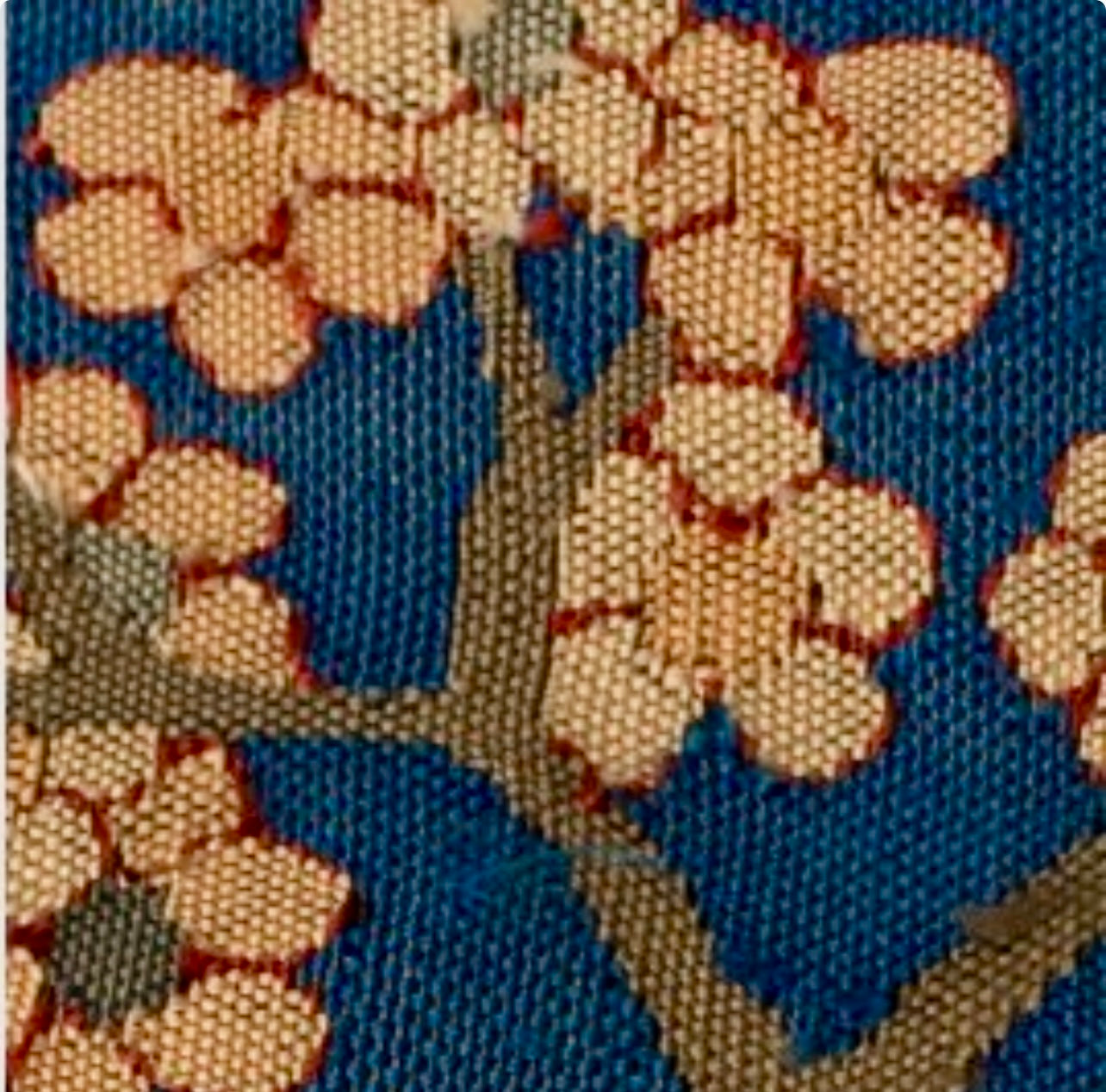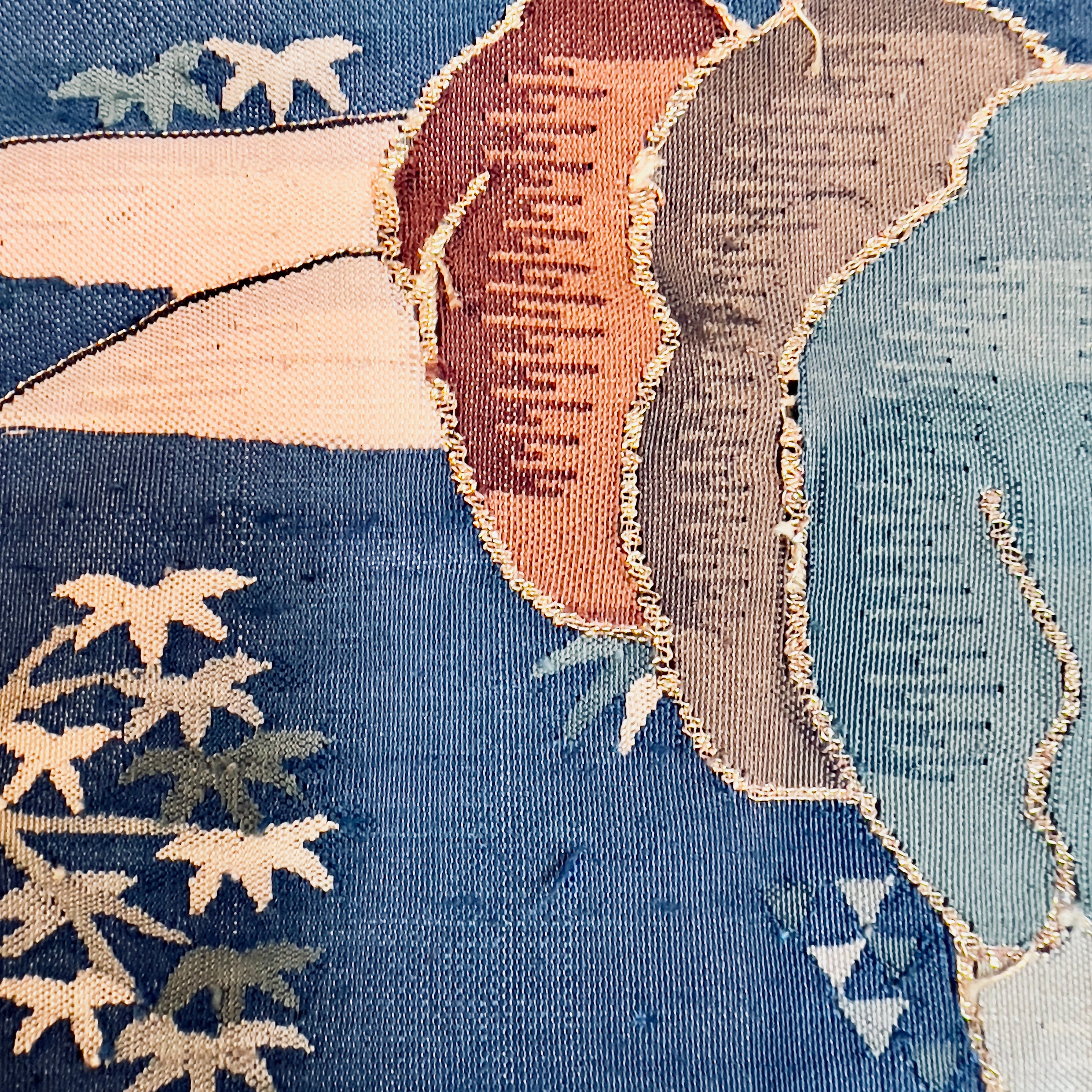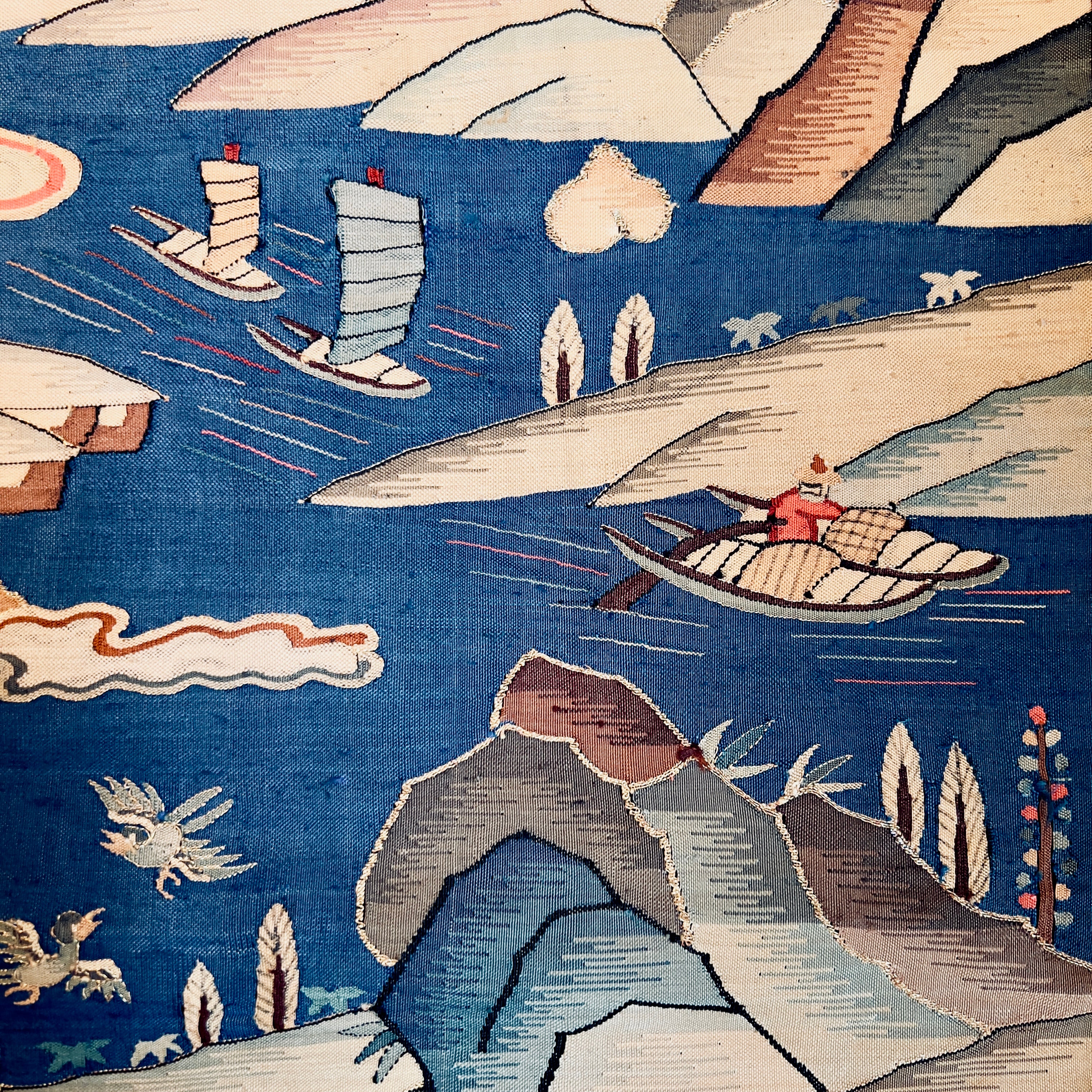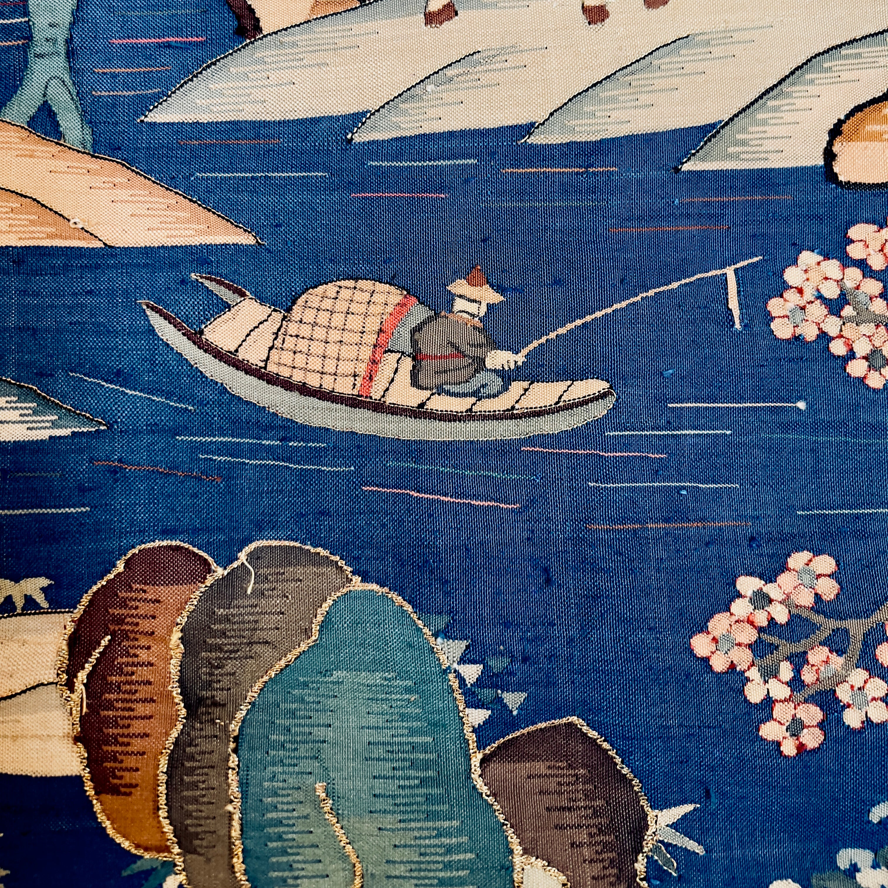 Le panneau est tissé en kesi (k’o-ssu), technique de tapisserie de soie où chaque zone de couleur est tissée séparément. Le fil de soie est légèrement irrégulier, ce qui indique un filage artisanal. Les contours des montagnes, nuages, toits et rochers sont soulignés par du fil d’or, et le fond bleu, teint avec des pigments naturels, présente un ton indigo mat. La densité de tissage, la palette de couleurs et le dessin des figures orientent vers une production d’atelier du XIXe siècle. La finition par un étroit biais de soie noire cousu à la main correspond à un montage soigné pour un usage décoratif autonome.