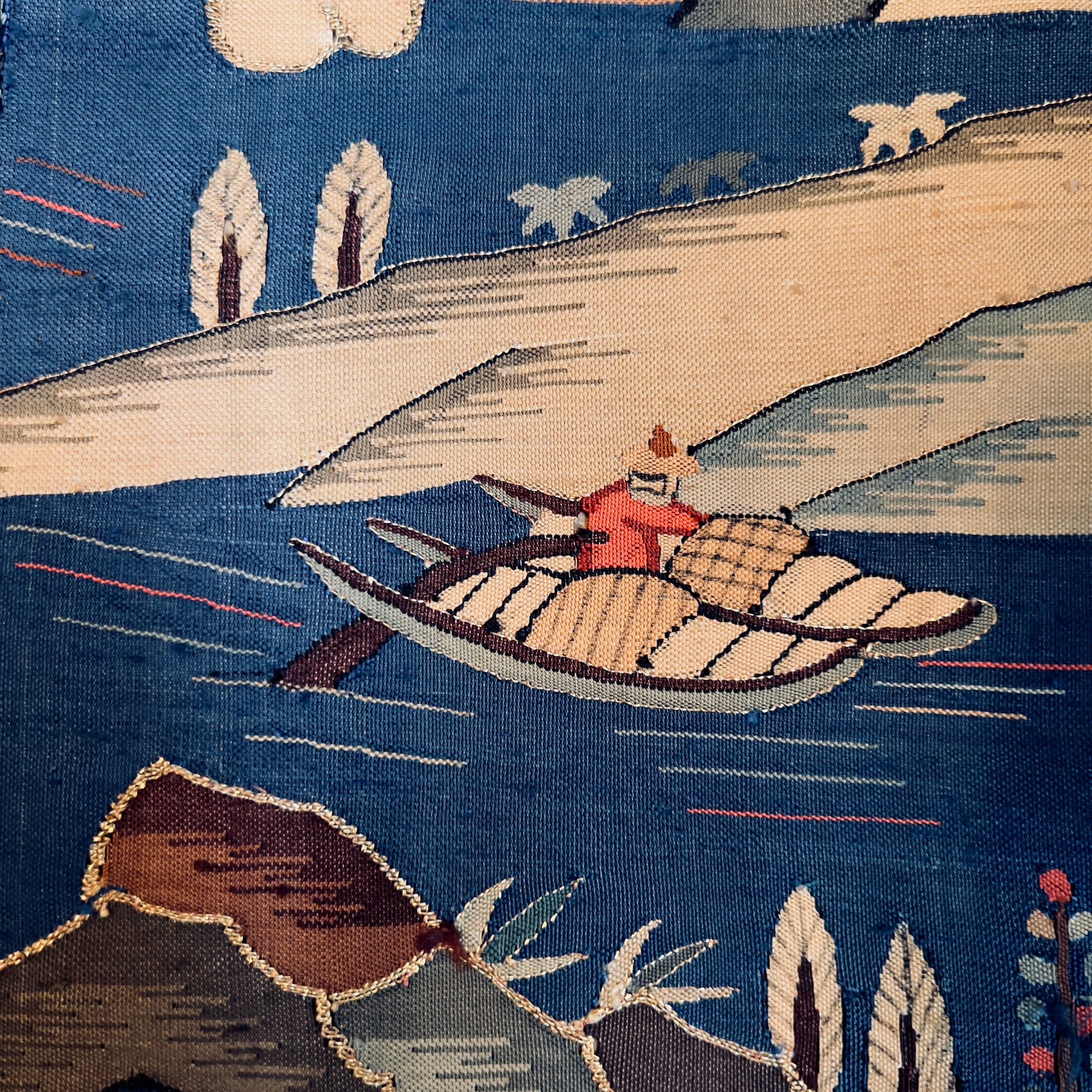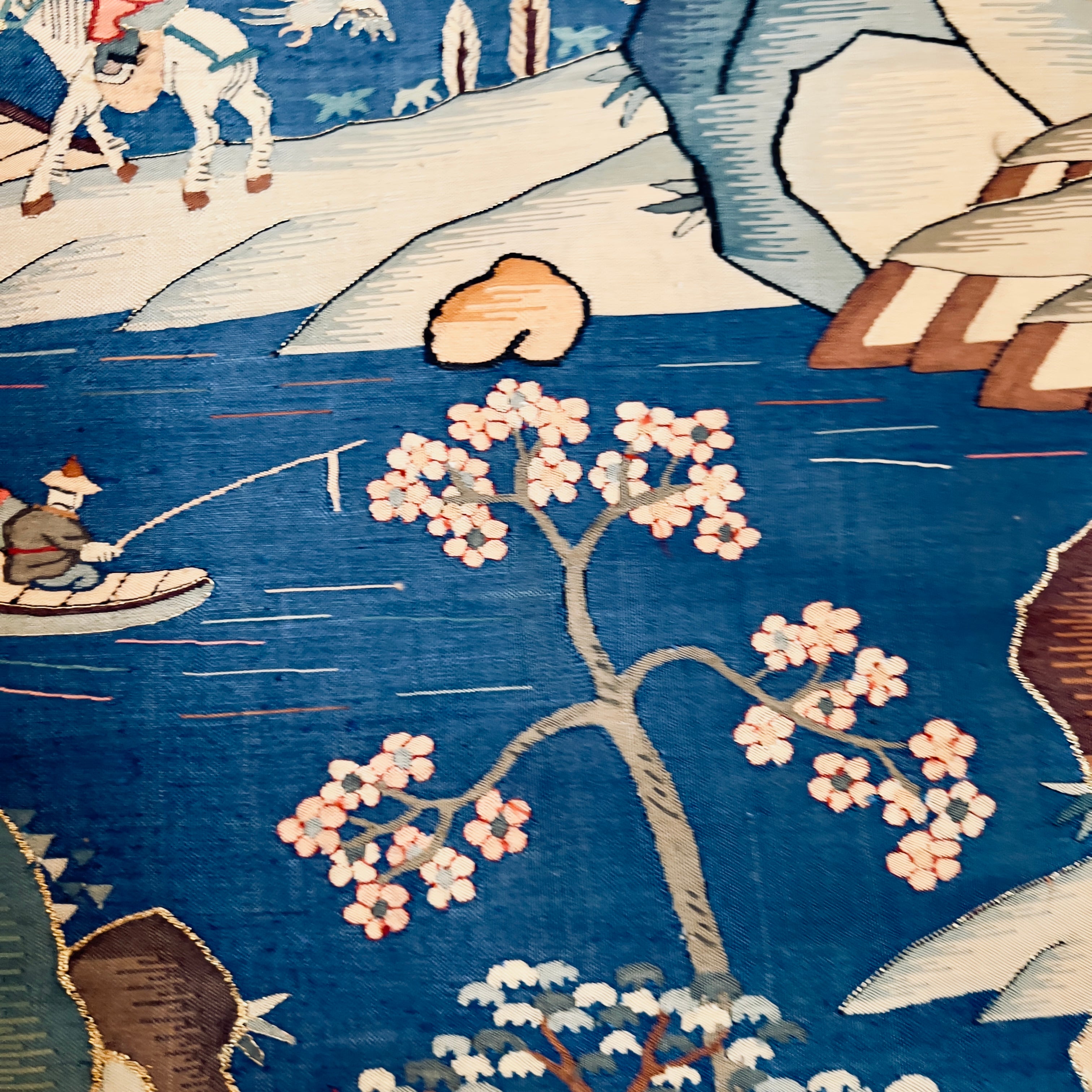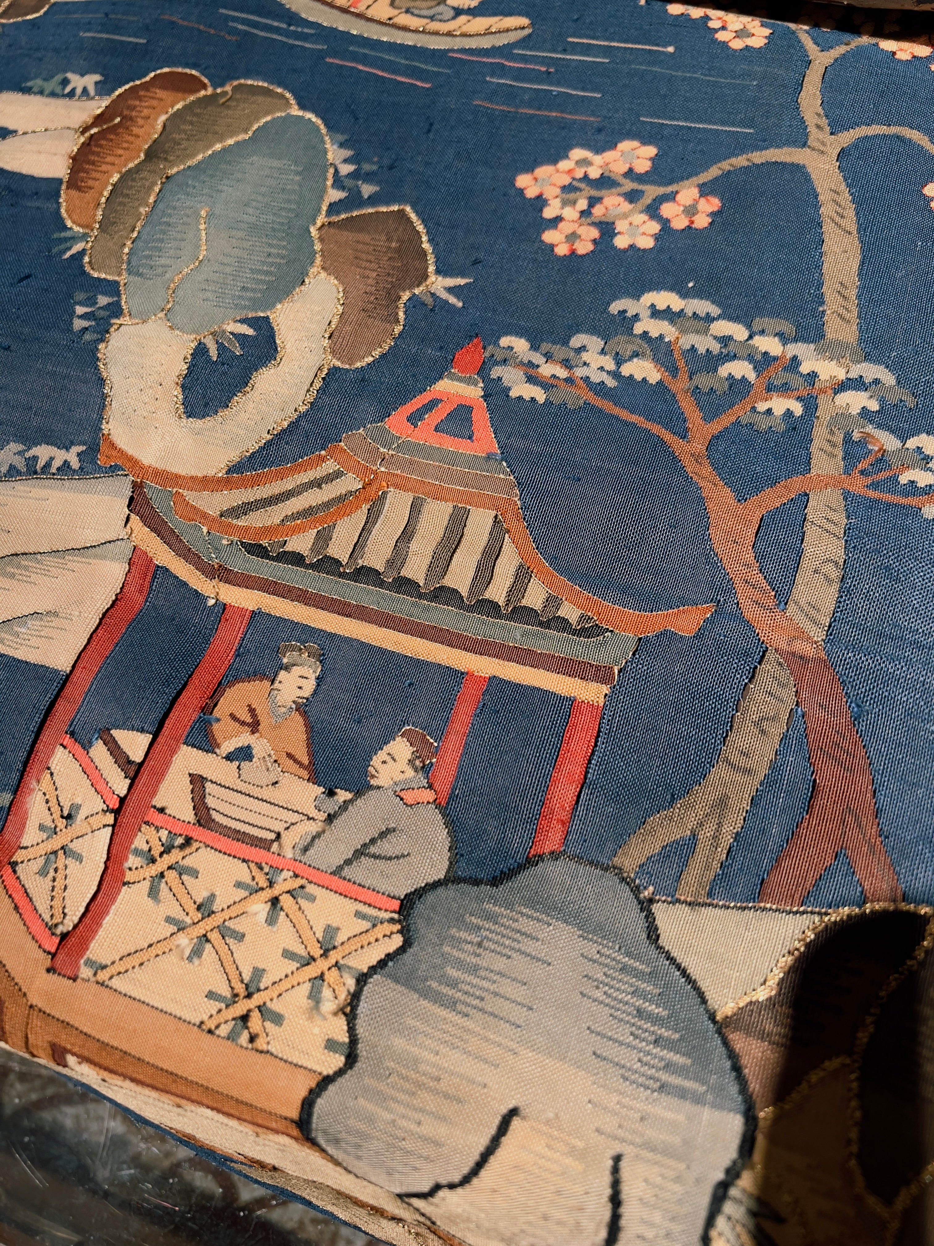 Ce panneau en kesi de soie et fil d’or est un bon exemple de textile chinois de l’époque Qing, avec un décor lisible et complet de paysage de lettrés. Son format vertical en fait un textile ancien directement exploitable en décoration murale, aussi bien dans un intérieur classique que contemporain. Pour un collectionneur de textiles chinois ou un décorateur, il offre une pièce décorative de belle taille, réalisée dans une technique recherchée, avec des matériaux nobles et une iconographie typique de la culture lettrée chinoise.