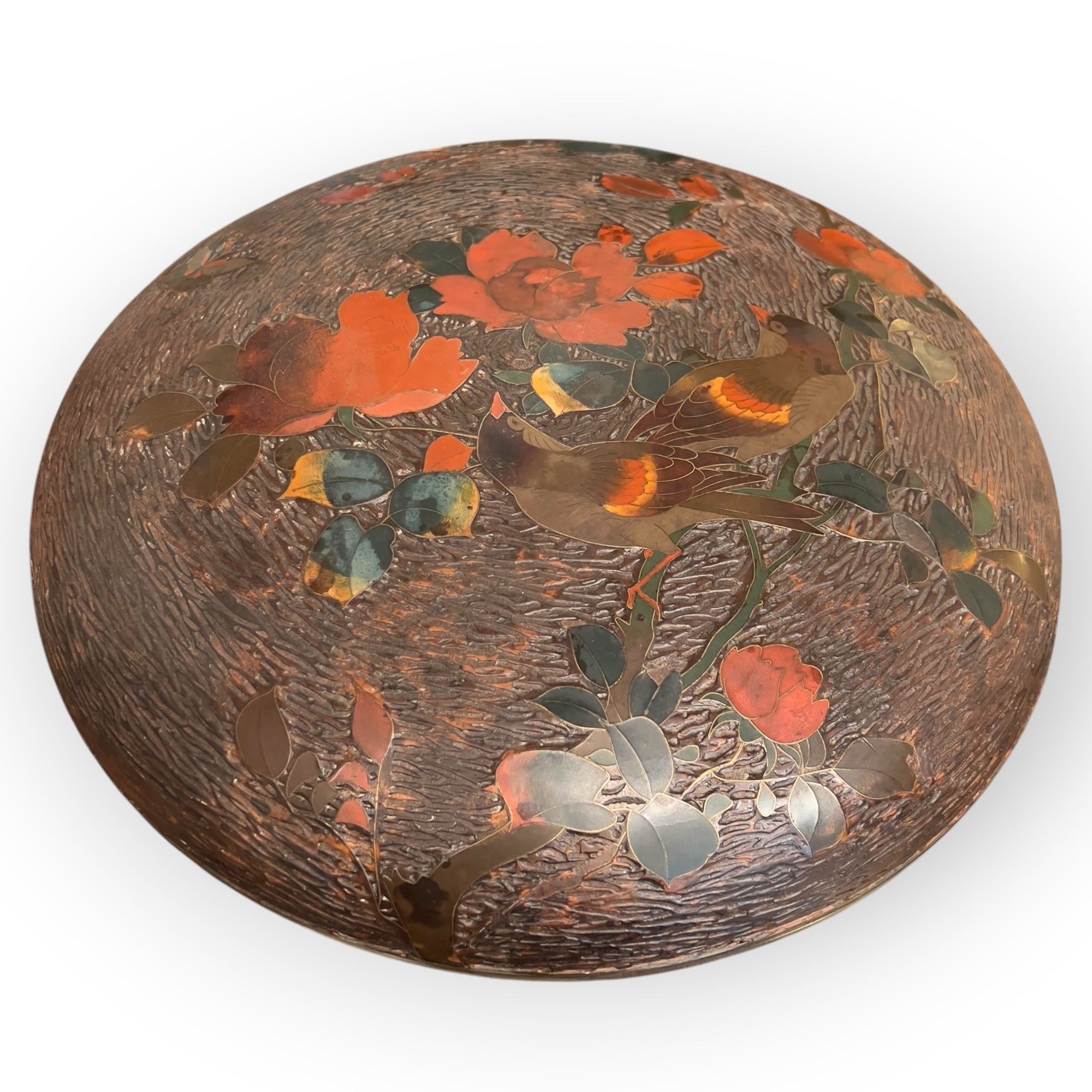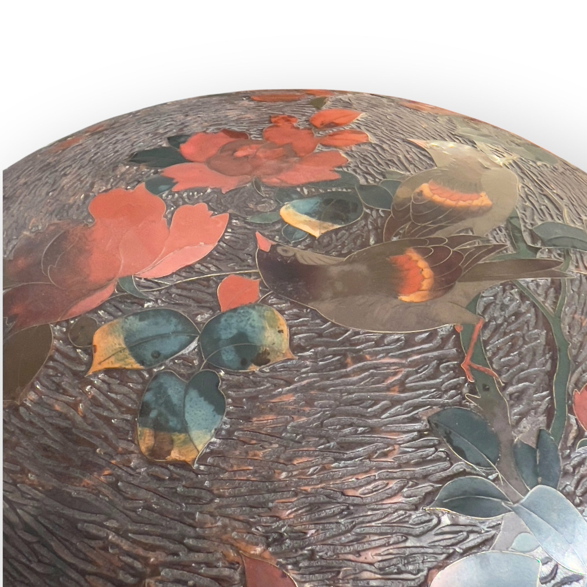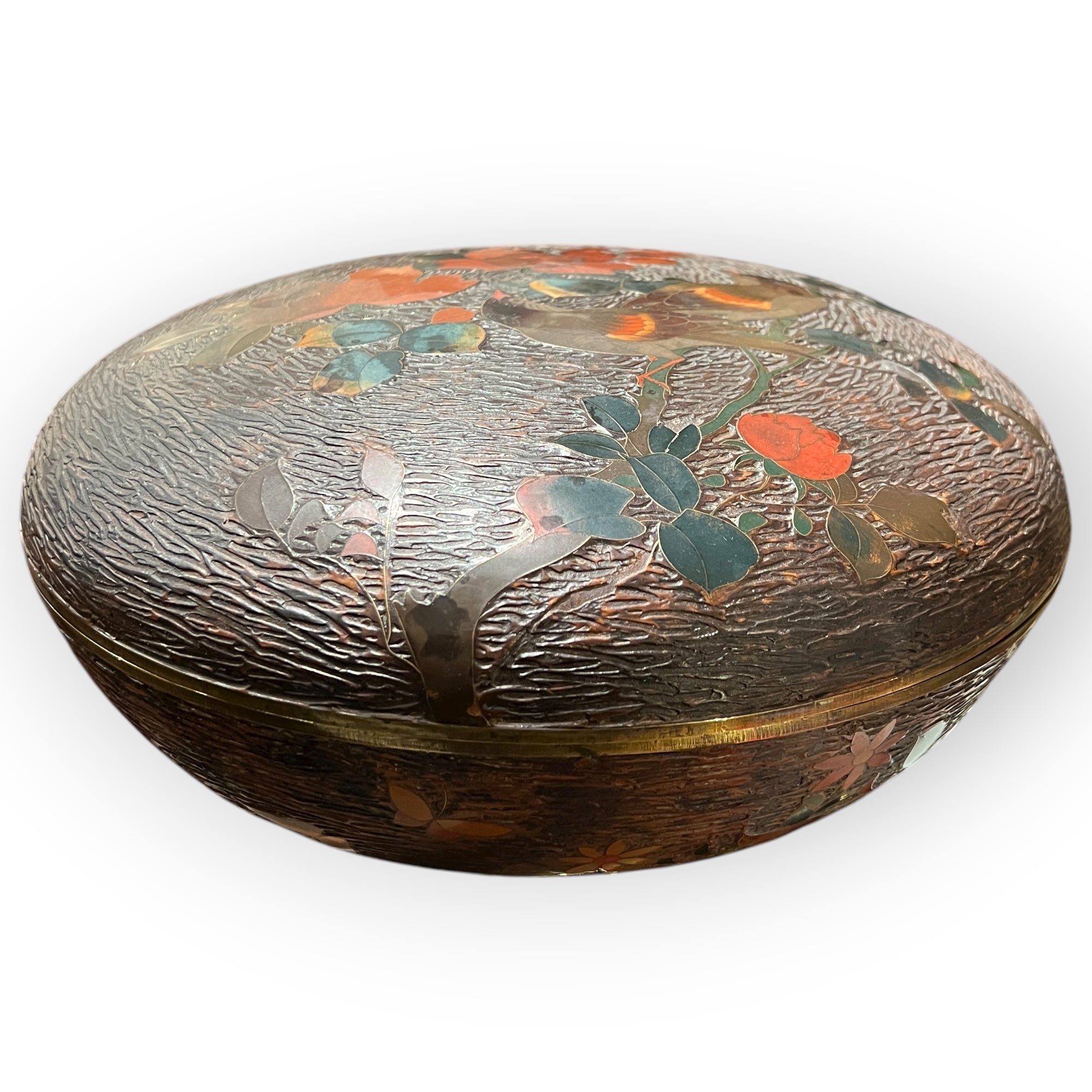 Grande boite en cloisonné de laque sur métal, décor d’oiseaux branchés et de fleurs sur fond d’écorce.