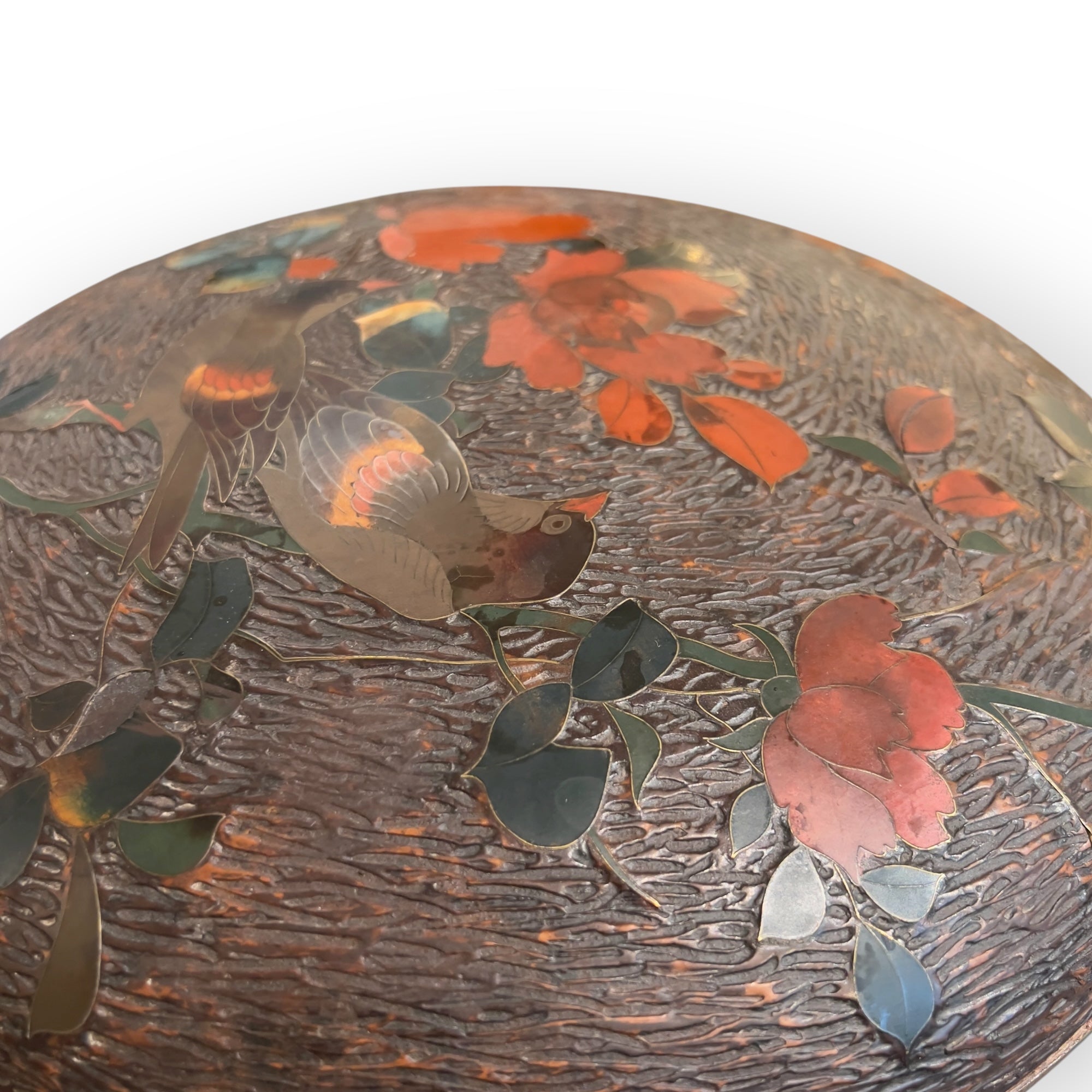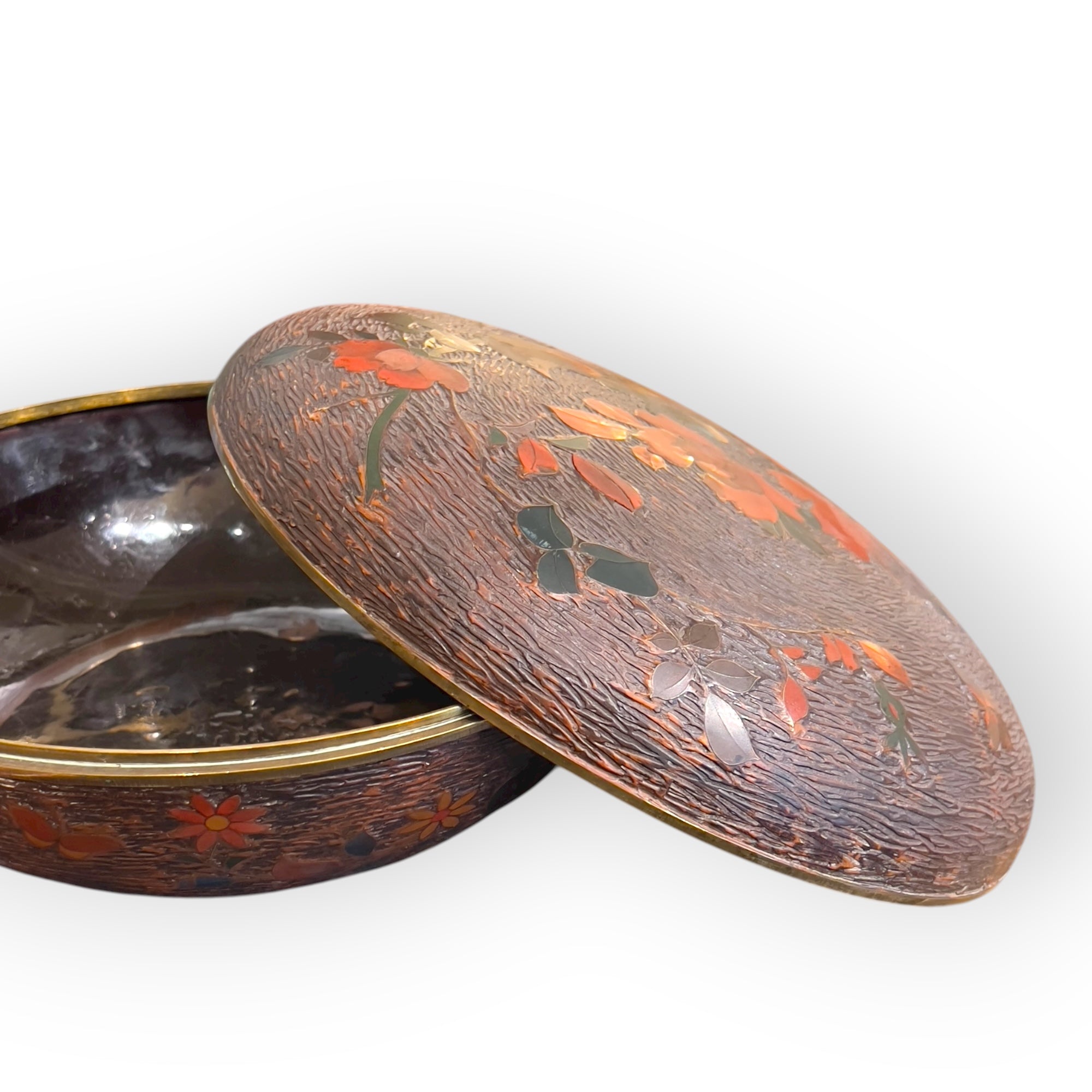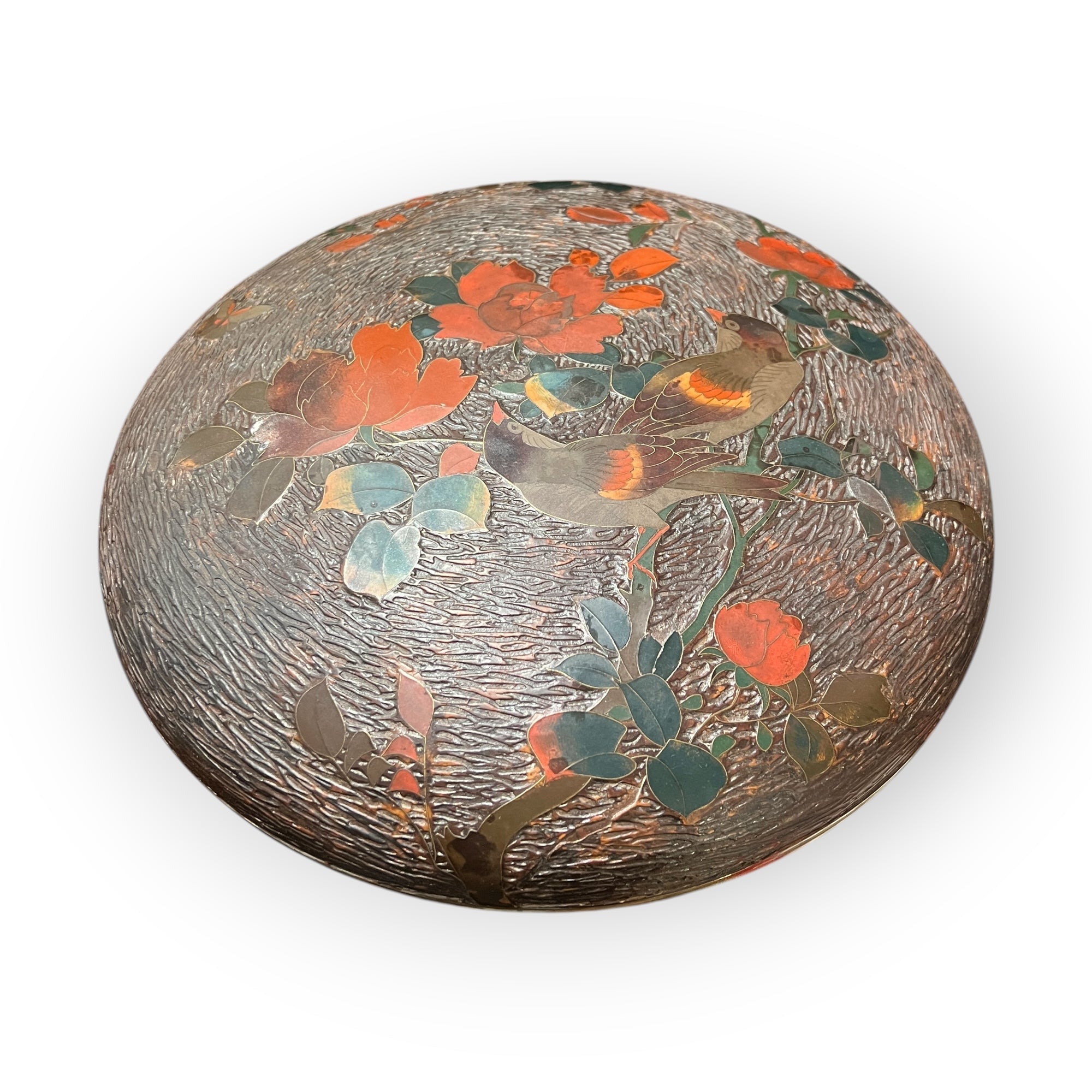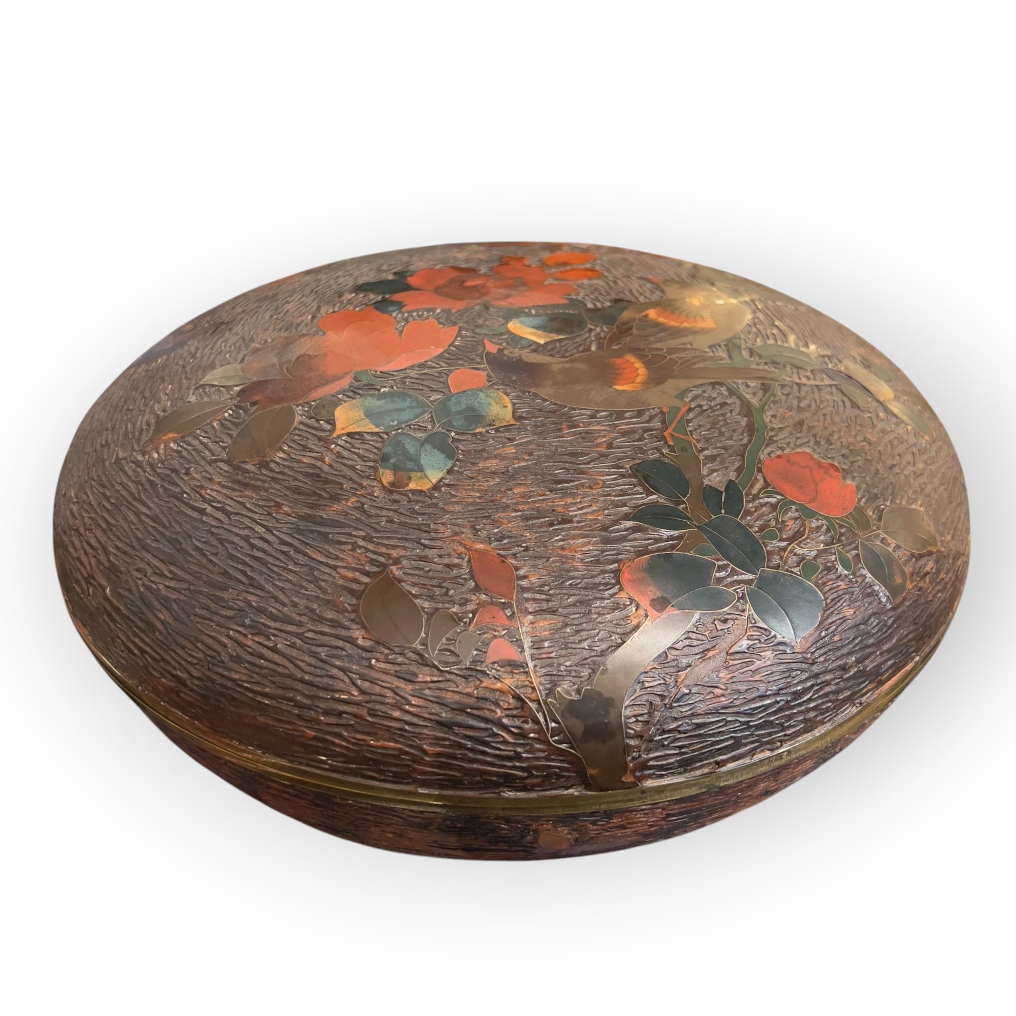 Grande boite en cloisonné de laque sur métal, décor d’oiseaux branchés et de fleurs sur fond d’écorce.