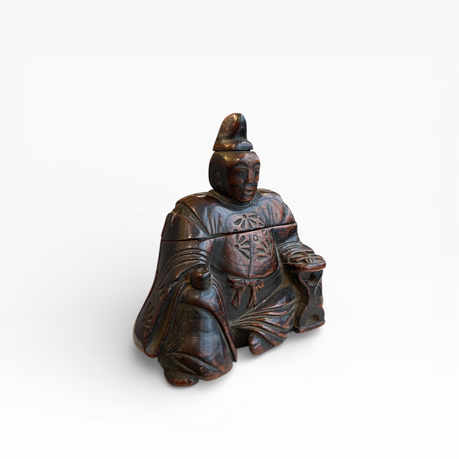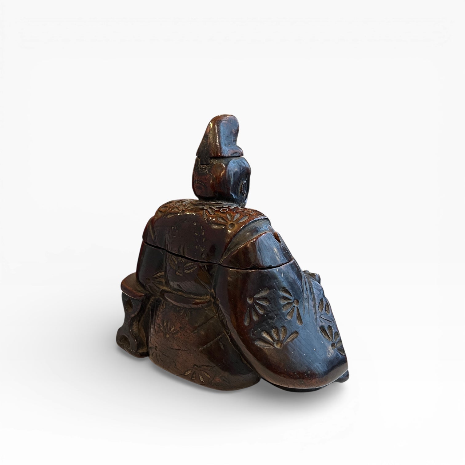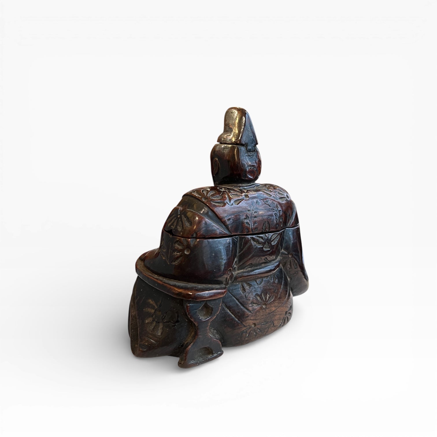 Le vêtement est traité comme un riche textile, entièrement gravé d’un décor floral. L’ensemble est enrichi par une patine d’usage qui révèle le fil du bois et adoucit les arêtes. Dans le dos du personnage, un motif distinct, isolé du semis floral, peut être interprété comme un kamon très stylisé, de type fuji-mon (glycine), dans une variante montante, attribuée habituellement à des membres de la famille Fujihara.