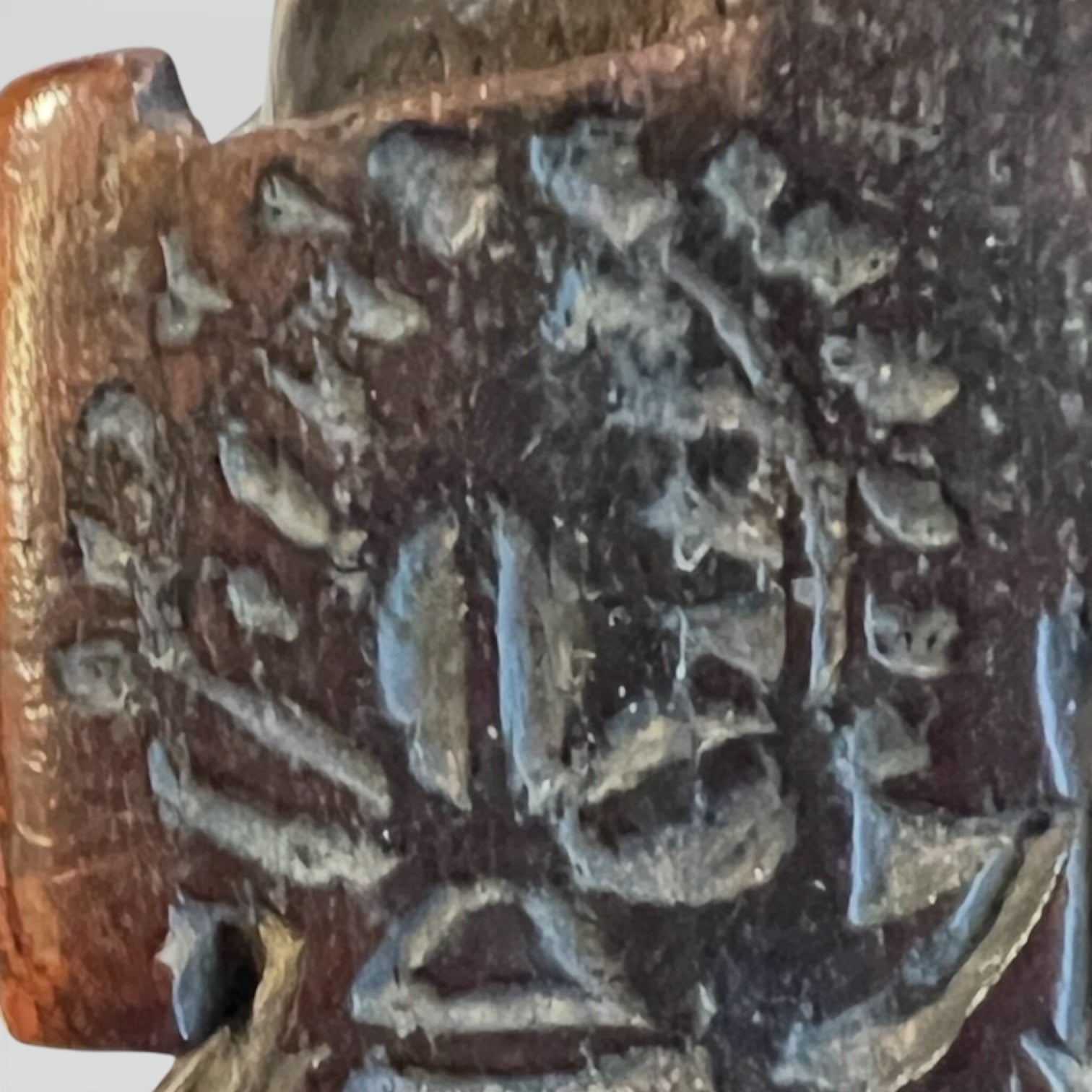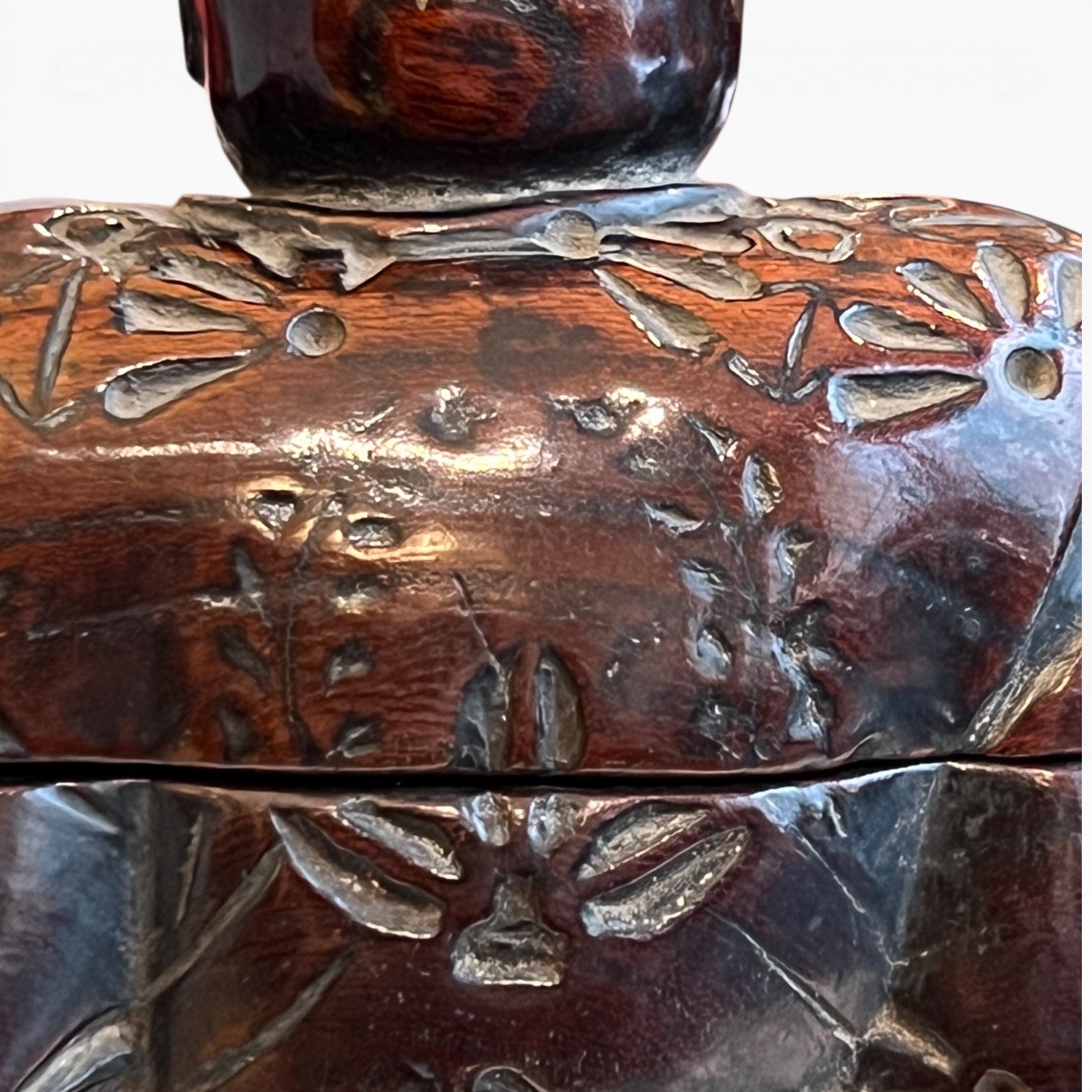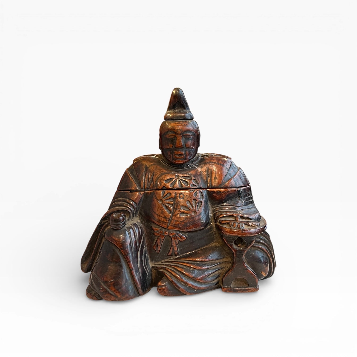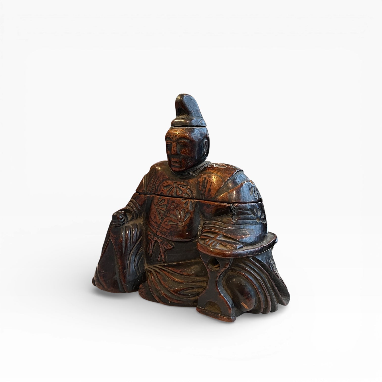 Le vêtement est traité comme un riche textile, entièrement gravé d’un décor floral. L’ensemble est enrichi par une patine d’usage qui révèle le fil du bois et adoucit les arêtes. Dans le dos du personnage, un motif distinct, isolé du semis floral, peut être interprété comme un kamon très stylisé, de type fuji-mon (glycine), dans une variante montante, attribuée habituellement à des membres de la famille Fujihara.