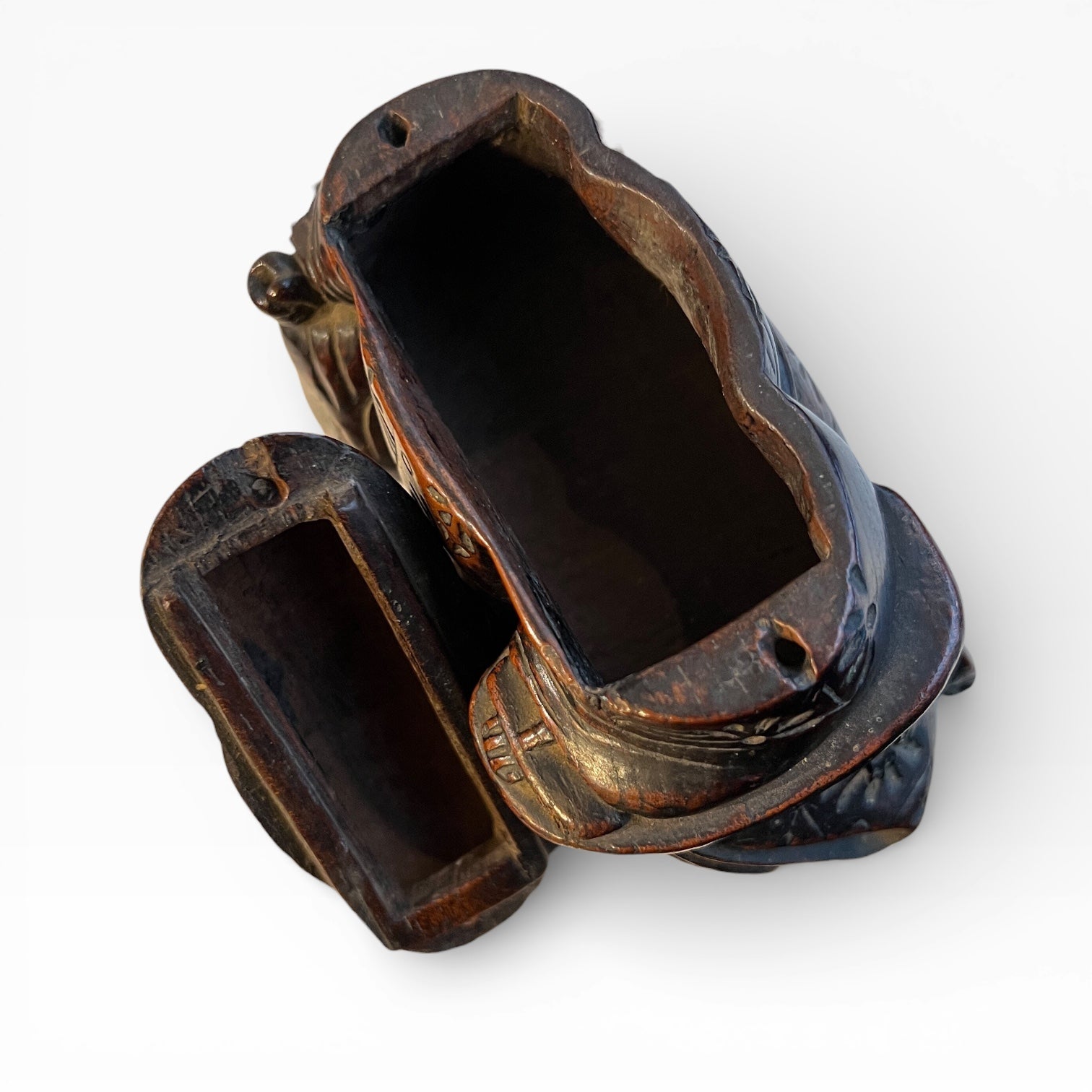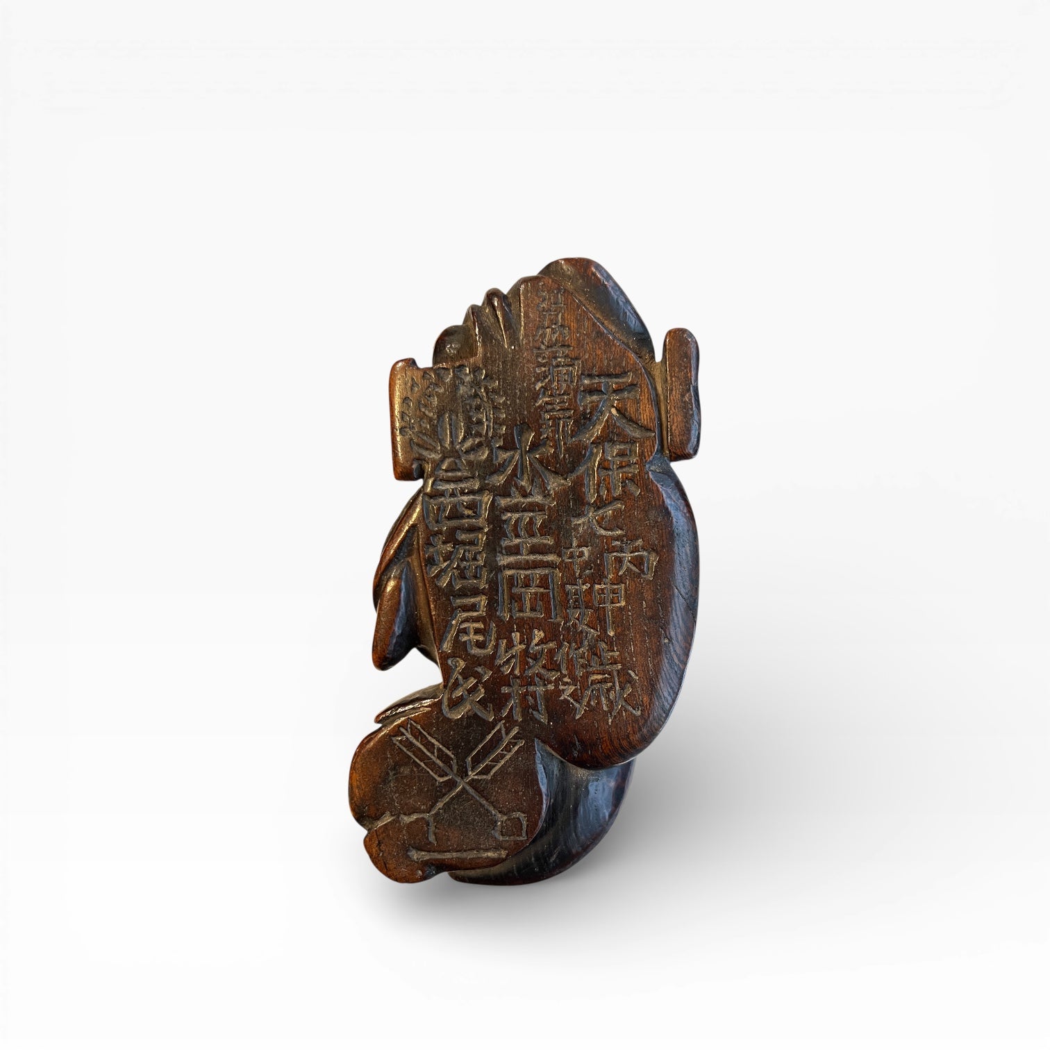 La surface gravée est complétée par des éléments figurés intégrés à la composition, notamment deux flèches, ainsi qu’un rappel du motif héraldique (kamon). L’ensemble, par la qualité de sculpture, la conservation du dispositif intérieur et la présence d’une inscription datée et signée, constitue un témoignage documenté et peu courant des accessoires de tabac de la fin de l’époque Edo.