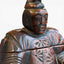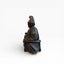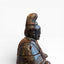 Tonkotsu sculpté en ronde-bosse en bois de paulownia. Il représente un personnage masculin assis, une jambe relevée, la main correspondante appuyée sur le genou, le poing fermé et percé, indiquant la présence originelle d’un attribut rapporté aujourd’hui disparu. L’autre bras repose sur un appui-bras sculpté, signe du statut du personnage. La figure est coiffée et vêtue d’un costume formel.
