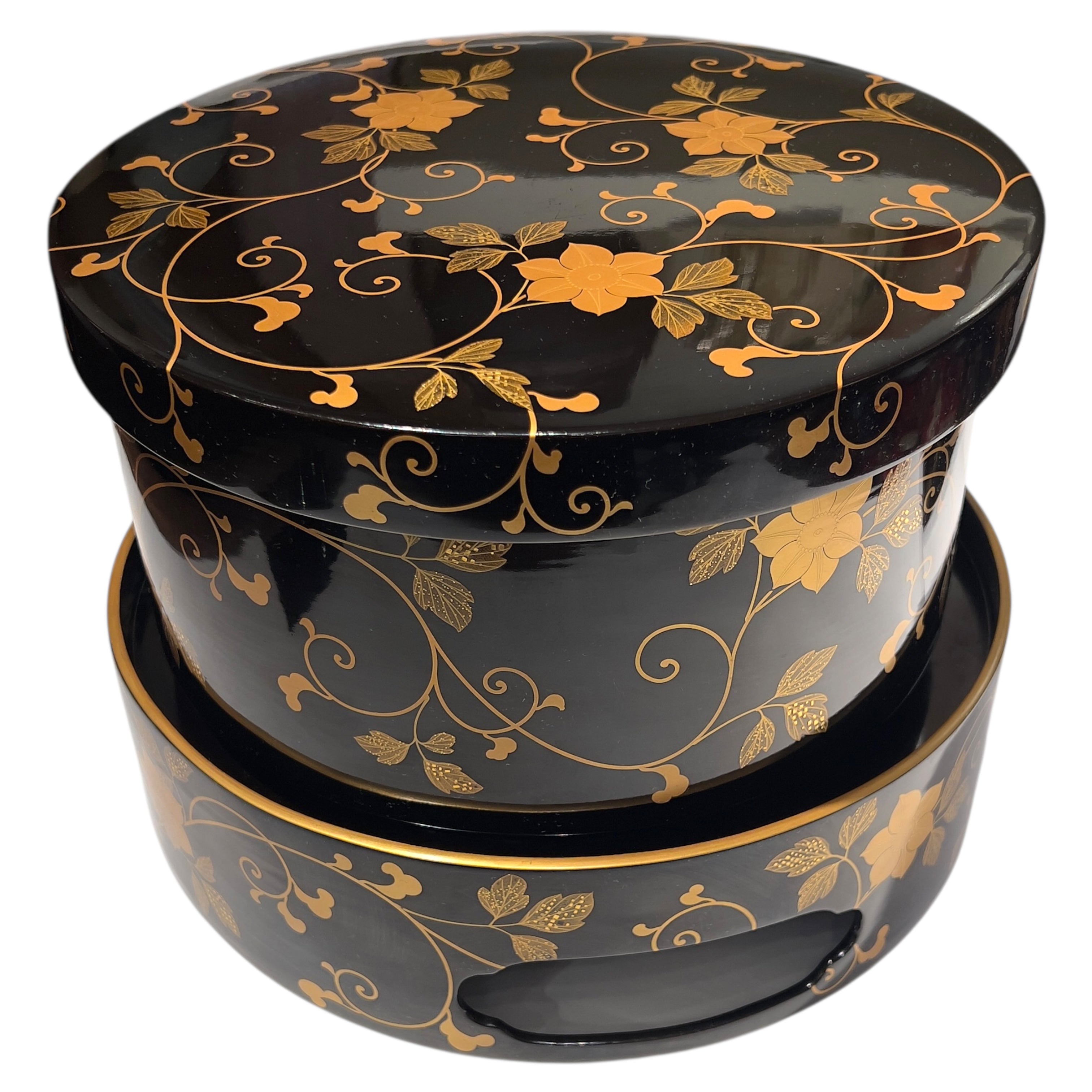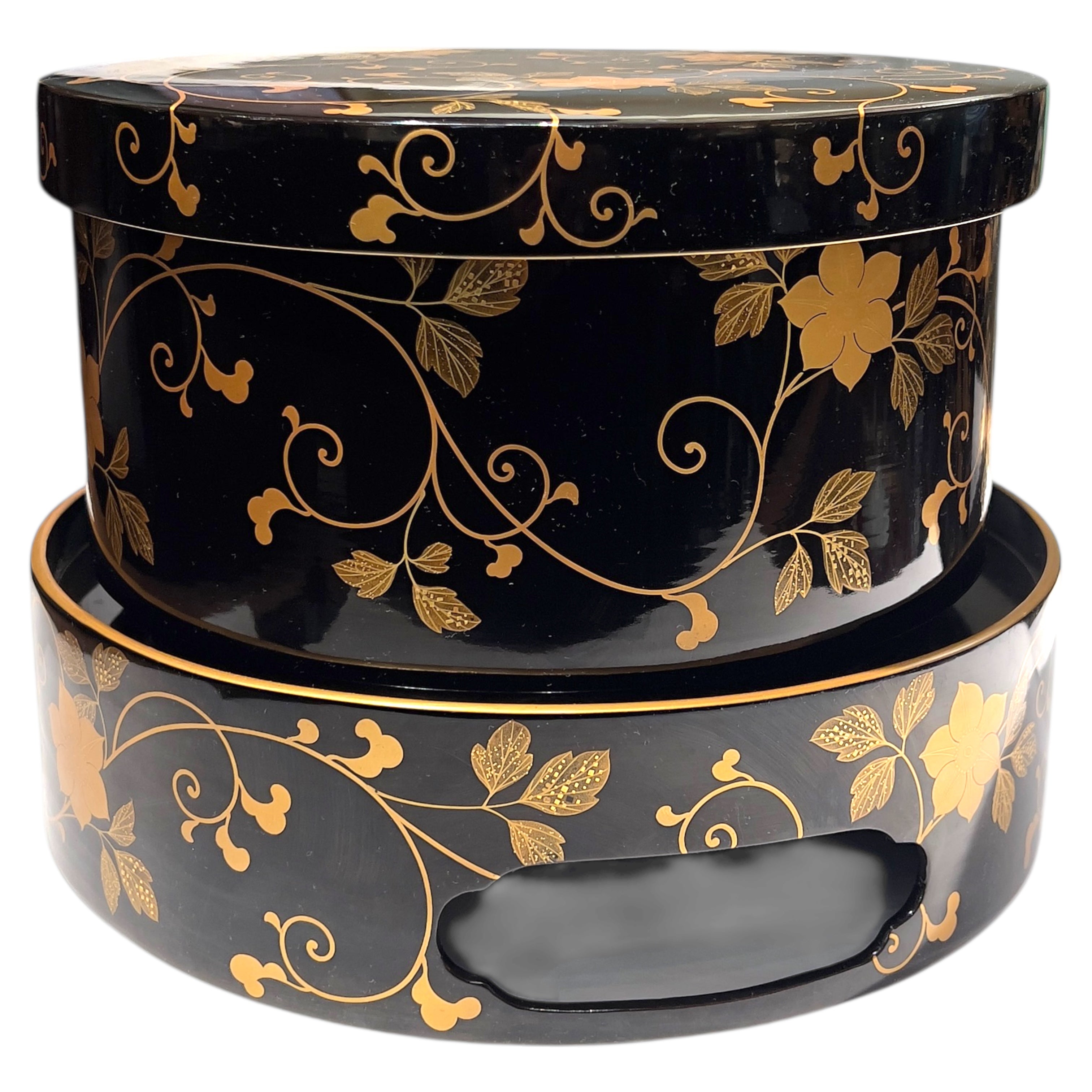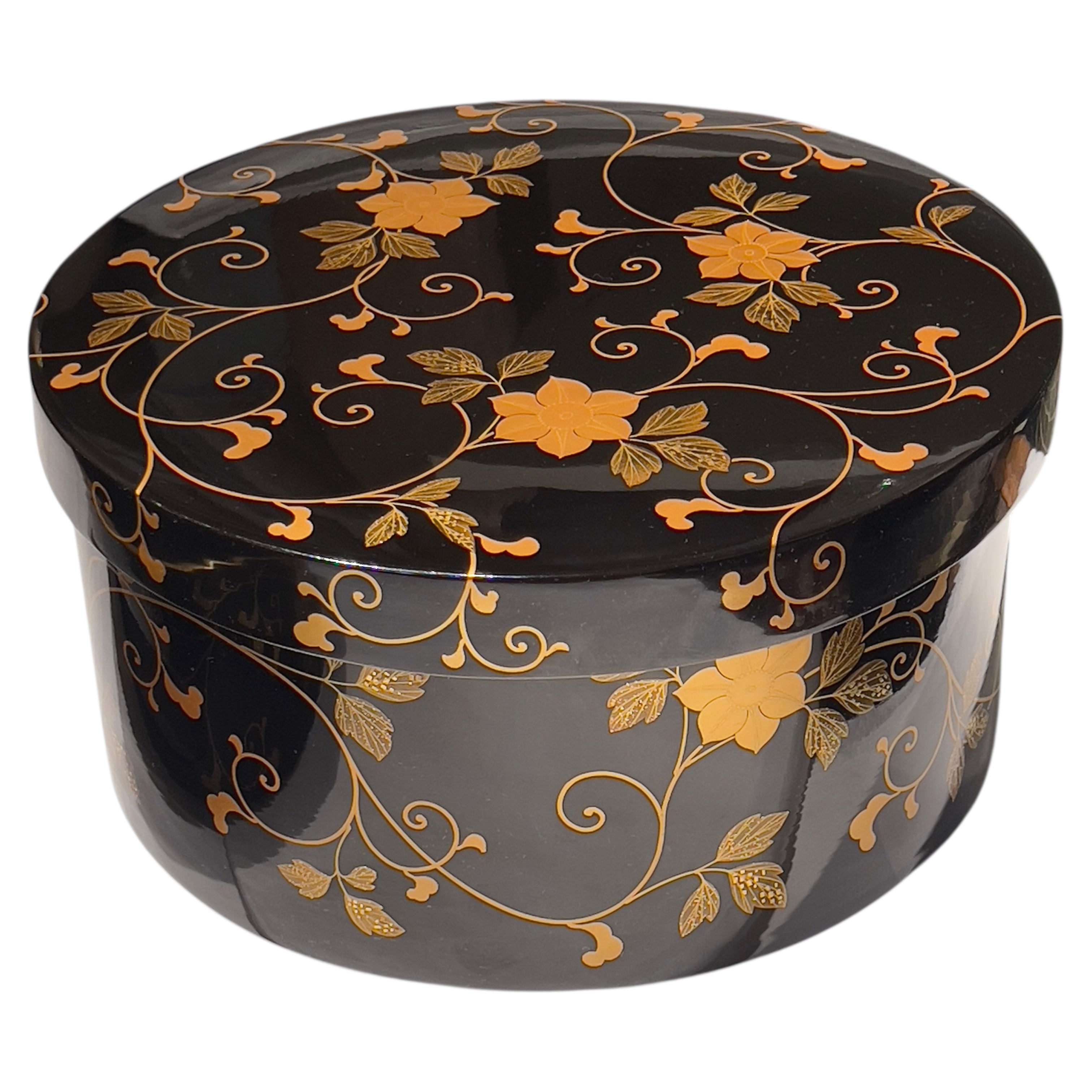 Boite ronde et son plateau de présentation, laque noire à décor de fleurs et volutes, Japon, vers 1930