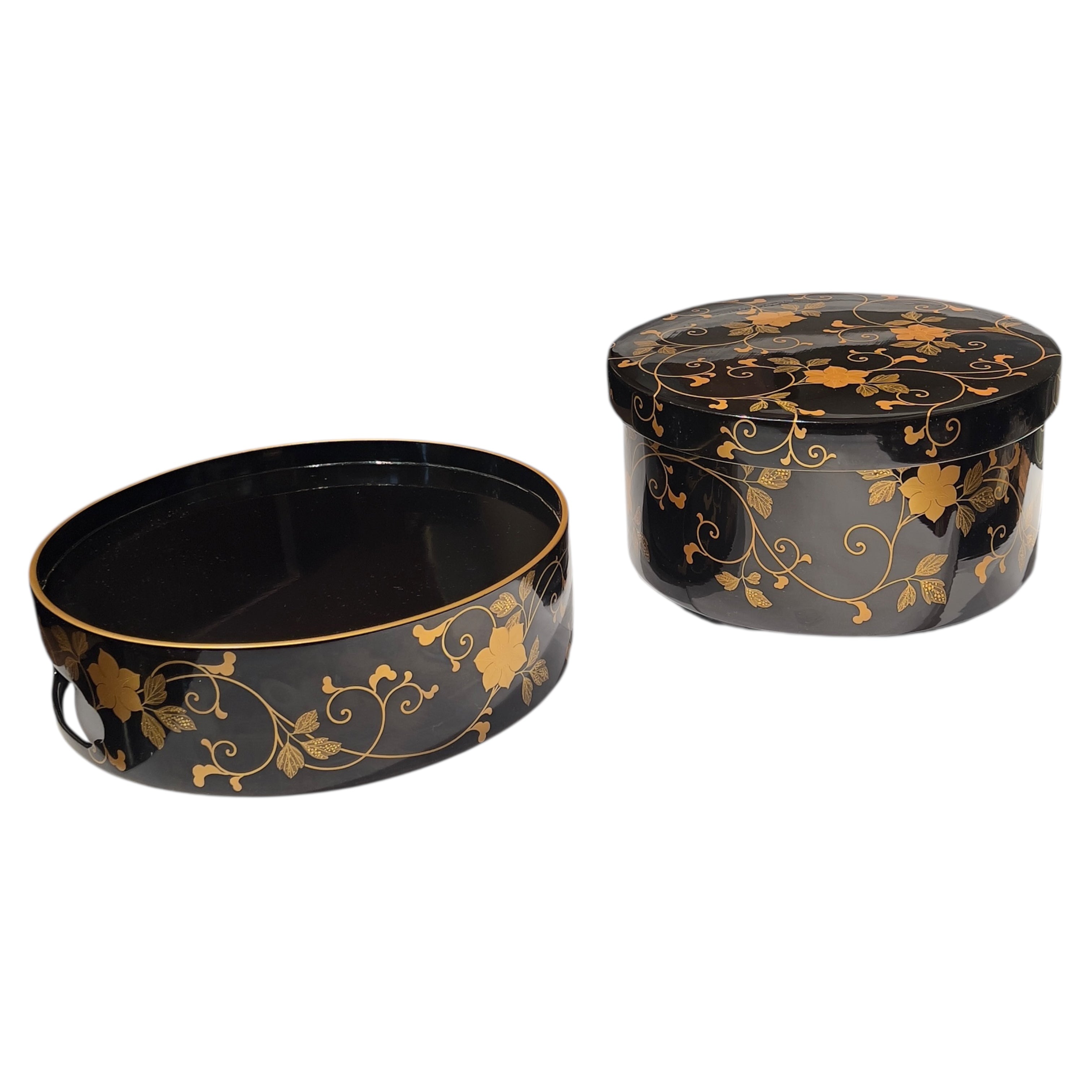 Boite ronde en laque, décor or et son plateau époque Taisho-Showa