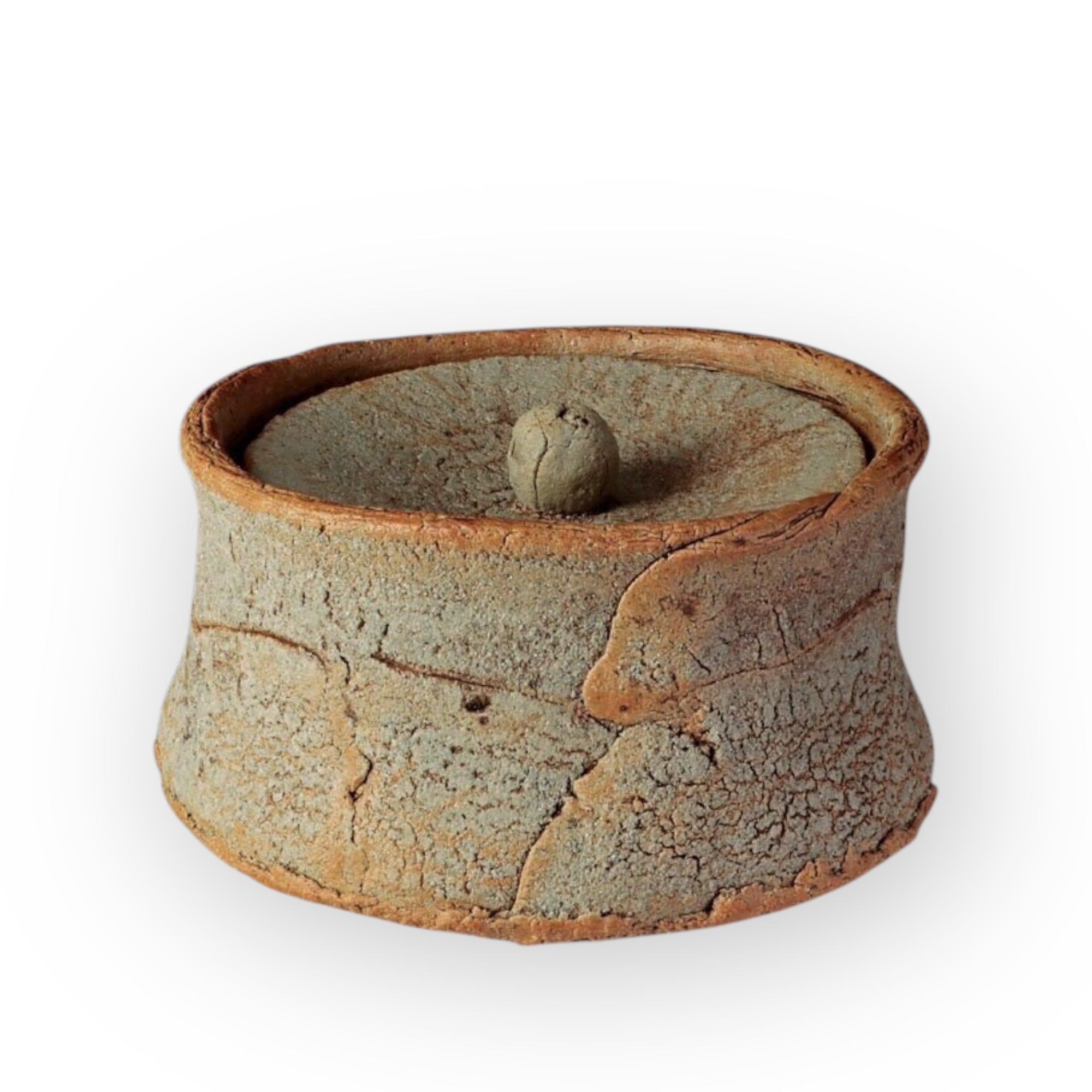 Ce pot à eau pour la cérémonie du thé, en grès, d'une forme ronde légèrement irrégulière et d'une surface granuleuse, incarne à merveille son approche. Les tons terreux, oscillant entre le gris et le brun rougeâtre, évoquent une connexion profonde avec les éléments naturels, tandis que les imperfections subtiles de la pièce témoignent d'une sensibilité unique à la texture et à la matière.