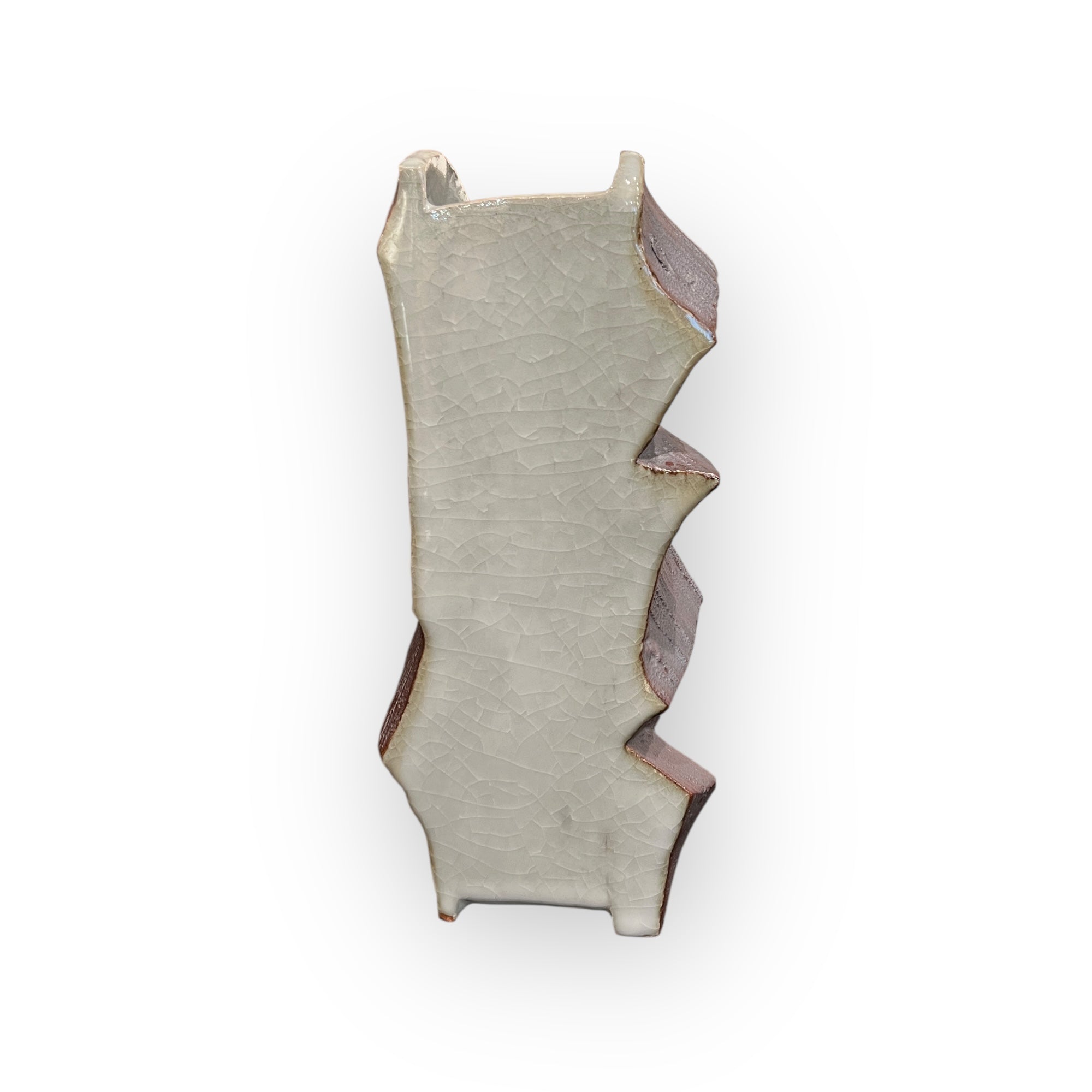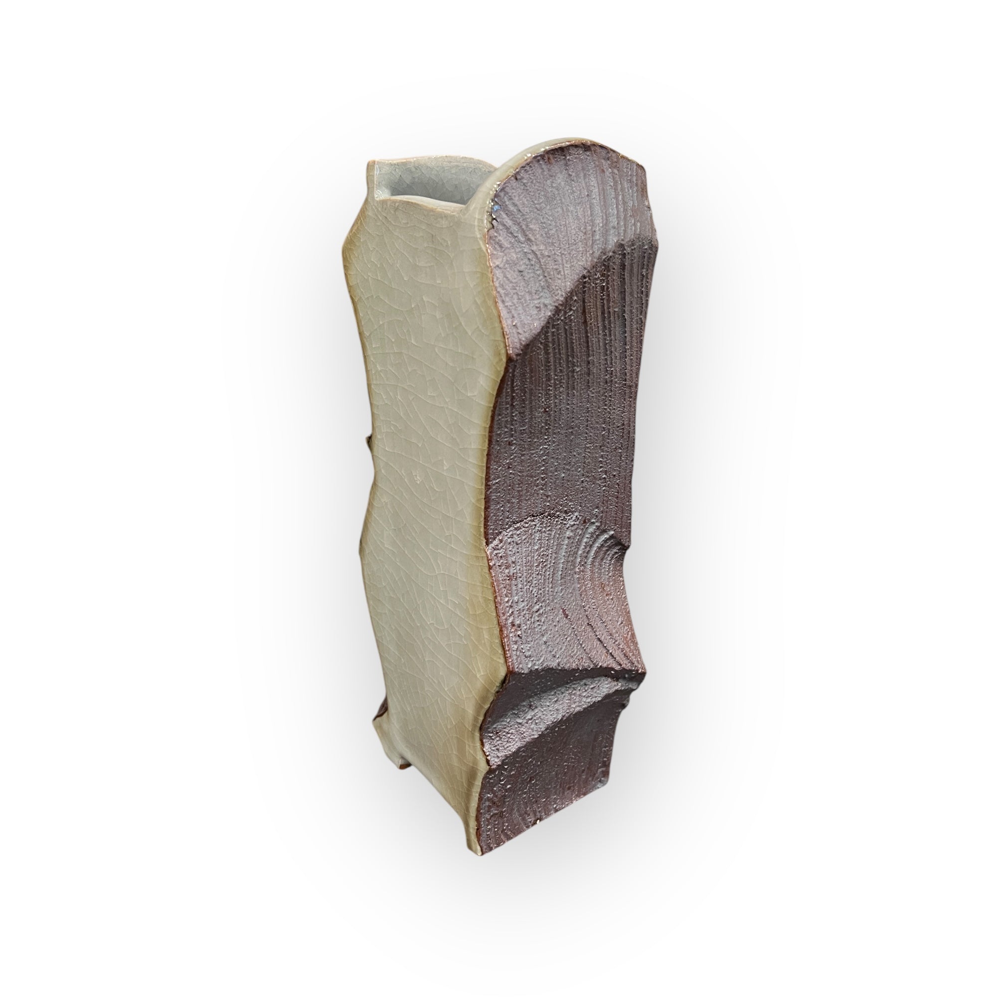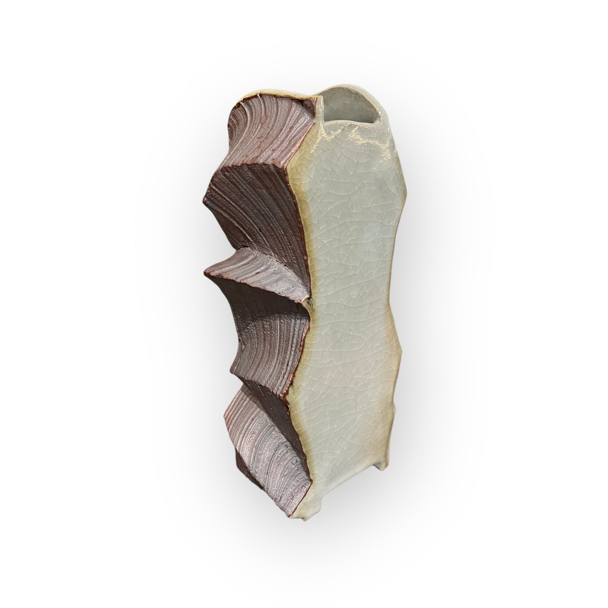 Ce vase en grès de Nariyoshi Jin (成良仁, 1942–2012) se distingue par sa forme architecturée et ses contrastes assumés. Les deux faces principales, plates, sont recouvertes d’une  glaçure céladon finement craquelée. Les côtés, quant à eux, sont bruts, découpés en biseau et marqués par les traces visibles de l’outil. Recouverts d’une glaçure mate brun-bordeaux, ils laissent apparaître un travail de texture net, presque incisif, qui rompt la douceur du céladon central. L’ensemble crée une tension visuelle maîtrisée, entre équilibre formel et brutalité du geste.