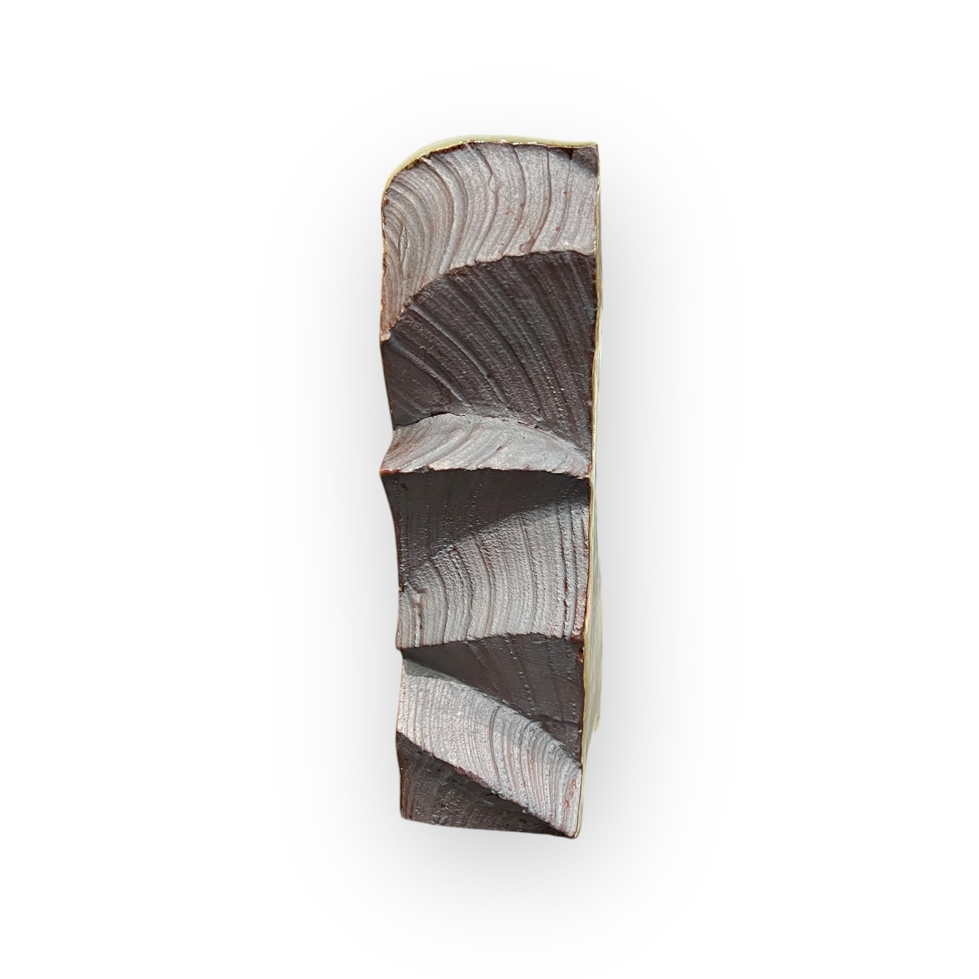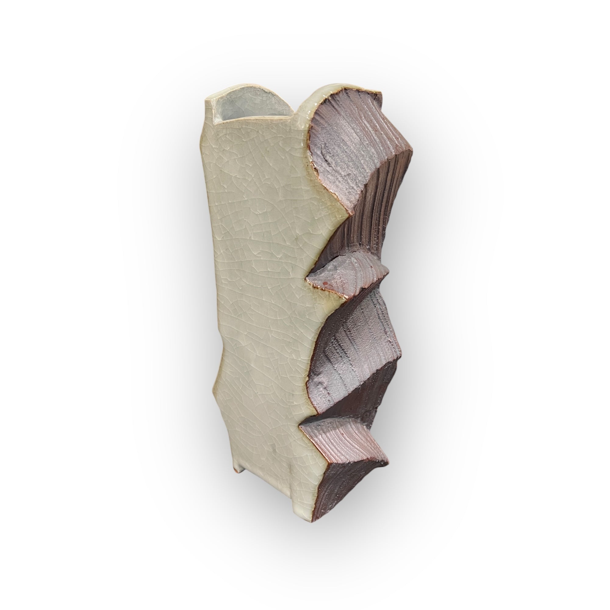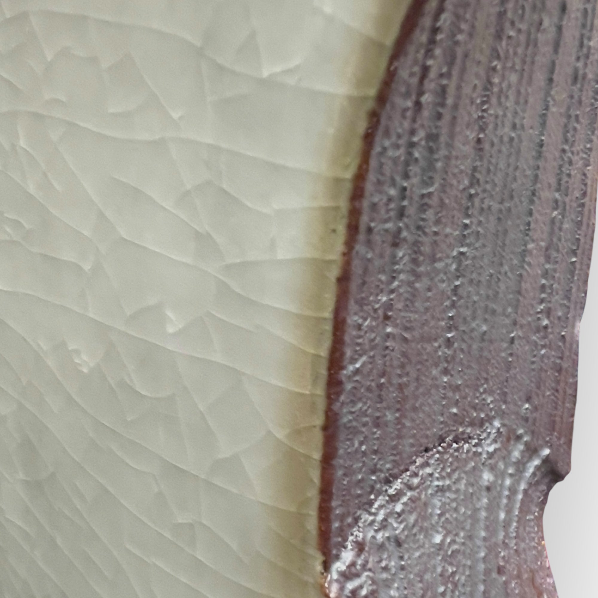 Ce vase en grès de Nariyoshi Jin (成良仁, 1942–2012) se distingue par sa forme architecturée et ses contrastes assumés. Les deux faces principales, plates, sont recouvertes d’une  glaçure céladon finement craquelée. Les côtés, quant à eux, sont bruts, découpés en biseau et marqués par les traces visibles de l’outil. Recouverts d’une glaçure mate brun-bordeaux, ils laissent apparaître un travail de texture net, presque incisif, qui rompt la douceur du céladon central. L’ensemble crée une tension visuelle maîtrisée, entre équilibre formel et brutalité du geste.