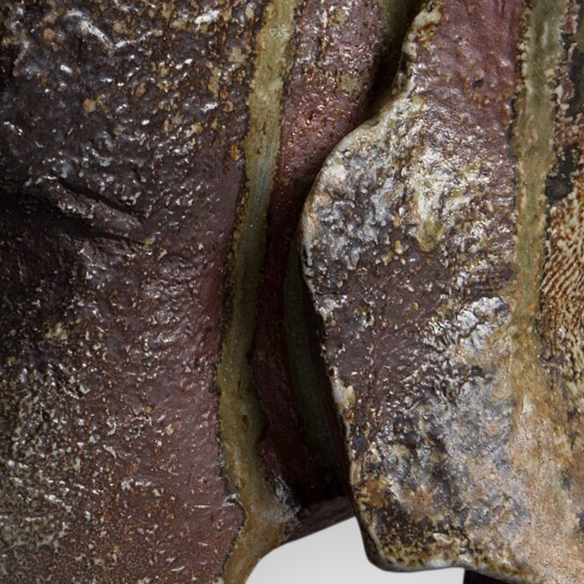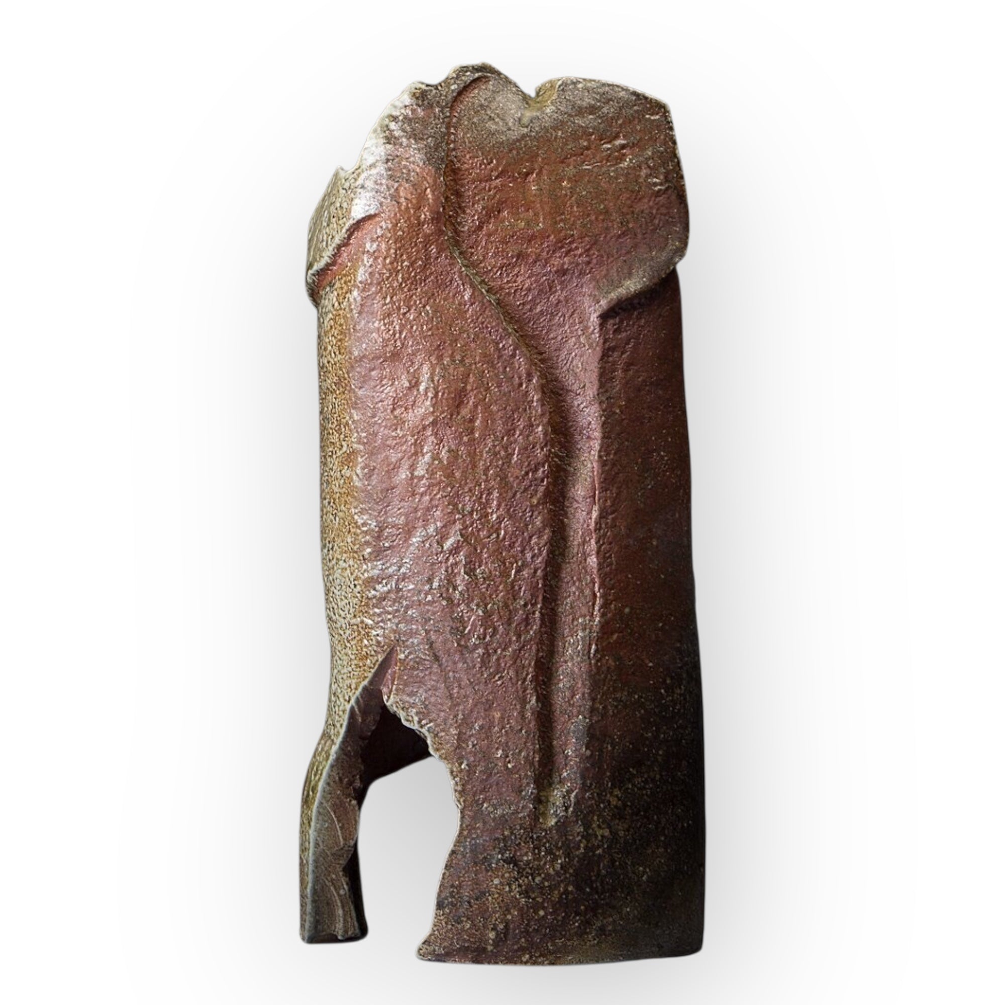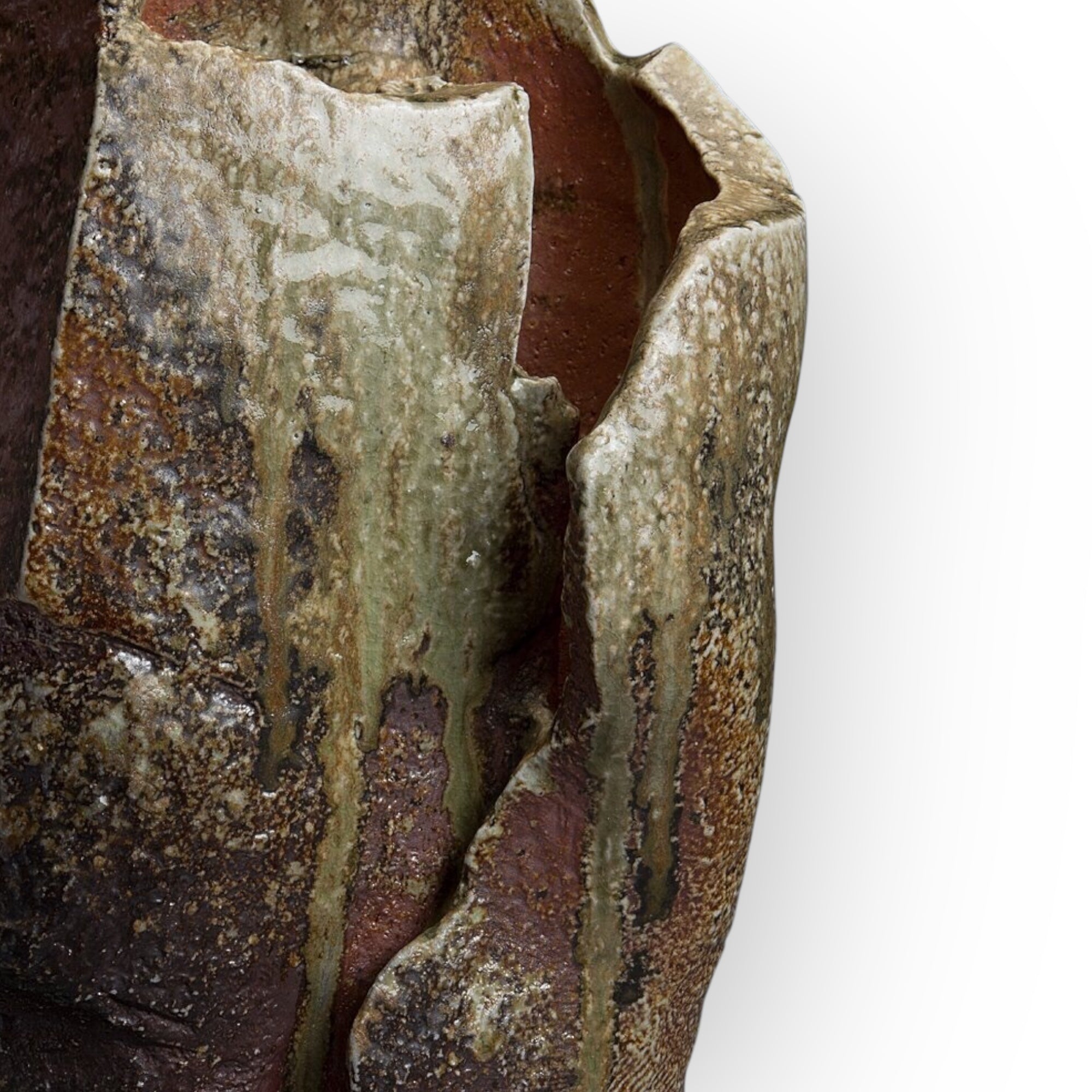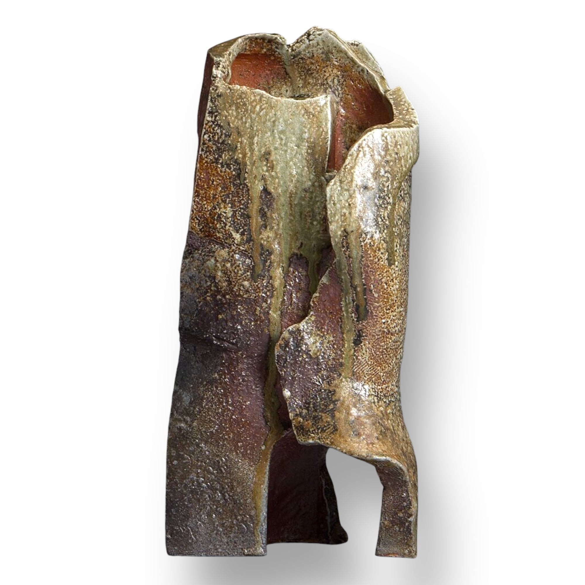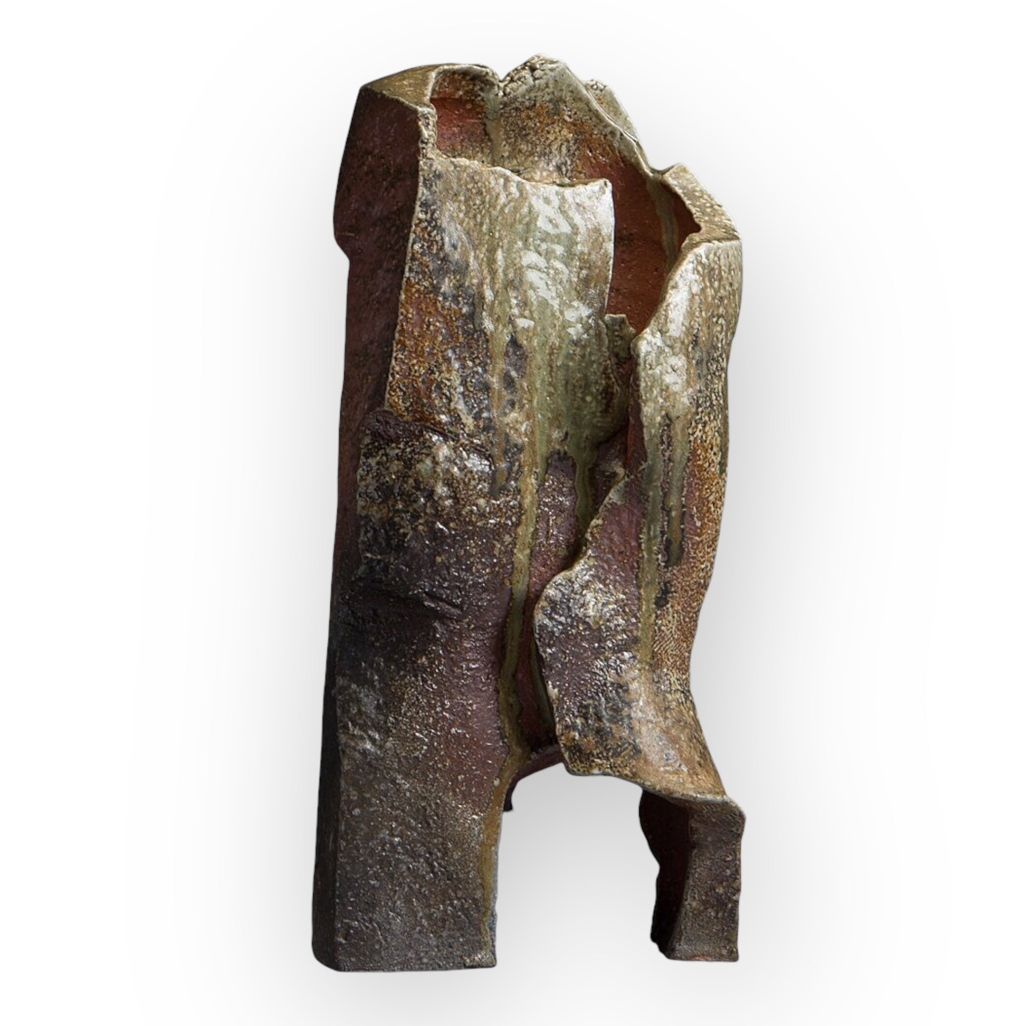 Ce vase sculptural en grès d’Iga se distingue par sa verticalité puissante et sa texture minérale. Modelé dans une terre dense, il présente des volumes fracturés et des arêtes pliées comme façonnées par l’érosion. La cuisson au bois lui confère une riche palette de nuances : rouge profond de l’argile, coulures vitrifiées verdâtres dites bidoro, traces noires de carbonisation et surfaces rugueuses marquées par les cendres. Chaque face révèle l’alchimie entre la flamme et la matière, donnant à l’œuvre une présence organique et monumentale.