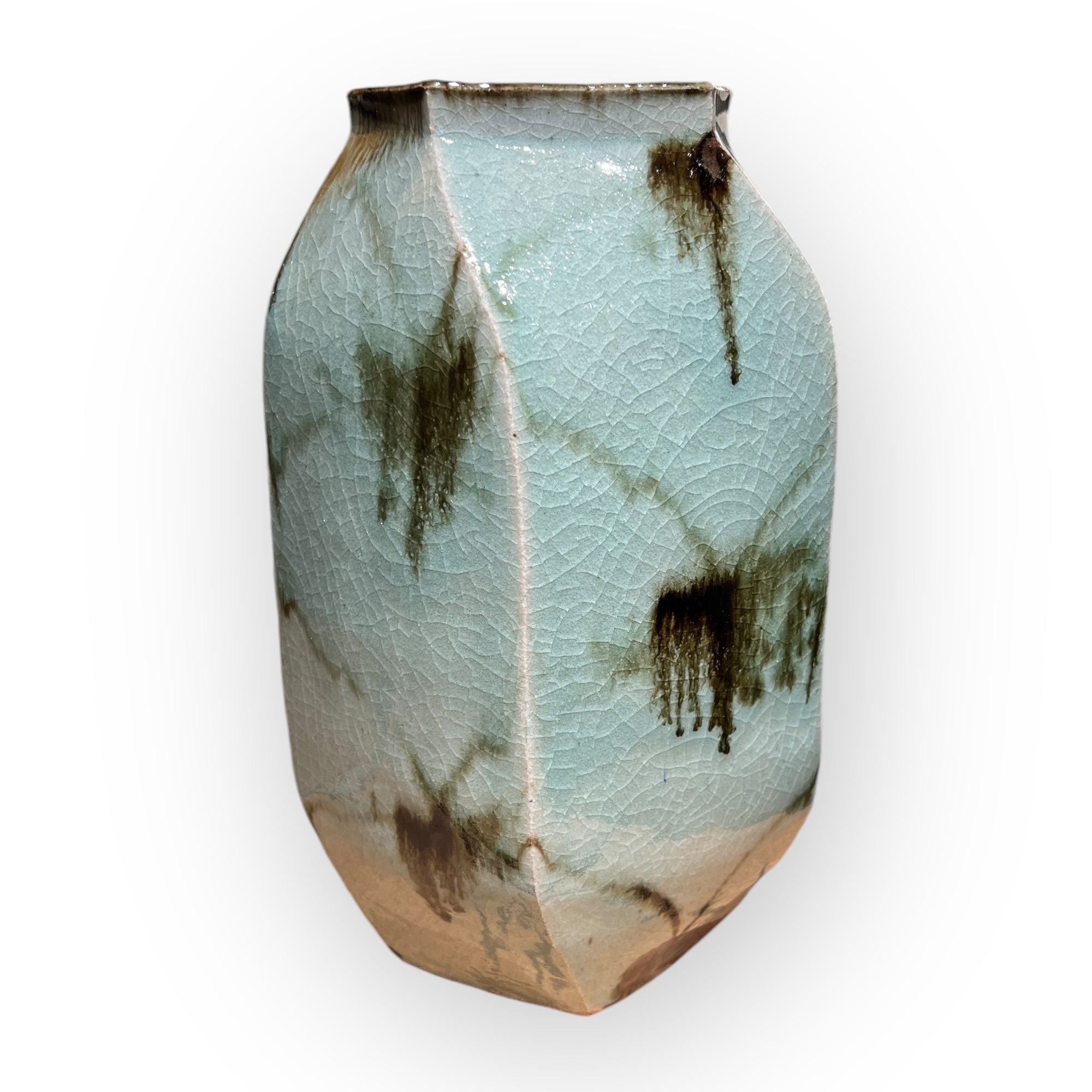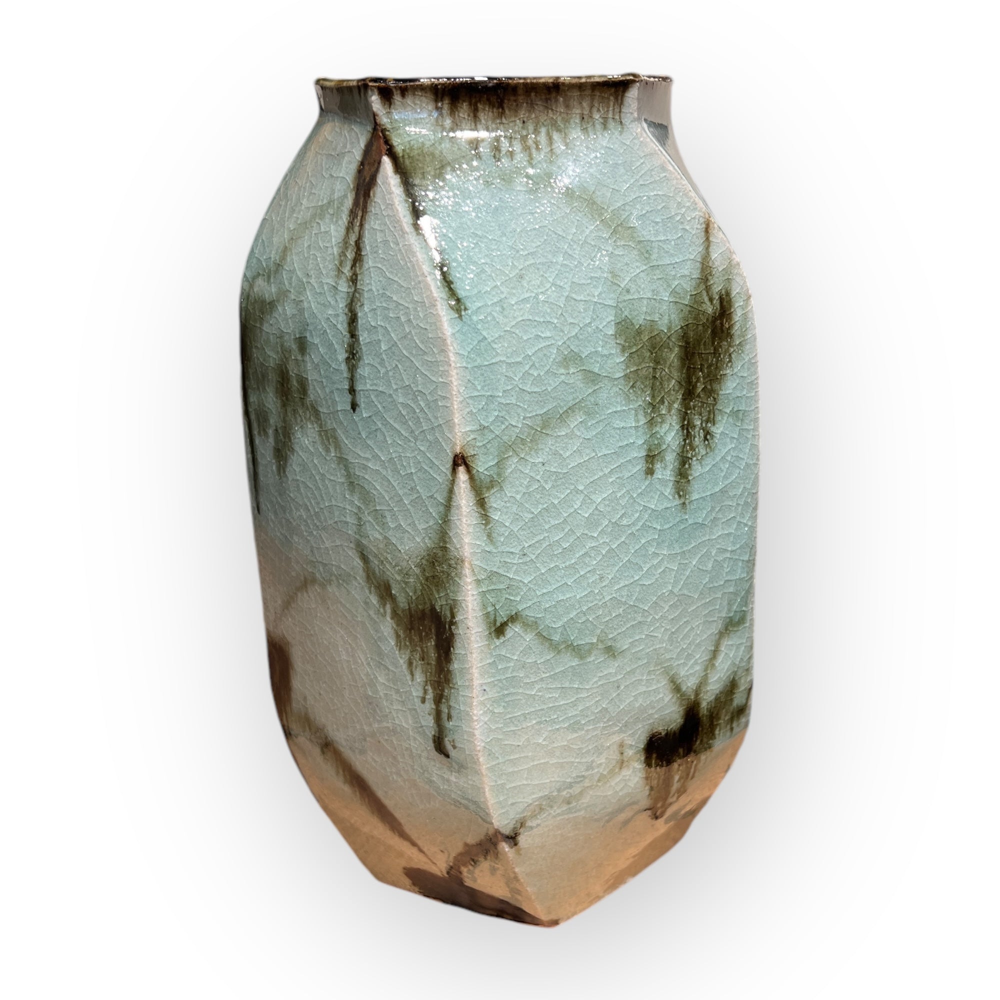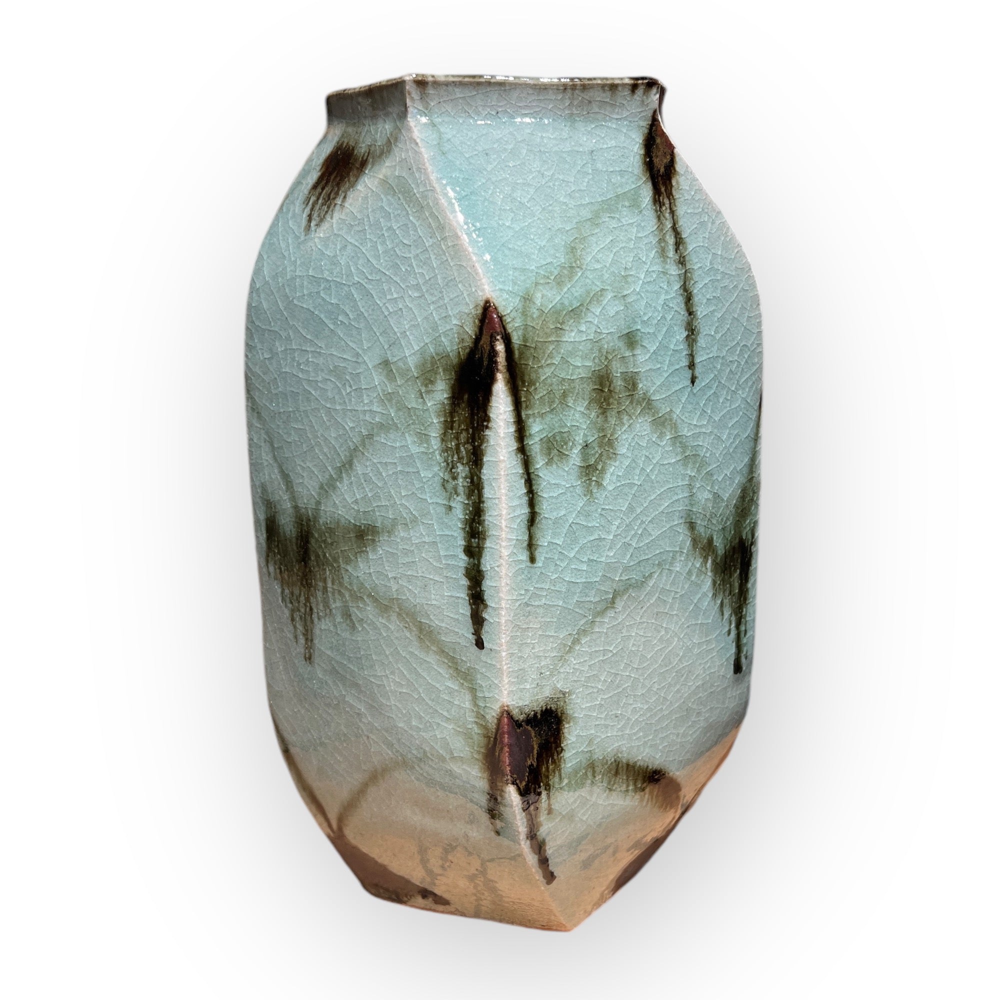 Membre régulier de la Société Japonaise des Arts et de l'Artisanat, Nariyoshi Jin se distinguait principalement par ses techniques de glaçure au fer et de chanfreinage comme en témoigne ce vase.