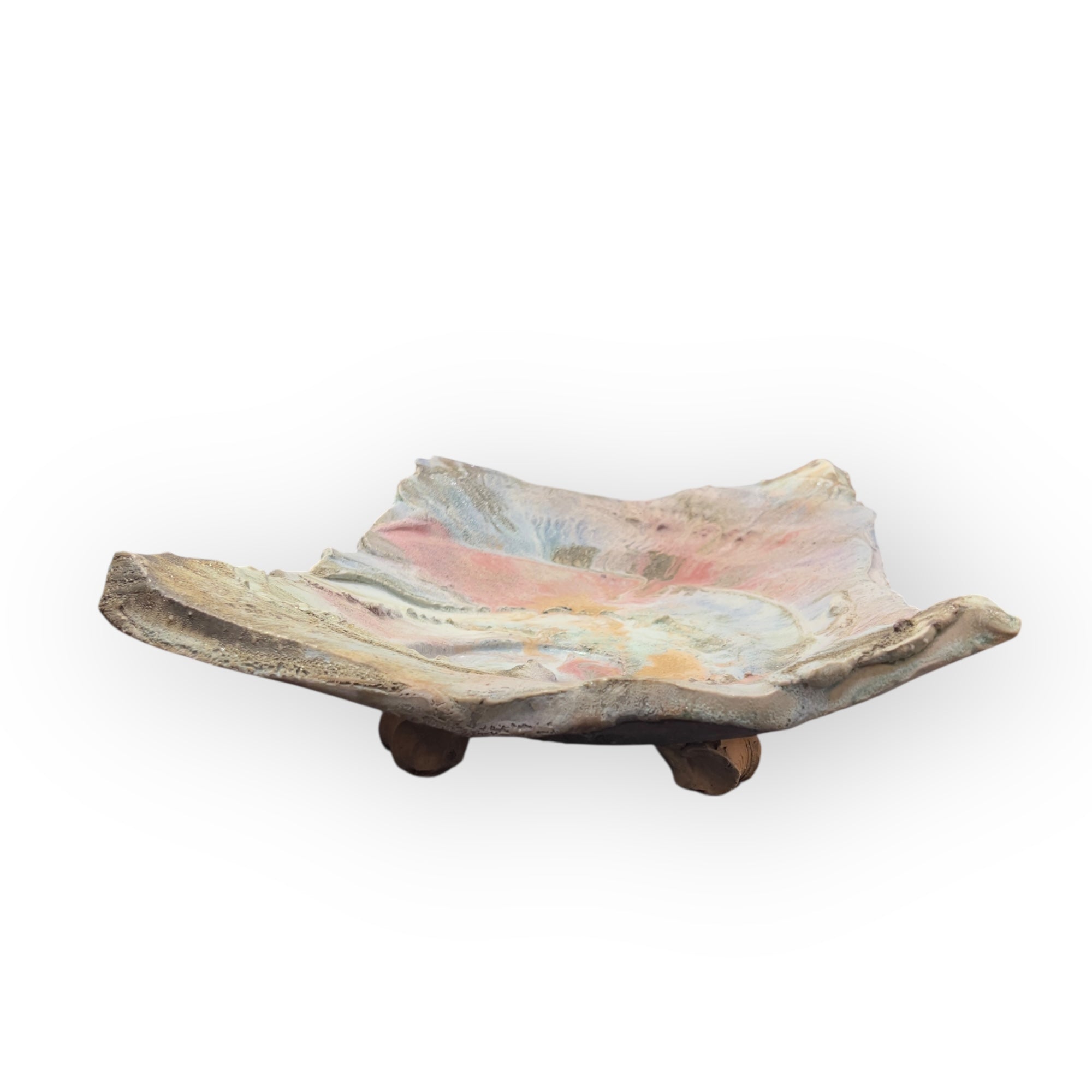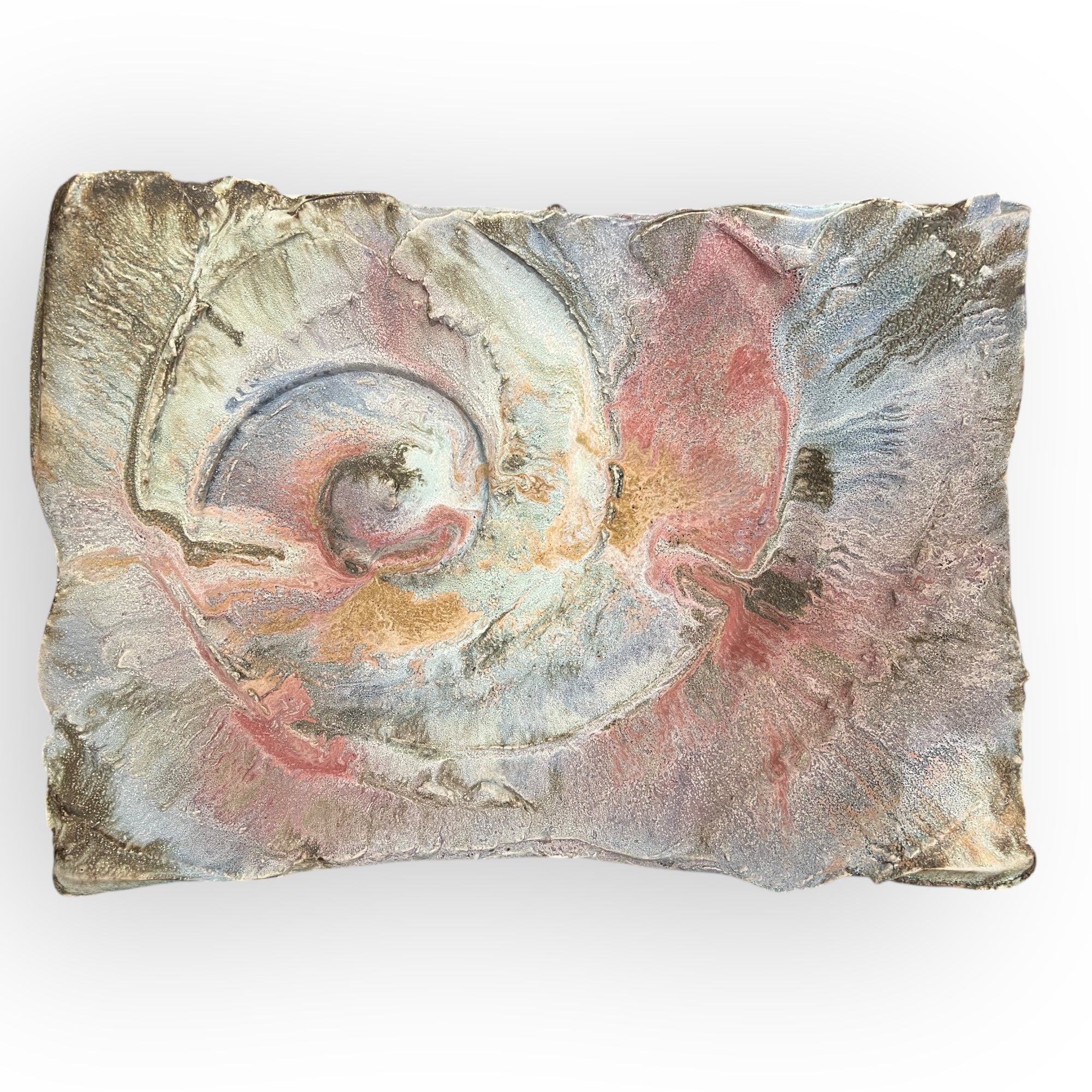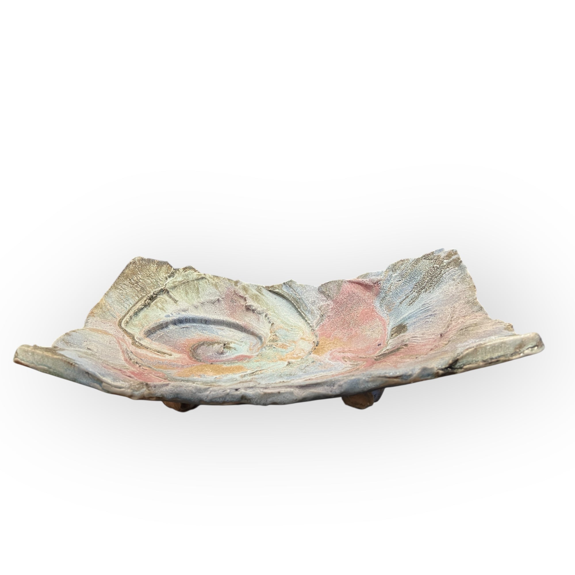 Grand plat spectaculaire en glaçure manyosai, reposant sur quatre pieds. Le mouvement de la terre façonnée en spirale et les couleurs inimitables en font une œuvre emblématique de Hayashi Shotaro.