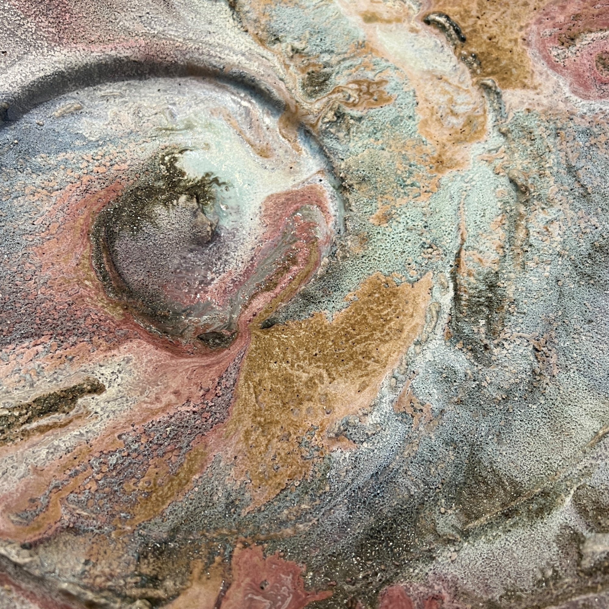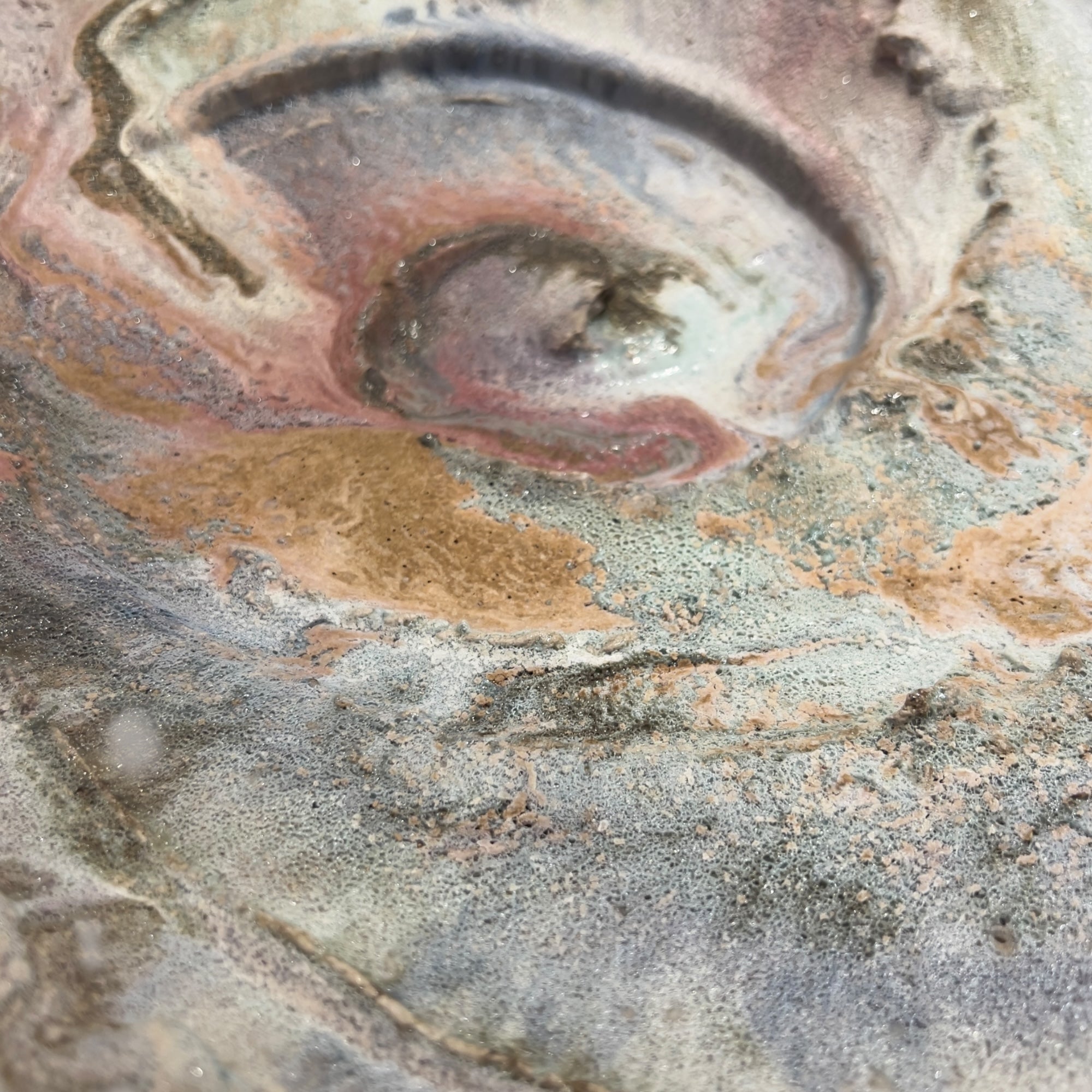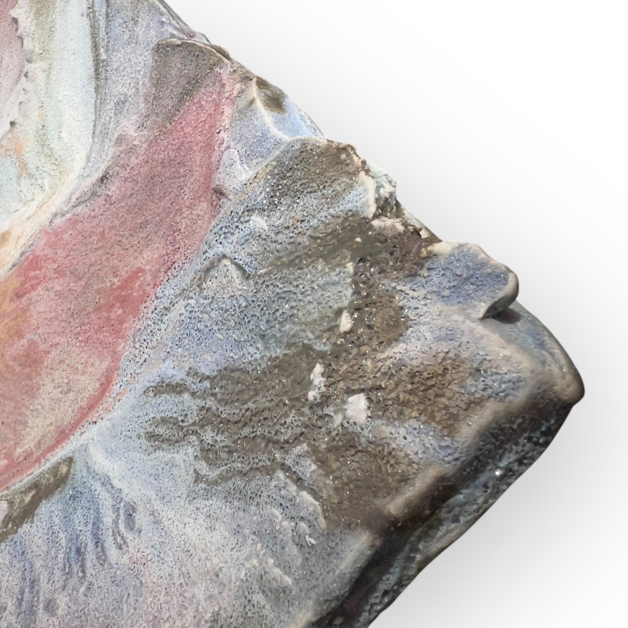 Grand plat spectaculaire en glaçure manyosai, reposant sur quatre pieds. Le mouvement de la terre façonnée en spirale et les couleurs inimitables en font une œuvre emblématique de Hayashi Shotaro.