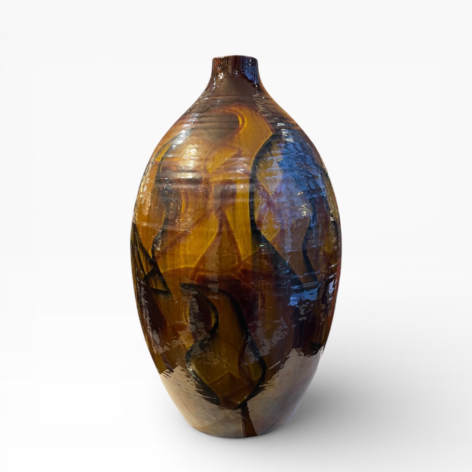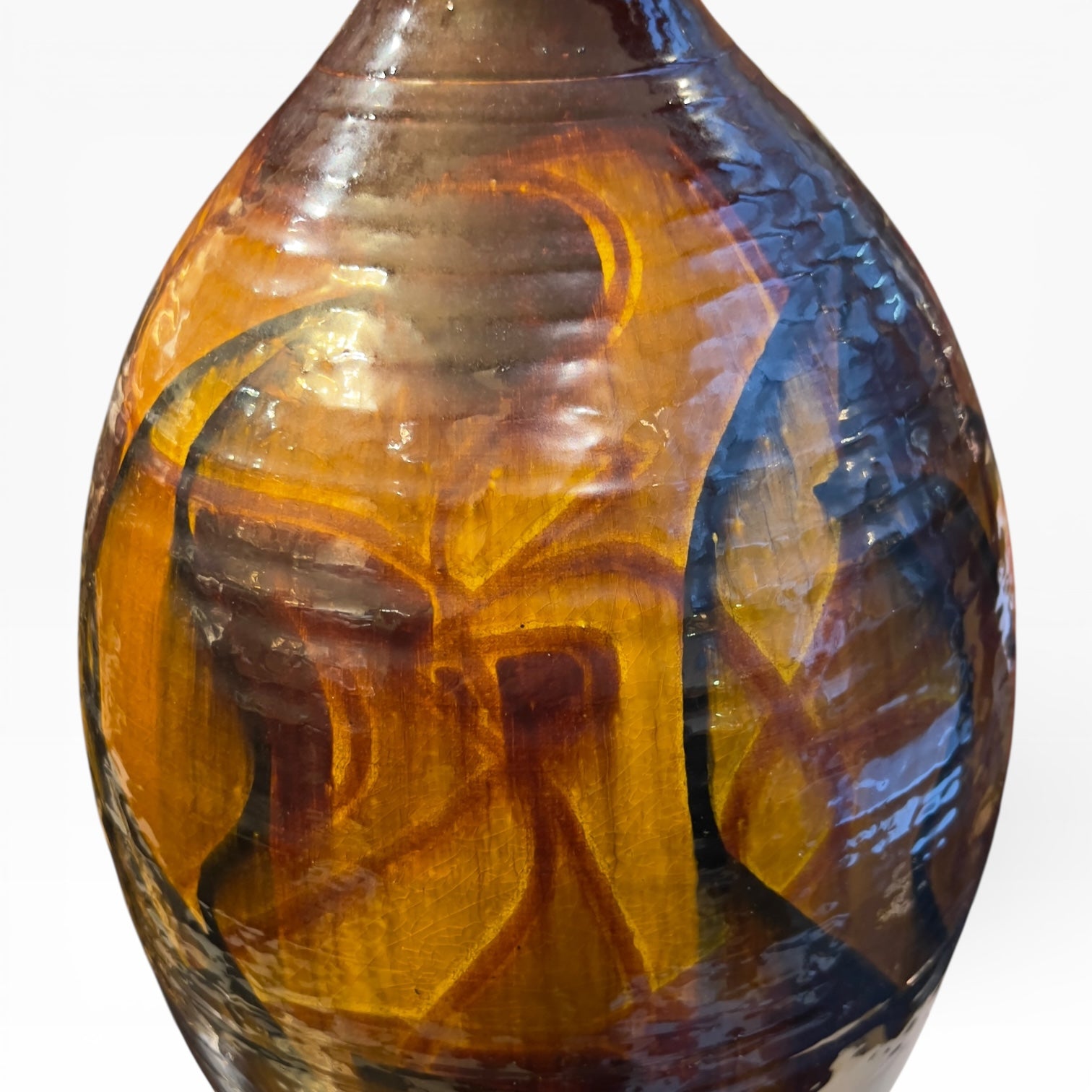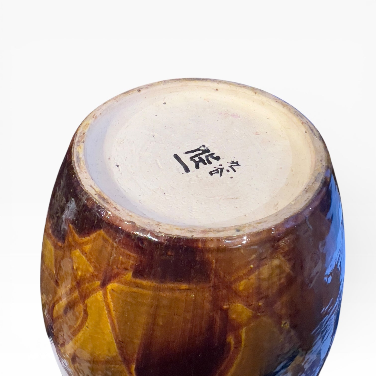 Grand vase ovoïde à petit col, en céramique japonaise de Kutani, couvert d’un émail aux tonalités miel, animé par de larges réserves ambrées et des accents plus sombres qui structurent le décor. L’ornementation évoque une volée d’oiseaux stylisés, traitée de manière synthétique, en aplats et passages de couleur plutôt qu’en dessin naturaliste, ce qui donne une présence très contemporaine à une pièce pourtant ancrée dans l’univers Kutani. Le dessous est laissé en biscuit et porte une signature peinte indiquant « Kutani » et le nom d’artiste « Saichi ».