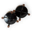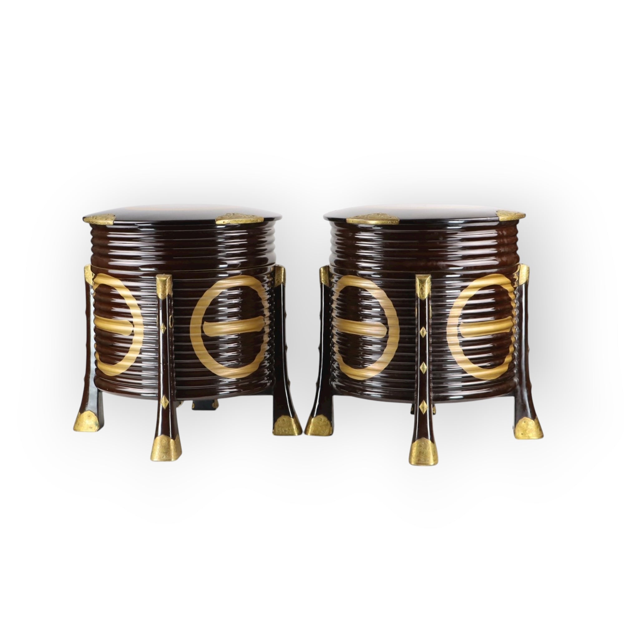 Paire de boîtes japonaises en laque brun noir, de forme cylindrique nervurée, reposant sur quatre pieds également laqués. Chacune est ornée sur ses flancs et sur le dessus du couvercle du kamon (emblème héraldique) de la famille Ichijō, représenté par le caractère « 一 » (ichi, “un”) inscrit dans un cercle (Ichimonji maru). Ce motif d’une grande sobriété symbolise l’unité et la droiture, valeurs associées à cette lignée issue du puissant clan Fujiwara.