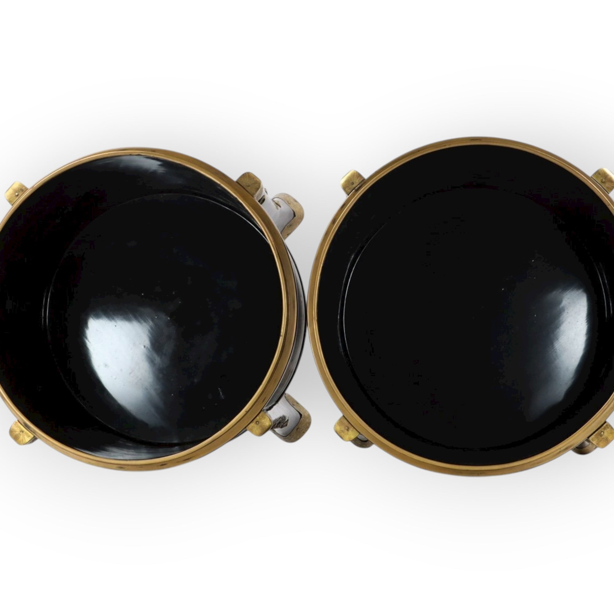 Le décor est complété d’une ornementation en laiton gravé et doré à motifs de volutes fleuries, qui renforce les pieds, le pourtour des couvercles et certaines parties du corps. Ces ferrures, finement exécutées, intègrent également le kamon au centre des volutes, créant un dialogue subtil entre métal doré et laque sombre. L’ensemble conserve son équilibre d’origine et une brillance intacte, avec seulement quelques traces d’usage discrètes, caractéristiques d’un objet de cour du début du XIXᵉ siècle.