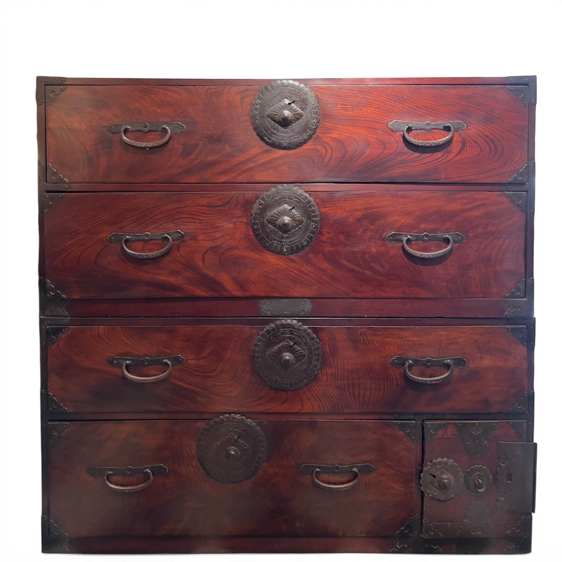 La façade est animée par un veinage spectaculaire, aux ondes larges et profondes, qui donne au bois une vibration presque picturale. Cette richesse du dessin naturel contraste avec la rigueur de la construction. Les quatre grands tiroirs occupent l’essentiel de la composition : deux tiroirs hauts dans la partie supérieure, puis un grand tiroir et un tiroir plus bas dans la partie inférieure. À droite, un petit compartiment fermé par une porte découvre deux tiroirs intérieurs, disposition caractéristique des tansu de rangement pensés pour organiser le linge et les effets personnels.