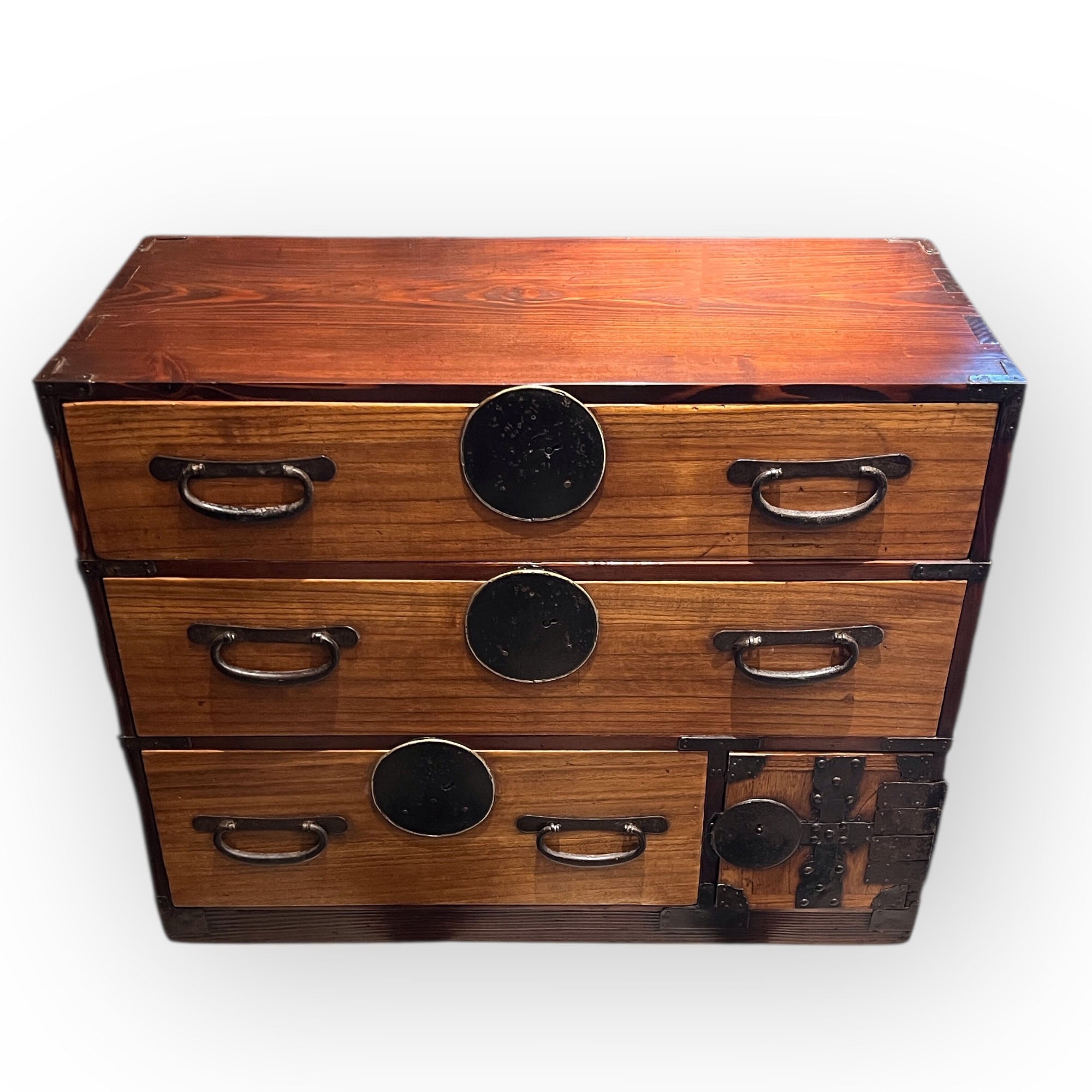 Charmant petit tansu japonais de la fin du XIXe siècle, réalisé en paulownia (kiri) et cèdre, deux essences traditionnellement employées pour leur légèreté et leur résistance naturelle aux insectes. Le meuble, de 64,8 cm de hauteur, 80 cm de longueur et 37 cm de profondeur, présente une composition équilibrée et fonctionnelle typique des petits meubles utilitaires japonais.
