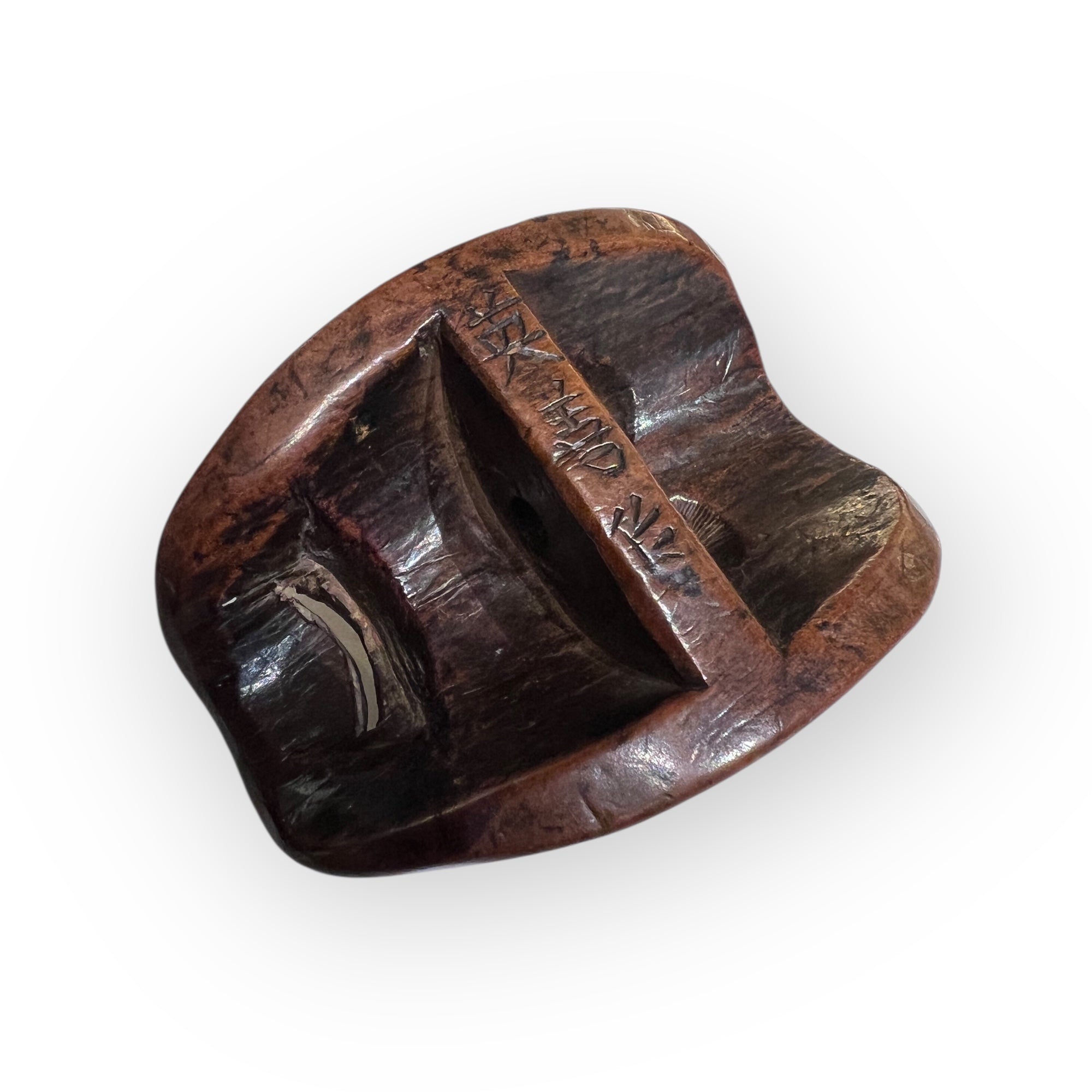 Le bois, probablement du buis (tsuge), présente une patine chaude et satinée, témoignant d’un long usage. L’intérieur révèle une sculpture soignée, avec himotoshi percé et barre dorsale signée 英善作 (Eizen saku), “fait par Eizen”.
