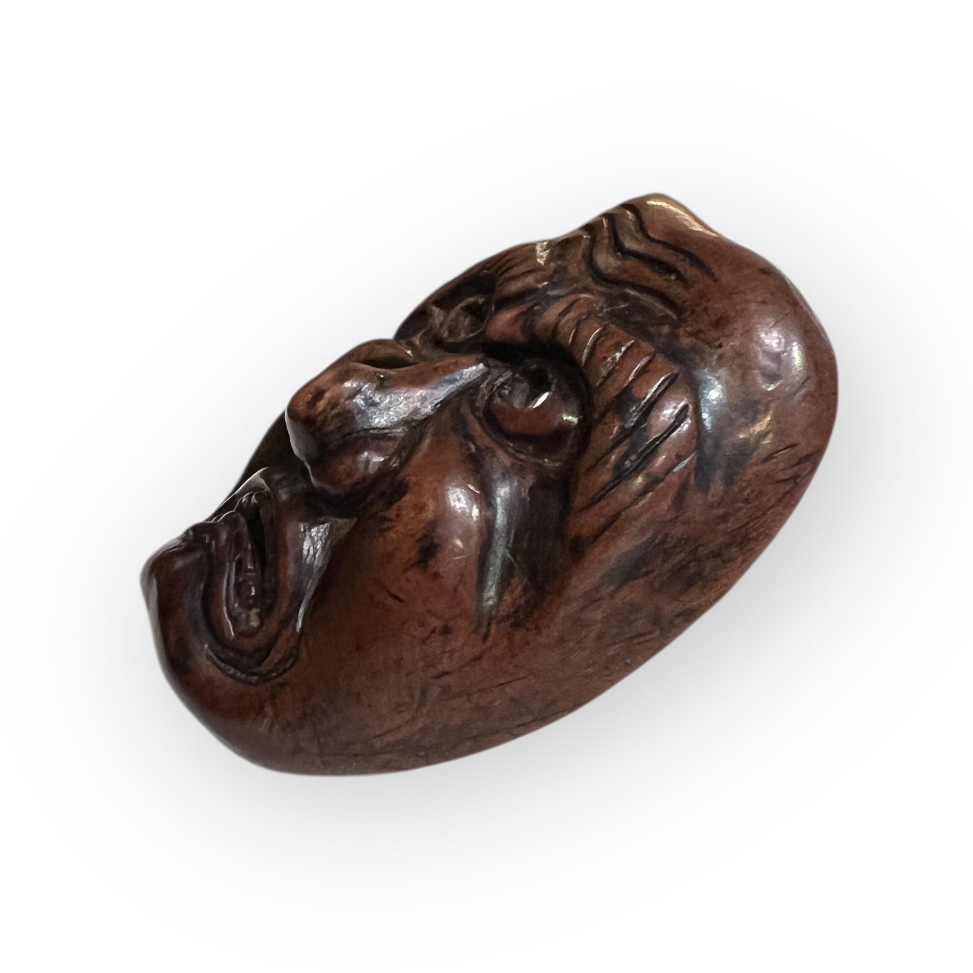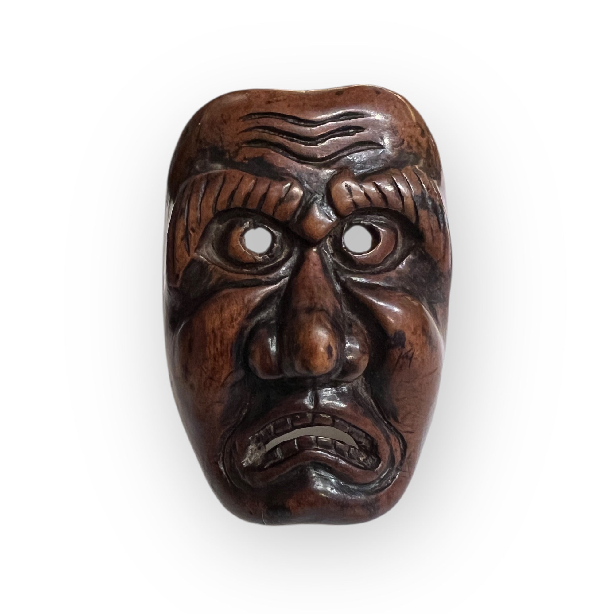 Netsuke japonais en bois sculpté représentant un masque d’homme âgé au visage grimaçant, inspiré des personnages du théâtre Nô. Le visage, puissamment modelé, exprime une tension dramatique : front plissé, arcades sourcilières proéminentes, nez saillant et bouche entrouverte sur un rictus de colère. L’expression est maîtrisée avec une force sobre, typique des œuvres de la fin d’époque Edo (XIXᵉ siècle).