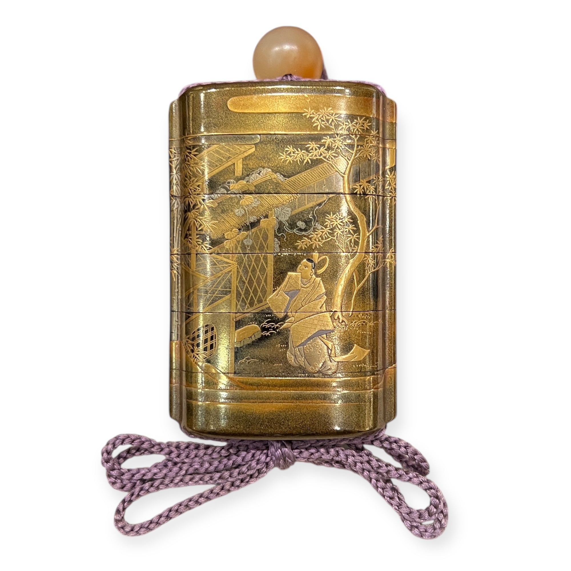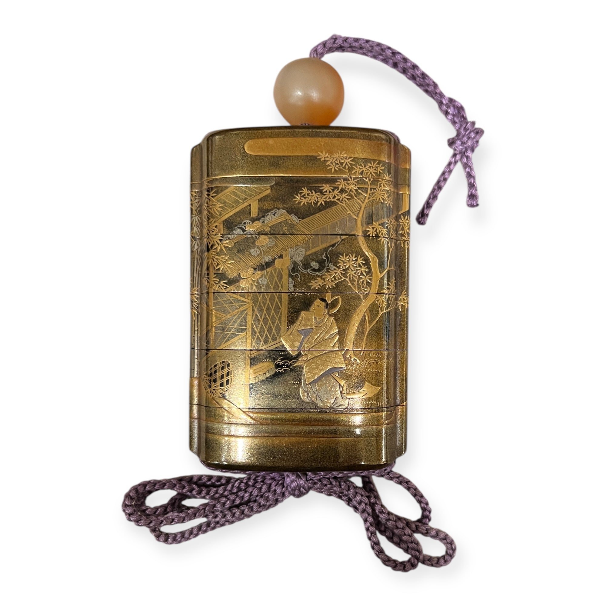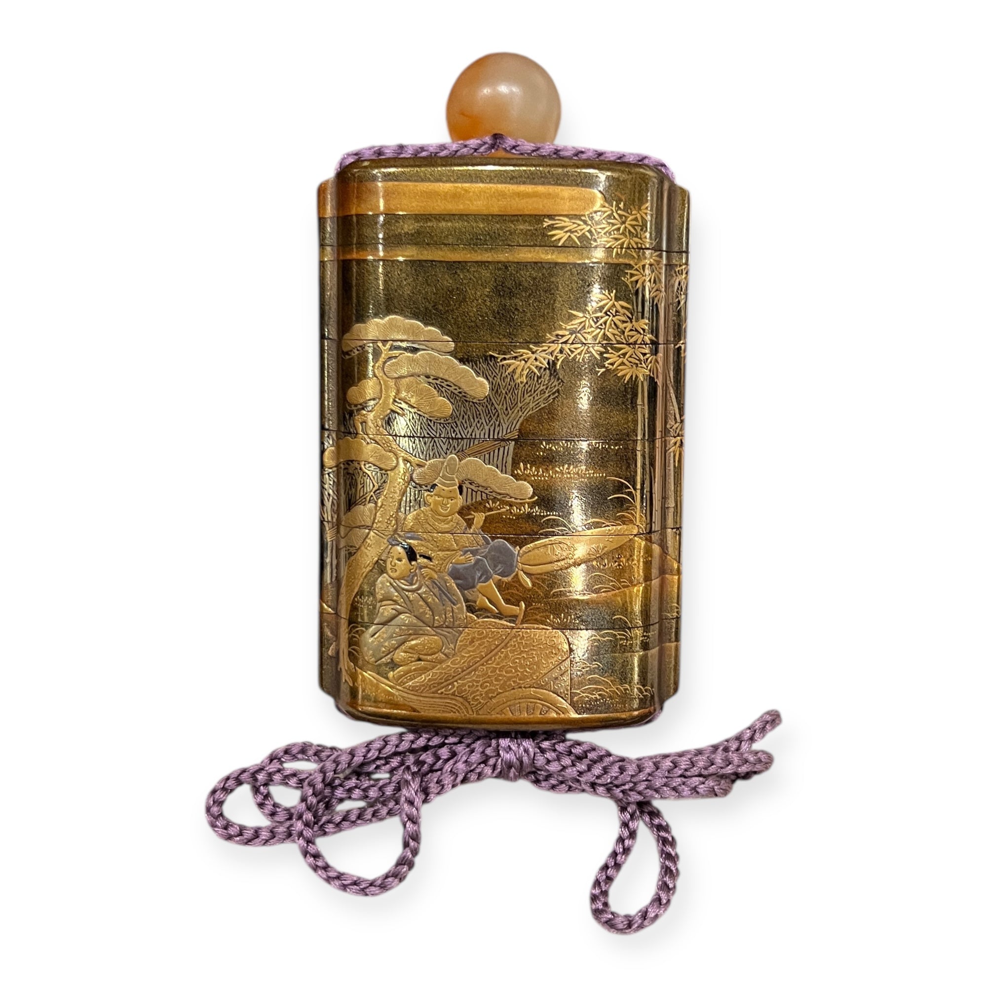 Inro àcinq cases signé Yoyusai, réalisé dans la première moitié du XIXe siècle par Hara Yoyusai (1769–1845), maître de la laque de l’époque Edo. Cette pièce raffinée, haute de 8 cm, s’inscrit dans la tradition de l’art des inr?, conjuguant une virtuosité technique à une sensibilité narrative délicate.