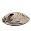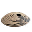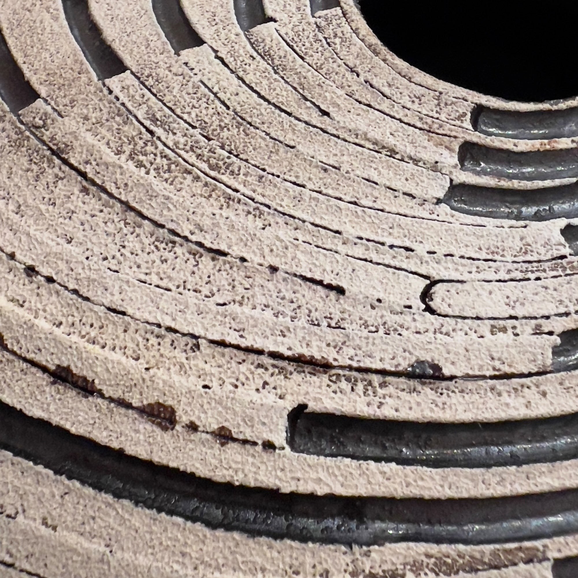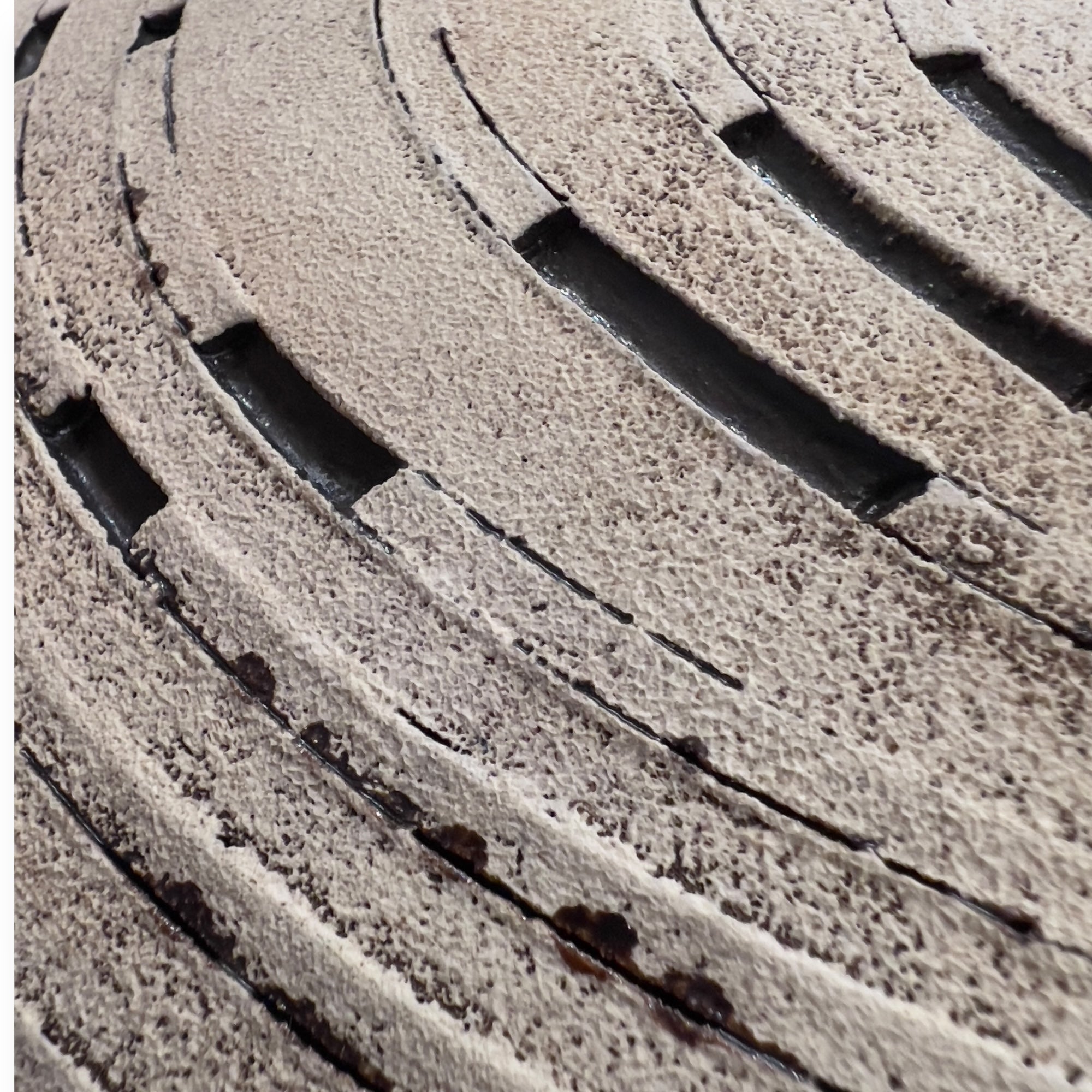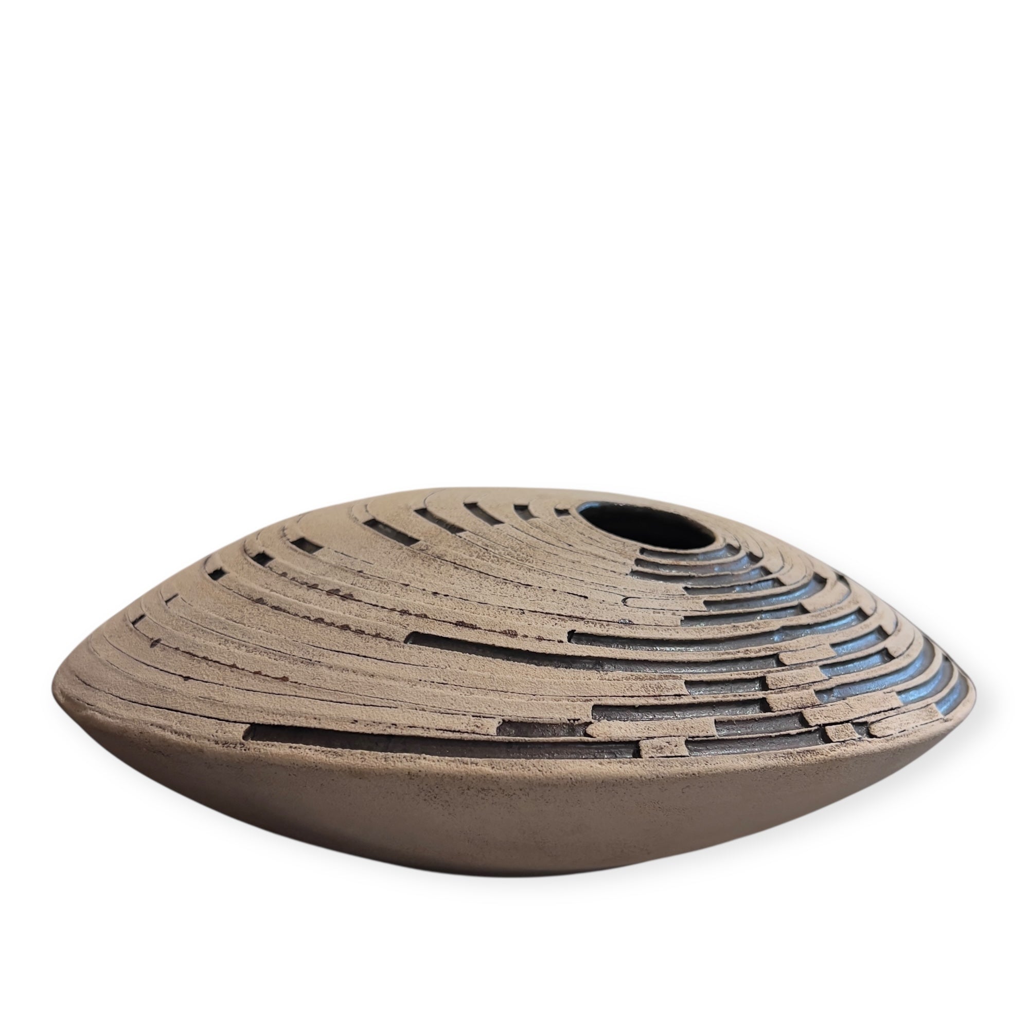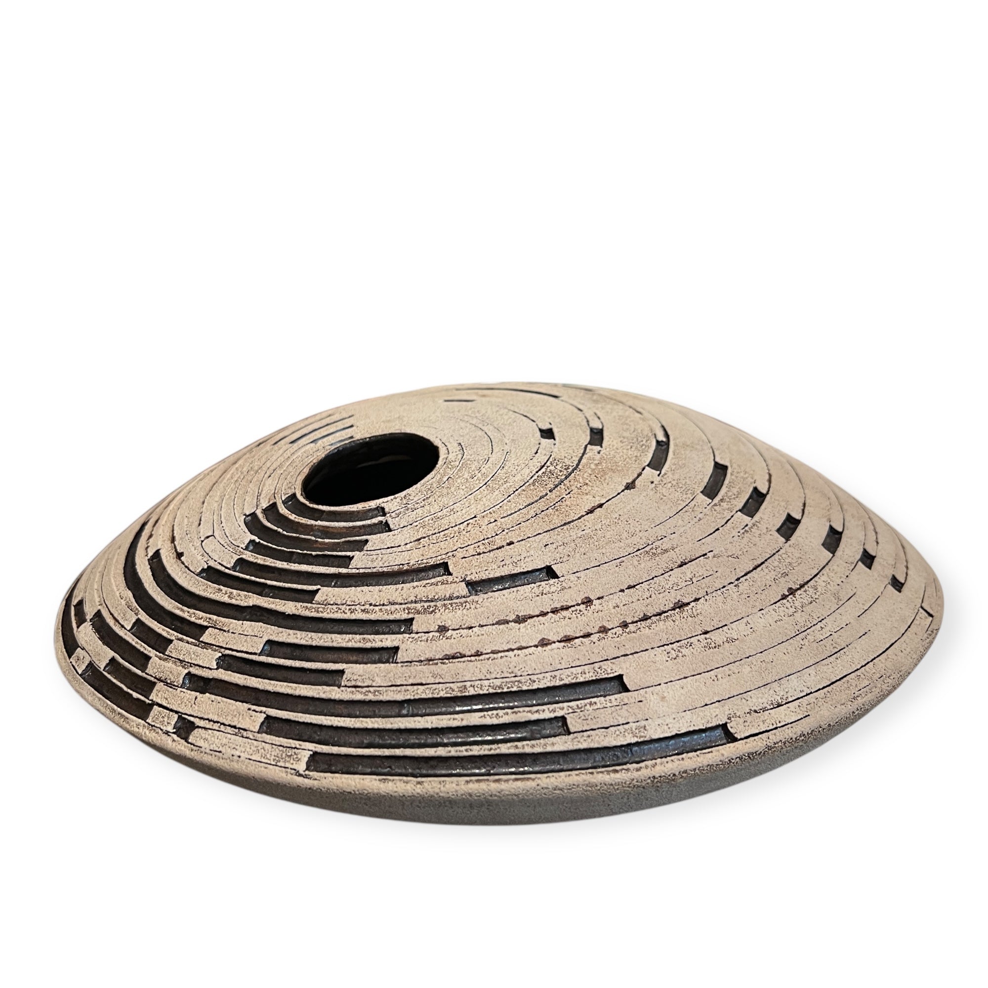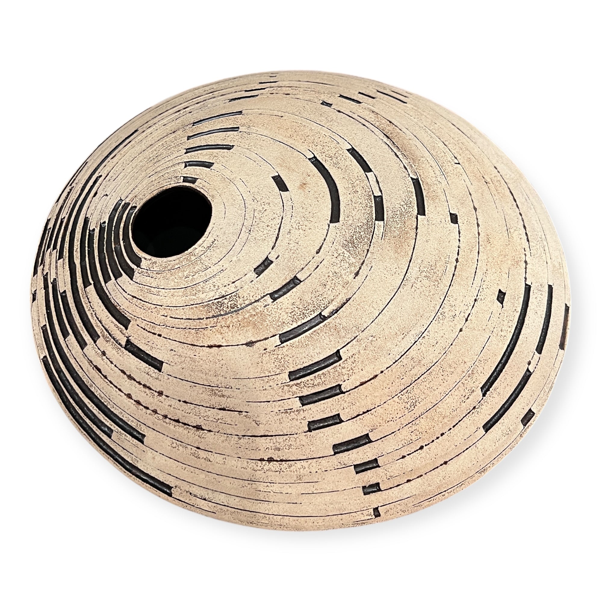 Cette pièce de Yuki Ogami se distingue par une forme aplatie presque galactique, percée d’un col étroit décentré. La surface, d’un blanc légèrement sablé, est animée de sillons concentriques où s’incrustent des segments sombres. Ce jeu d’incisions et de contrastes crée une impression de mouvement continu, comme des ondes en expansion autour de l’ouverture. La précision du tracé souligne la maîtrise technique de l’artiste, formé auprès de Suzuki Goro, mais la matière reste vivante, ponctuée de petites irrégularités qui captent la lumière.