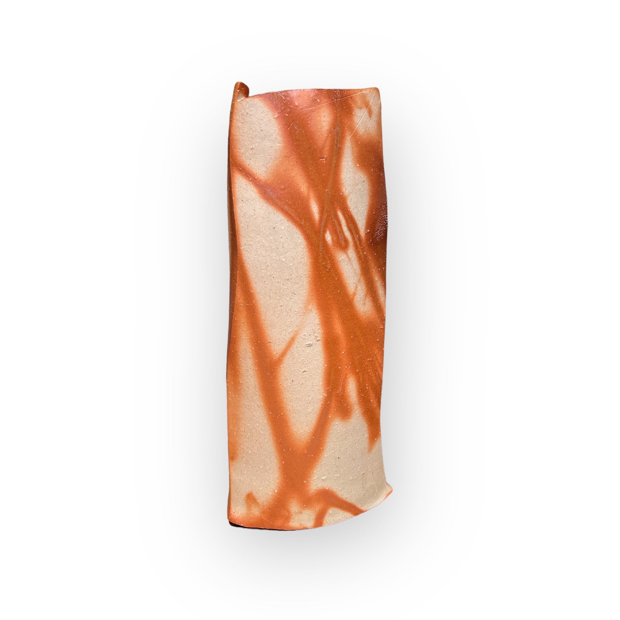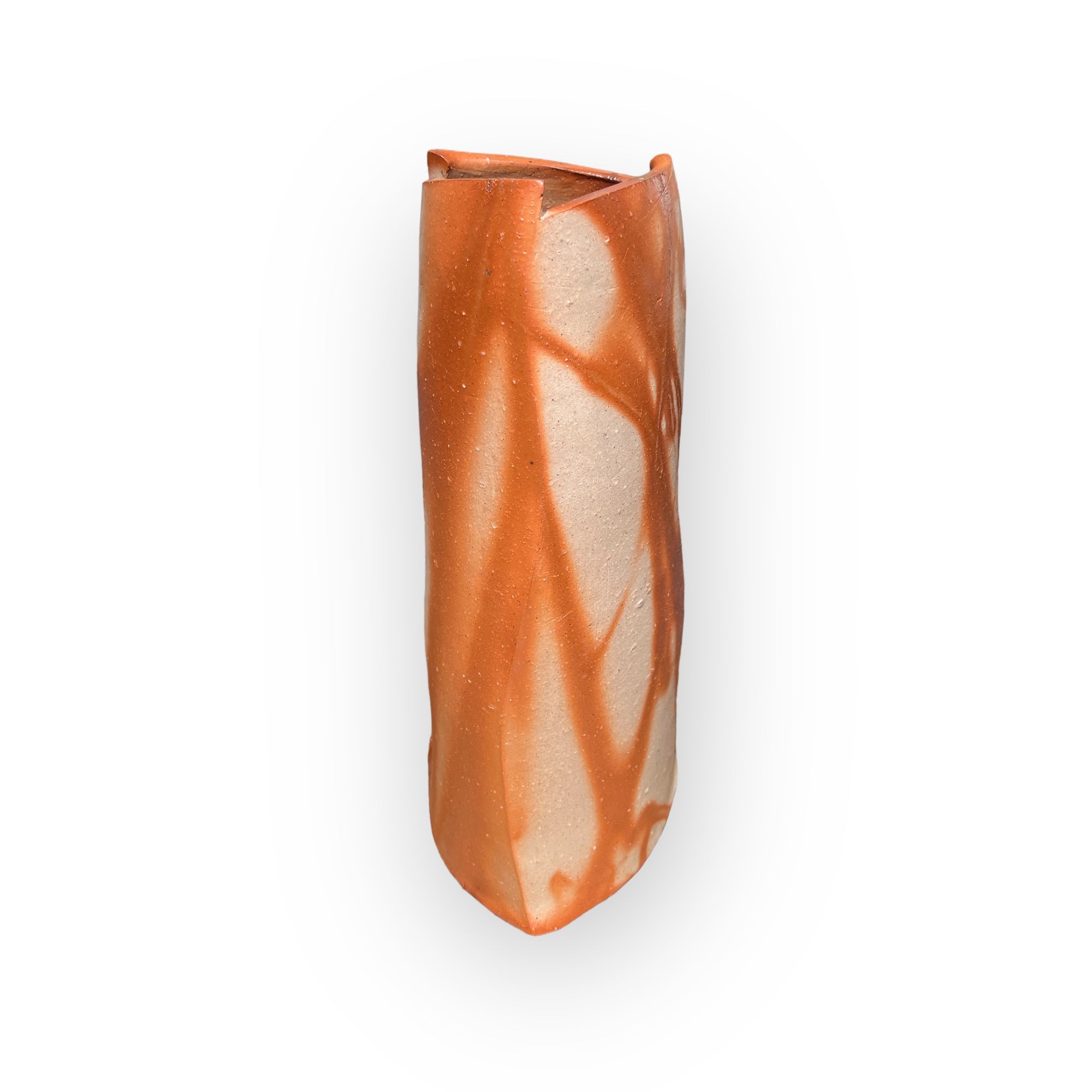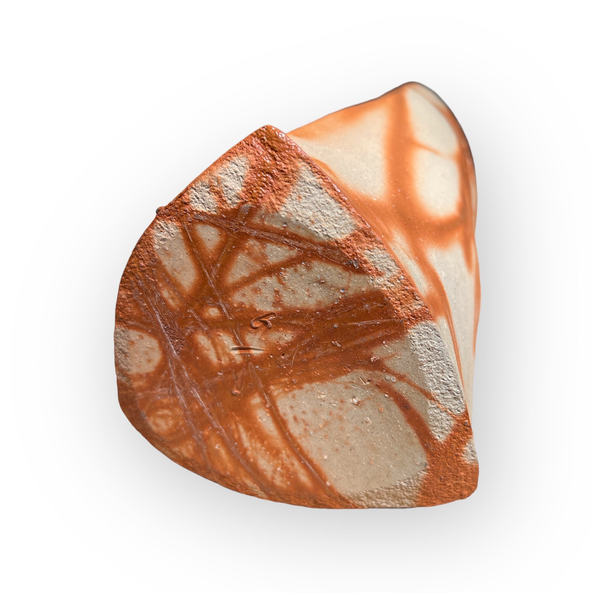 Ce vase, de type hidasuki, mesurant environ 35 x 15 cm avec une base triangulaire irrégulière et des bords décalés, présente des motifs rougeâtres en lignes aléatoires caractéristiques de ce type de décor obtenus par une technique de brulage de paille lors d’une cuisson dans un four à bois.
