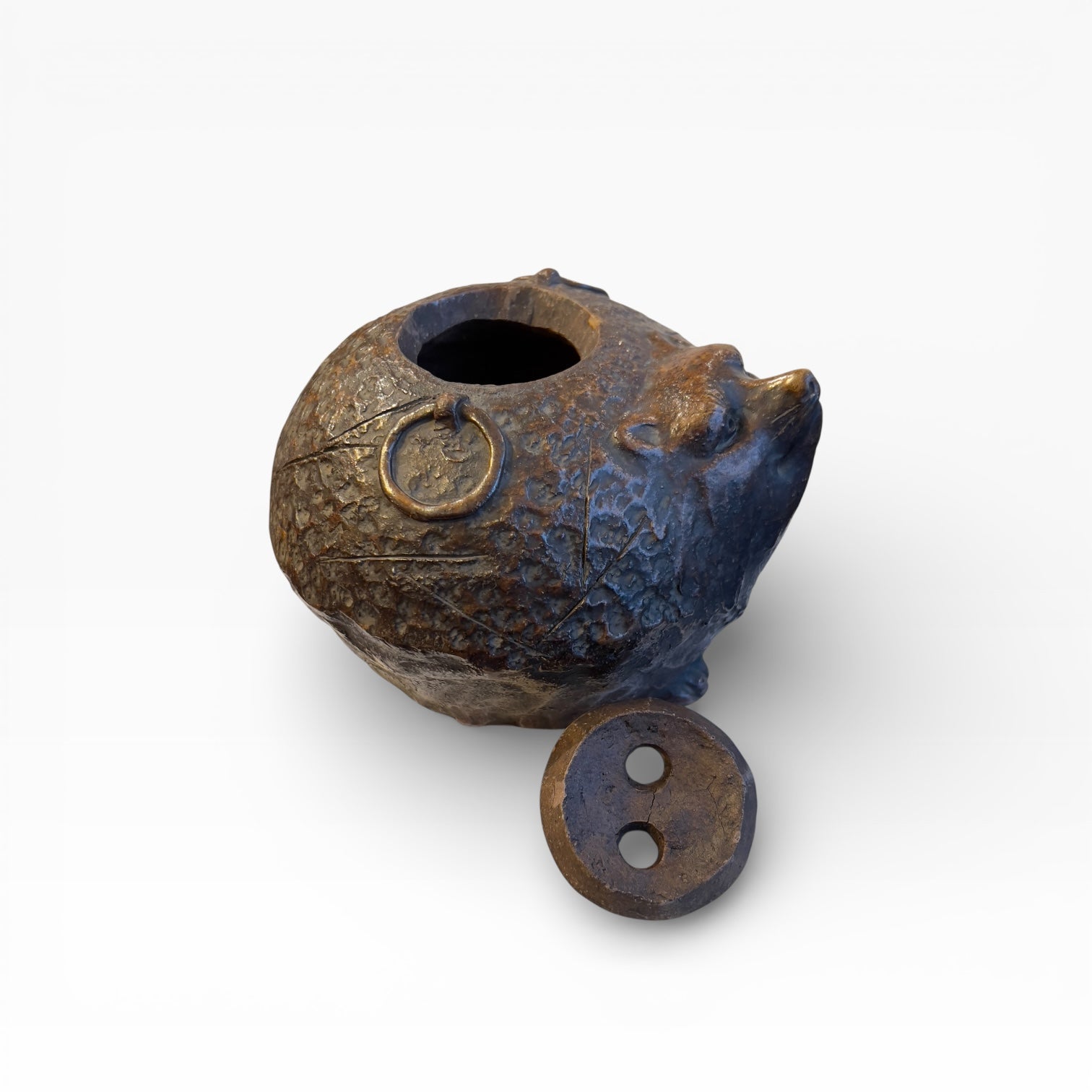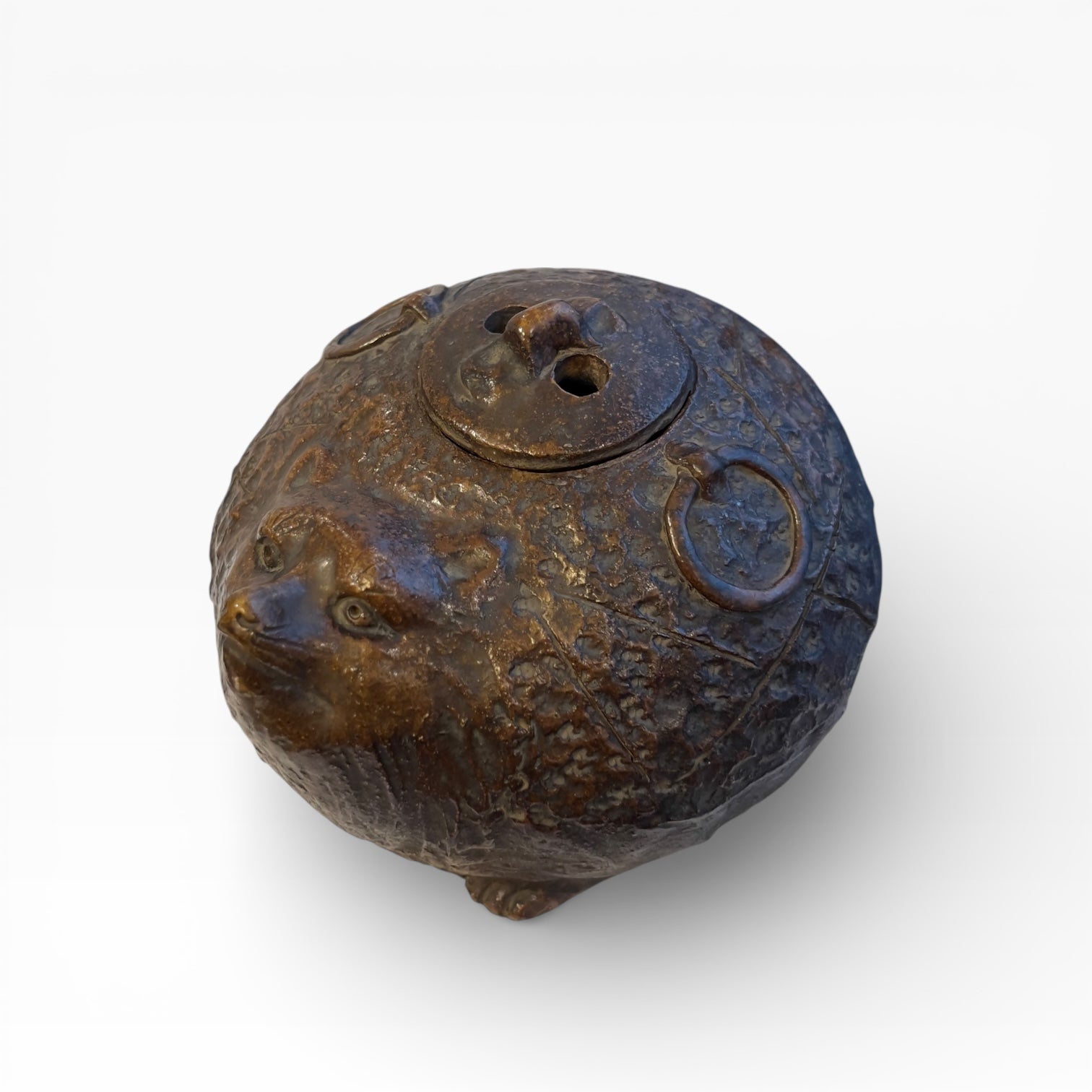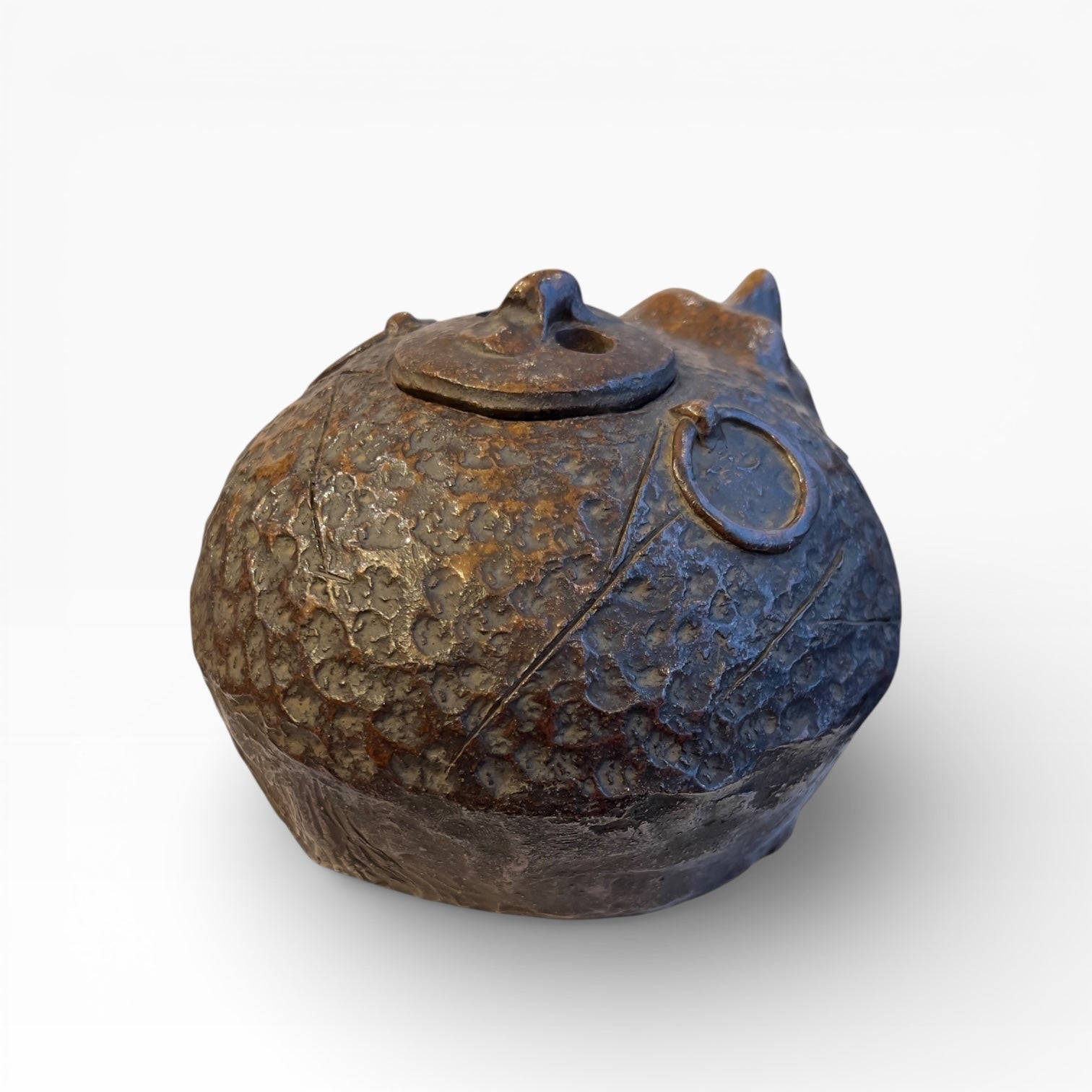 This Japanese incense burner (kōro) in Bizen stoneware is sculpted in the round in the form of a tanuki , treated as a solid, compact, almost spherical volume. The head is clearly defined in relief, while the front paws are indicated only by a slight modeling , barely detached from the body, which reinforces the sense of mass and the sculptural strength of the piece.