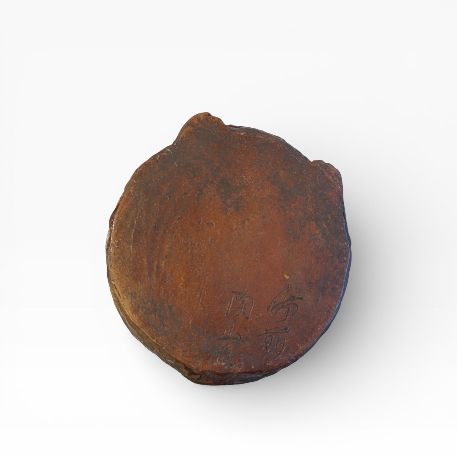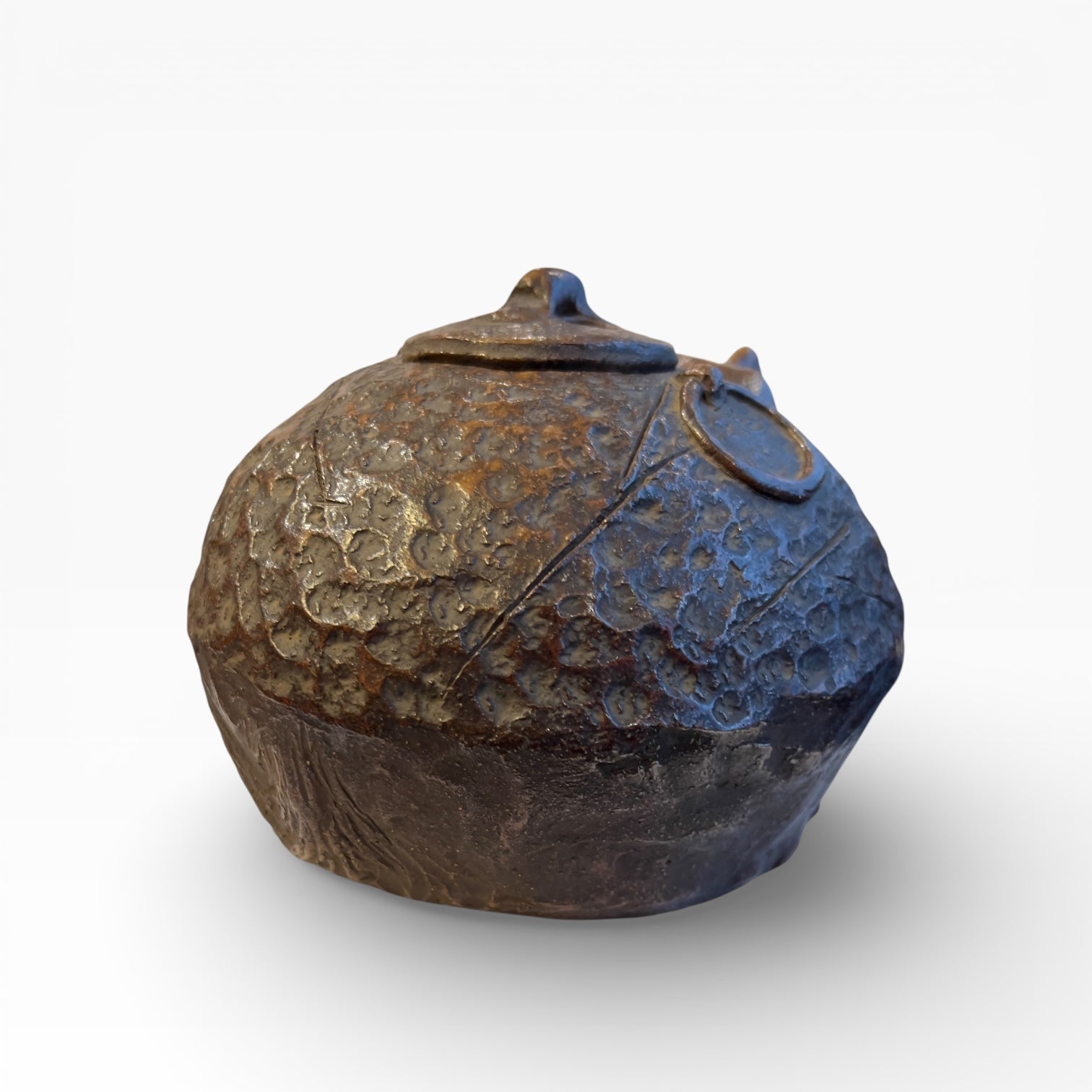 The round , perfectly fitted lid is pierced with small holes for the diffusion of incense smoke. A small rim in the center forms a discreet handle. Firing in a natural atmosphere has resulted in a nuanced brown patina , alternating between darker areas and slightly lustrous patches, characteristic of unglazed Bizen ceramics .