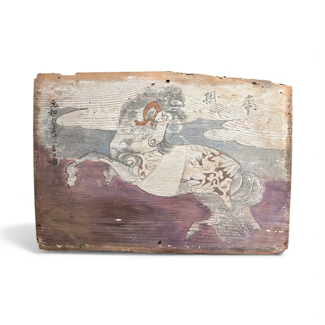 Sur le bord gauche, l’inscription verticale est aujourd’hui très usée, mais son début est lisible : on distingue la mention de l’ère Genna (元和, lecture partielle), ce qui oriente vers un objet du tout début de l’époque Edo. La conservation du panneau – usure de surface, lacunes anciennes, attaques du bois et patine générale – est cohérente avec une œuvre destinée à être exposée dans un contexte de culte, plus qu’avec une peinture conçue pour un intérieur privé.