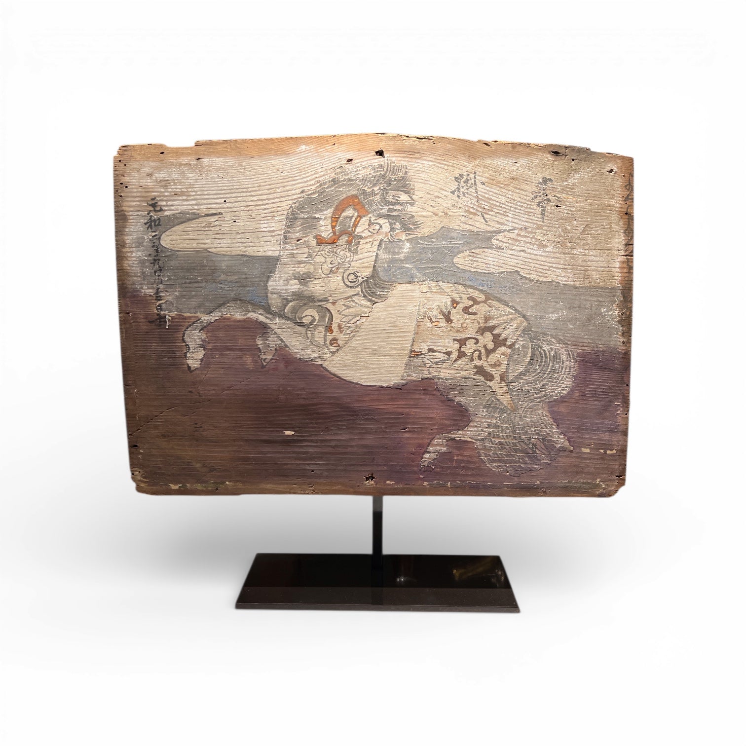 Cette plaquette votive appartient à la tradition des ema (絵馬), littéralement « cheval peint ». Dans le Japon pré-moderne, le cheval est un animal de prestige, associé aux sanctuaires shintō comme monture des divinités et comme médiateur symbolique entre le fidèle et le monde des kami. L’ema prolonge une pratique ancienne : offrir un cheval – ou son équivalent peint – pour formuler une demande, remercier d’une protection, ou déposer un vœu. Ces images étaient suspendues dans les bâtiments de culte, parfois dans des pavillons dédiés, et participaient à un paysage visuel collectif où l’acte de don était publiquement visible.