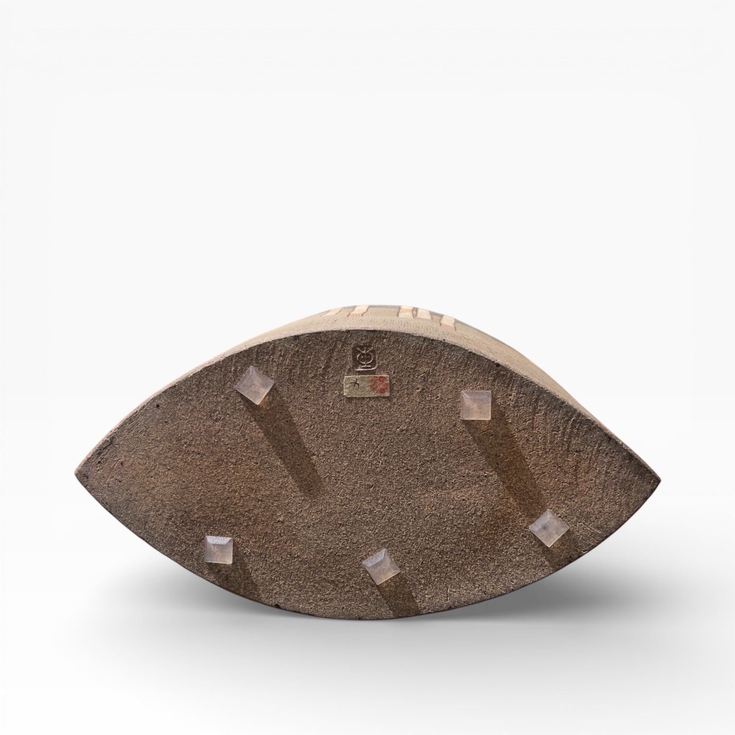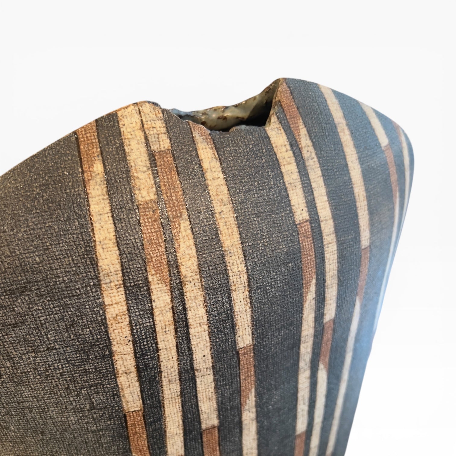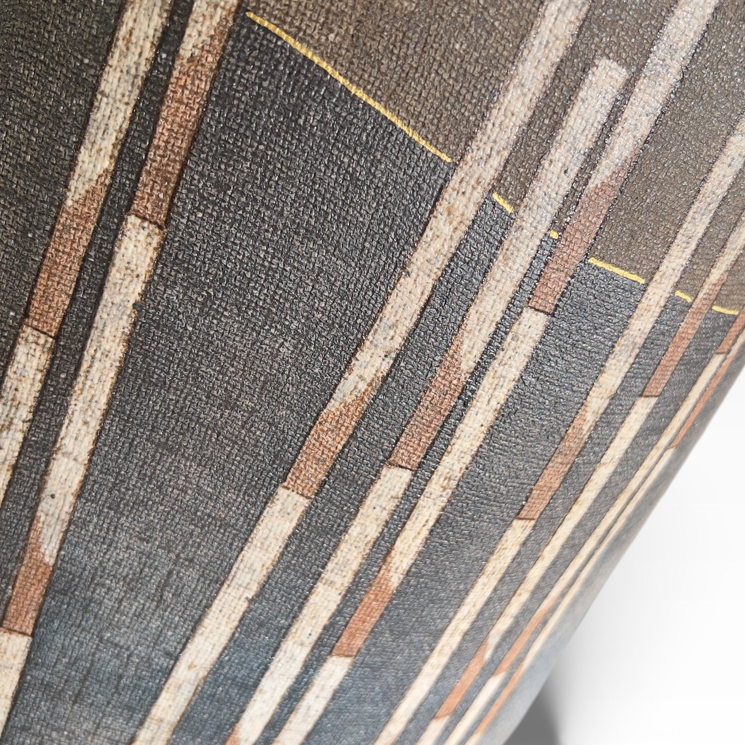 The surface is worked according to the principle of nunome (布目), a textile-like weave effect integrated into the clay's surface. Against this finely textured background, the design reads like a stylized bamboo grove: segmented vertical stalks, alternating between off-white, warm brown, and gray, establish a different rhythm on each side. A delicate horizon line, highlighted in gold , structures the space and separates the chromatic fields.