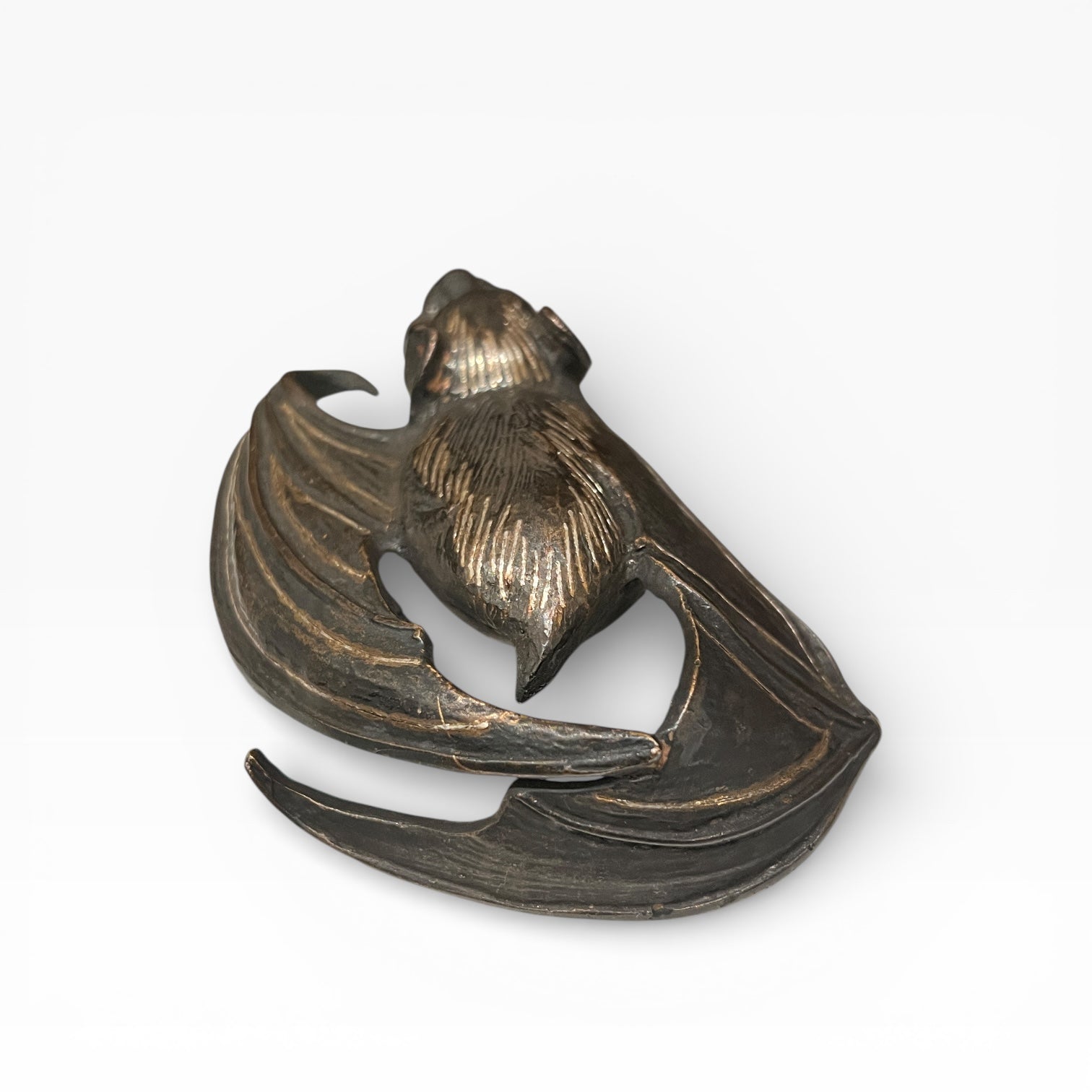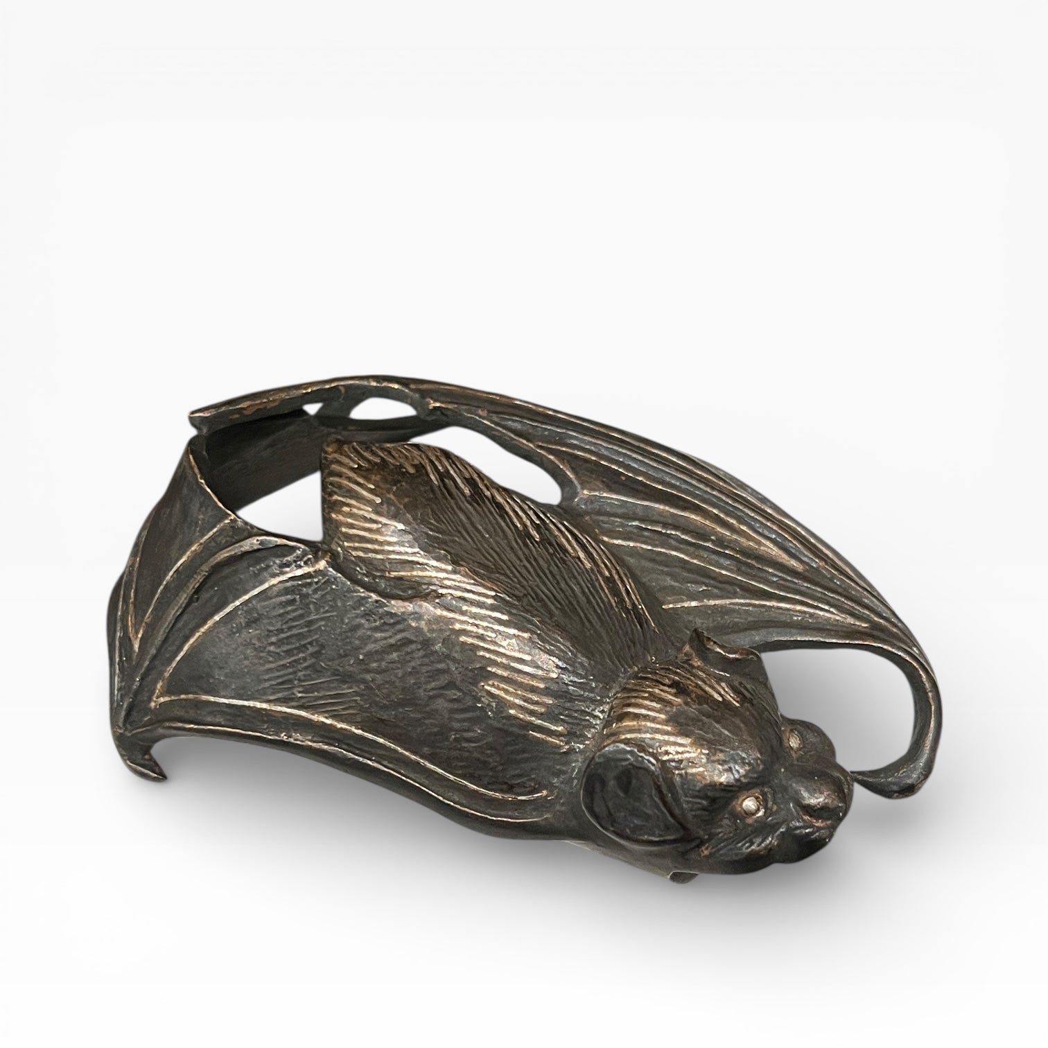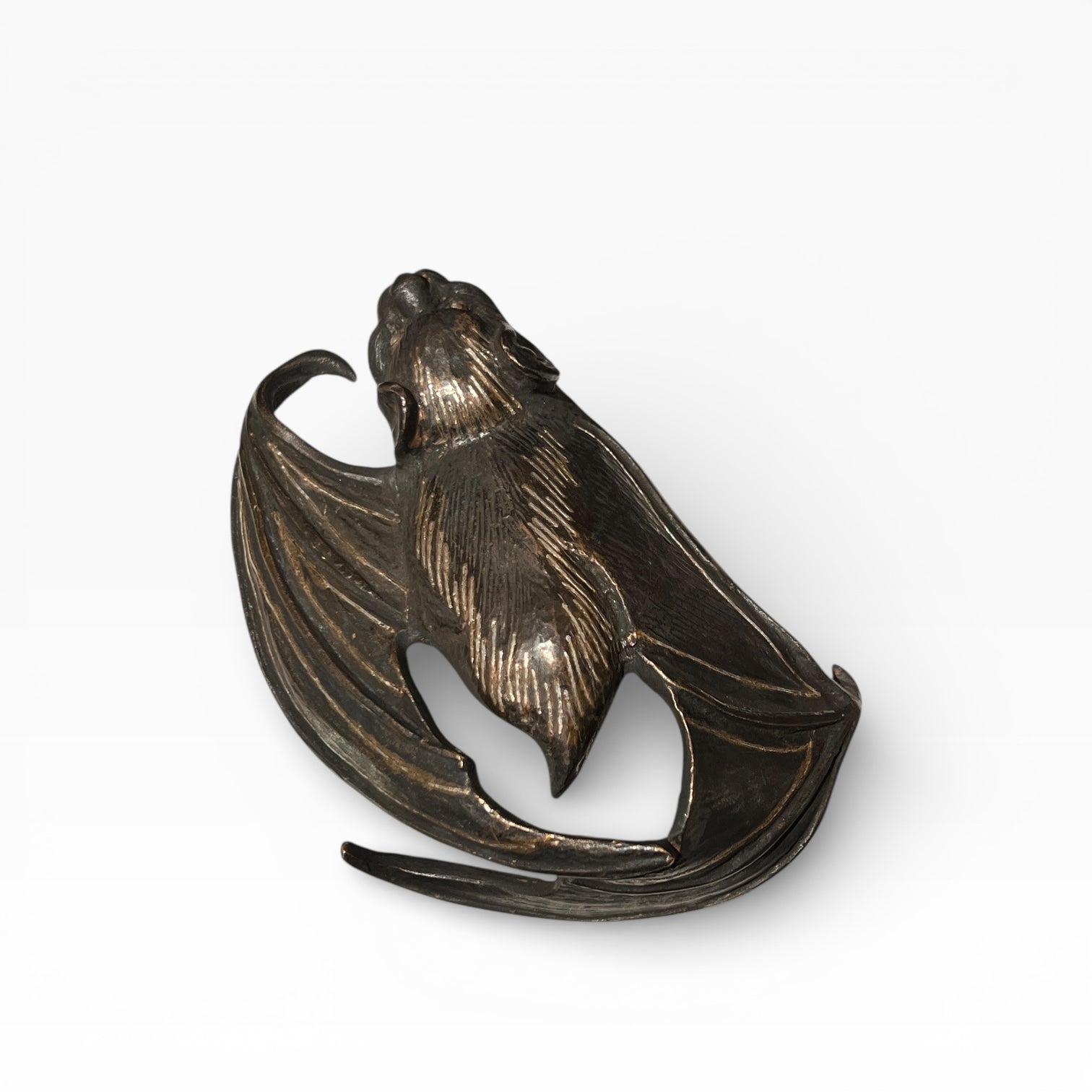 Japan – Wall vase (kake-hanaire) in the shape of a bat, wrought iron inlaid with silver, Ryūbundō workshop (龍文堂), Meiji–Taishō period