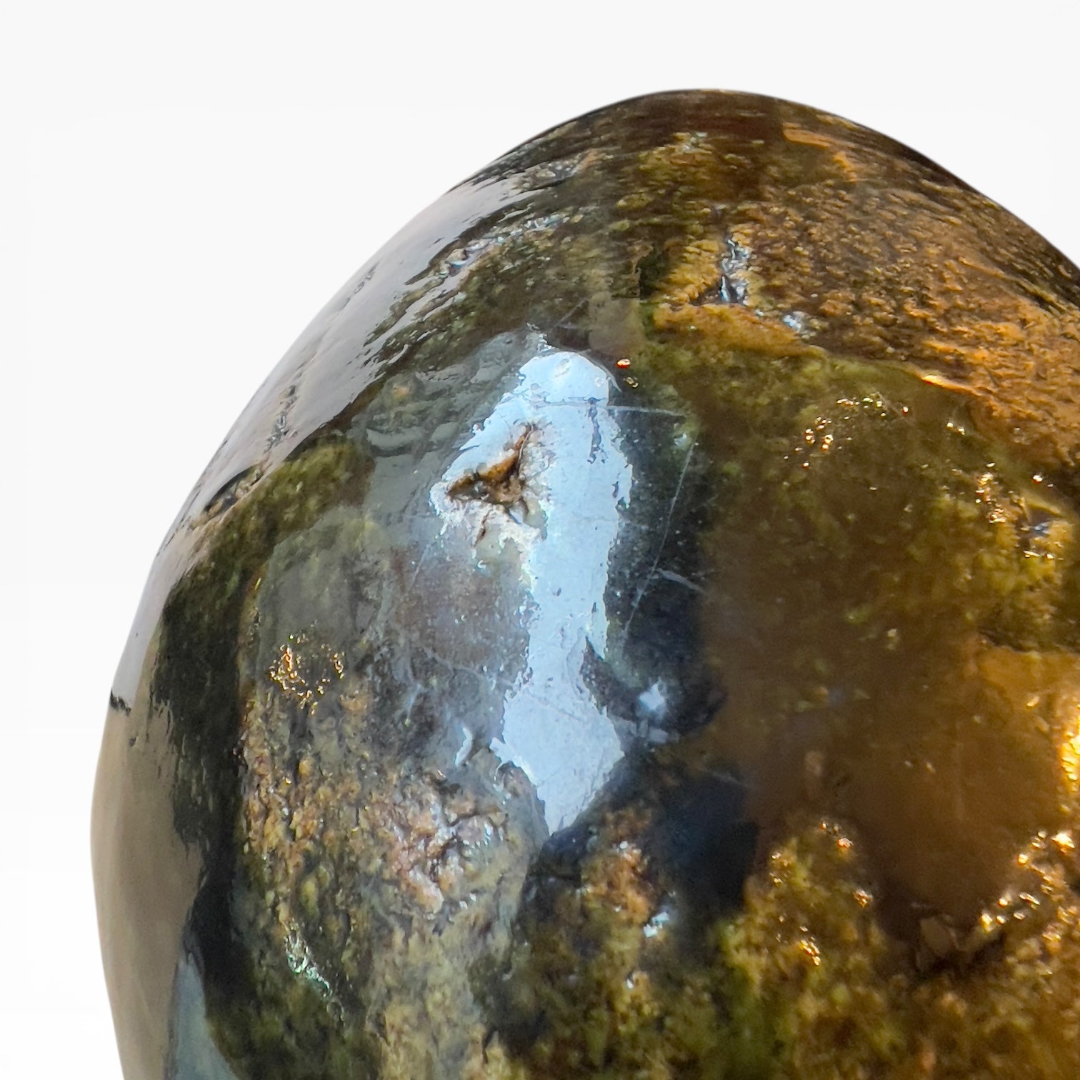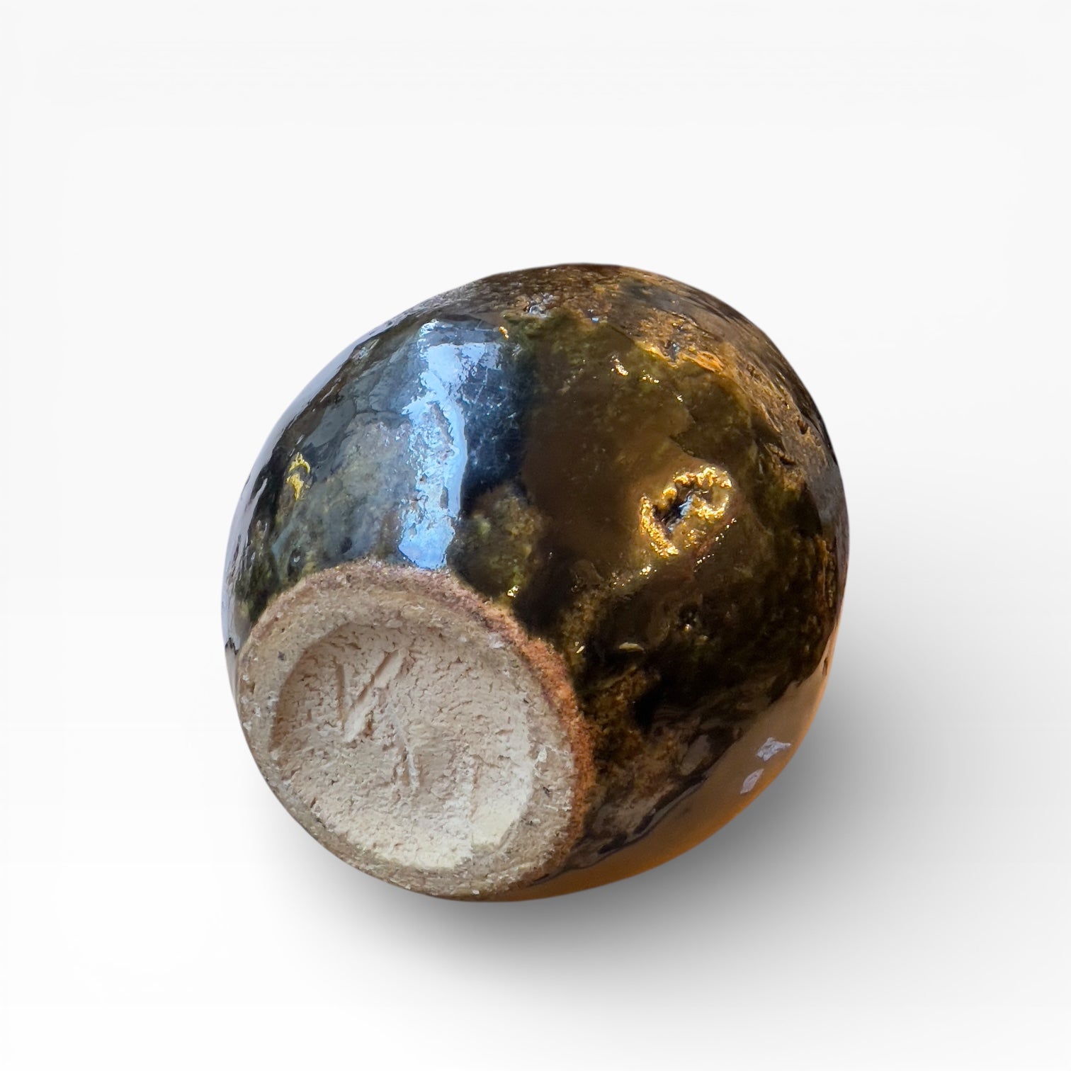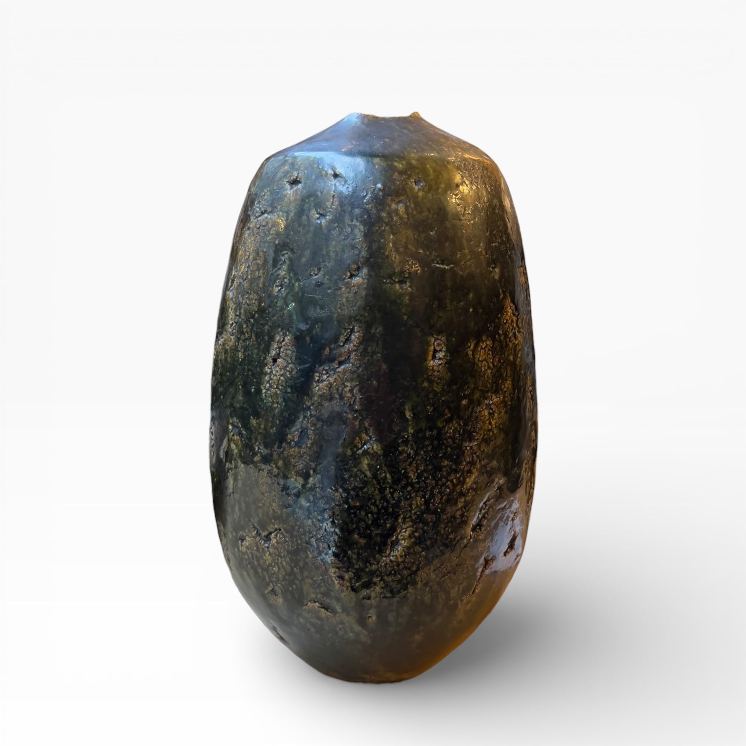 The surface is dominated by an olive-green glaze, laid over a beige body that shows through in irregular transparencies. The glaze thickens in places, creating areas of shadow beneath the material, then blisters and granulates, eventually forming a thick, almost mineral-like skin that alters the light depending on the viewing angle. The decoration here is entirely determined by the firing process and the surface tension of the glaze, in an aesthetic of depth rather than pattern.