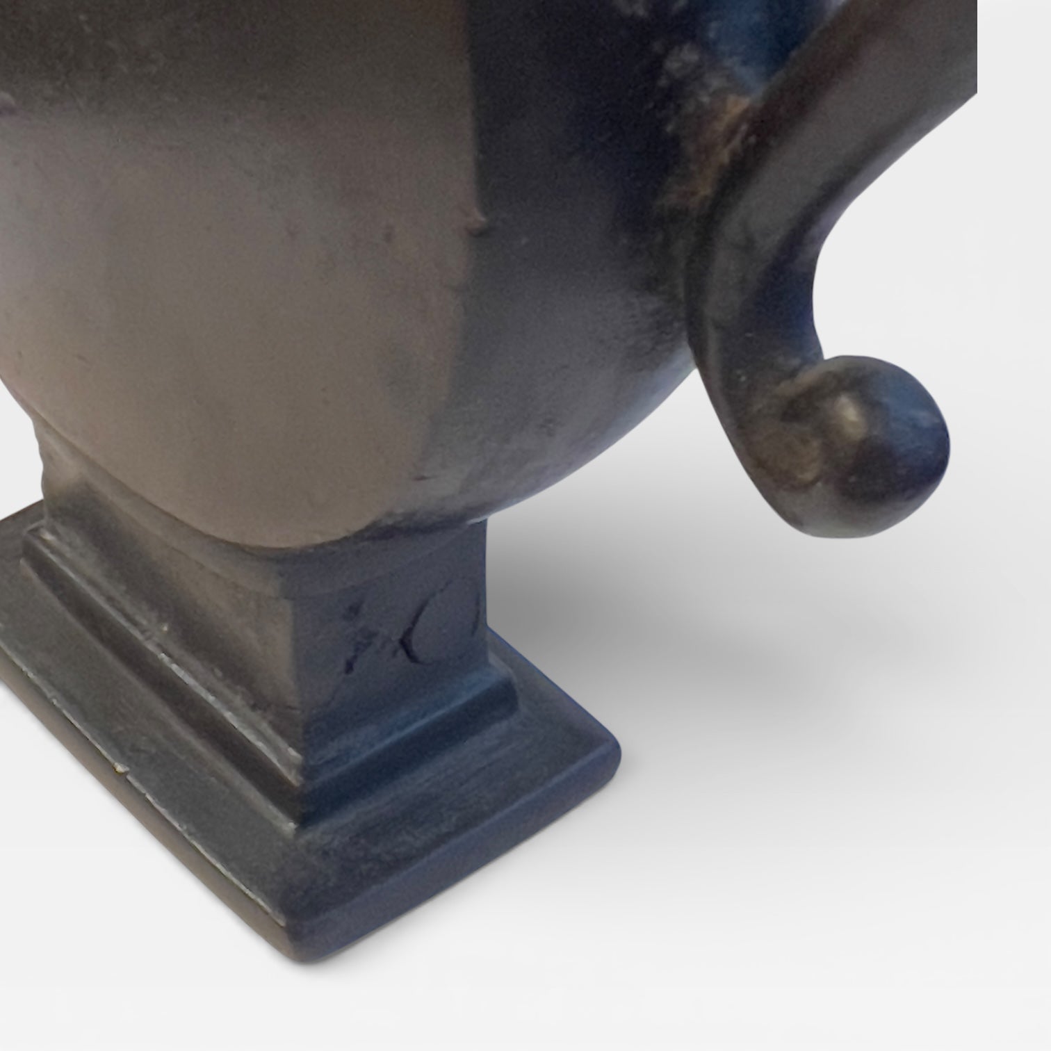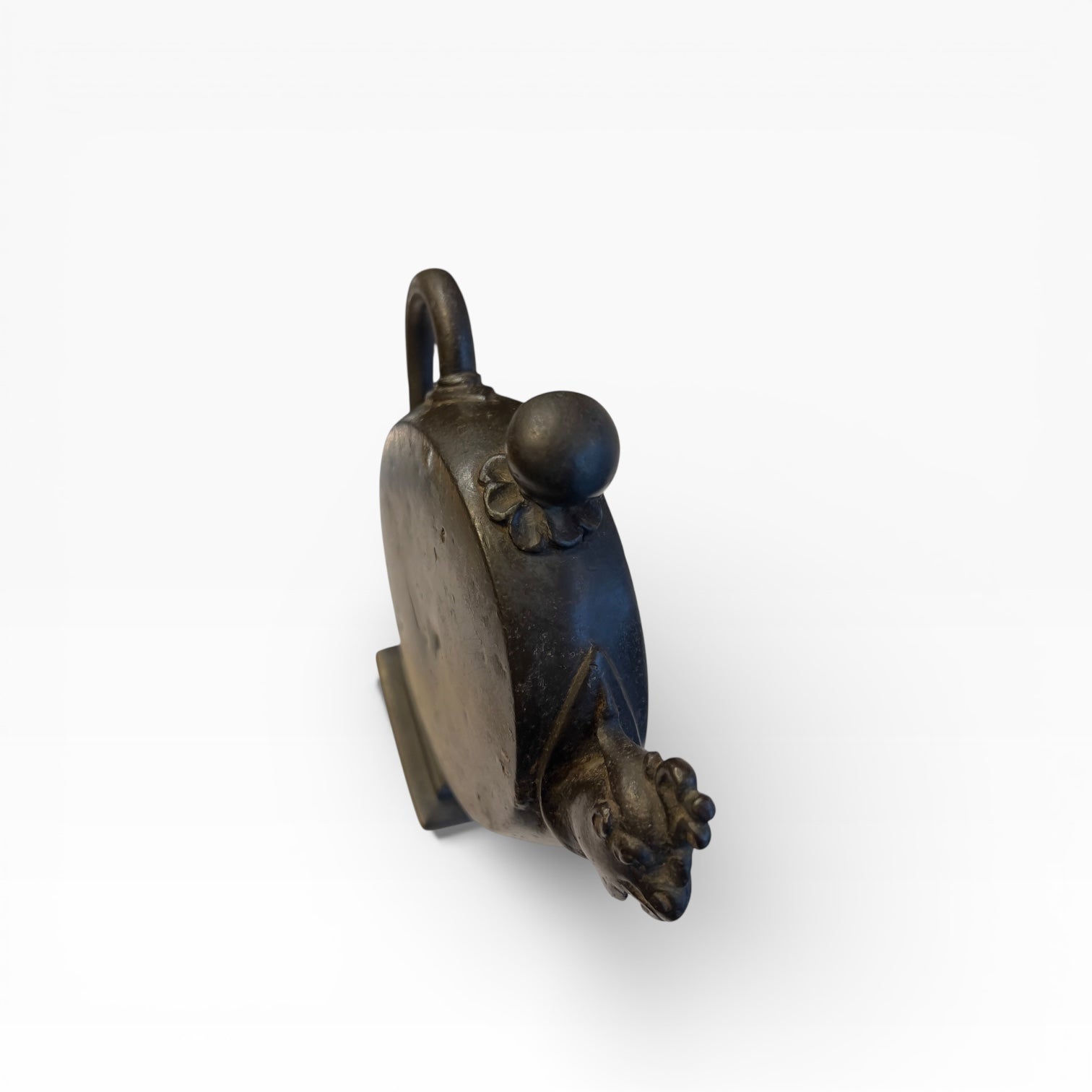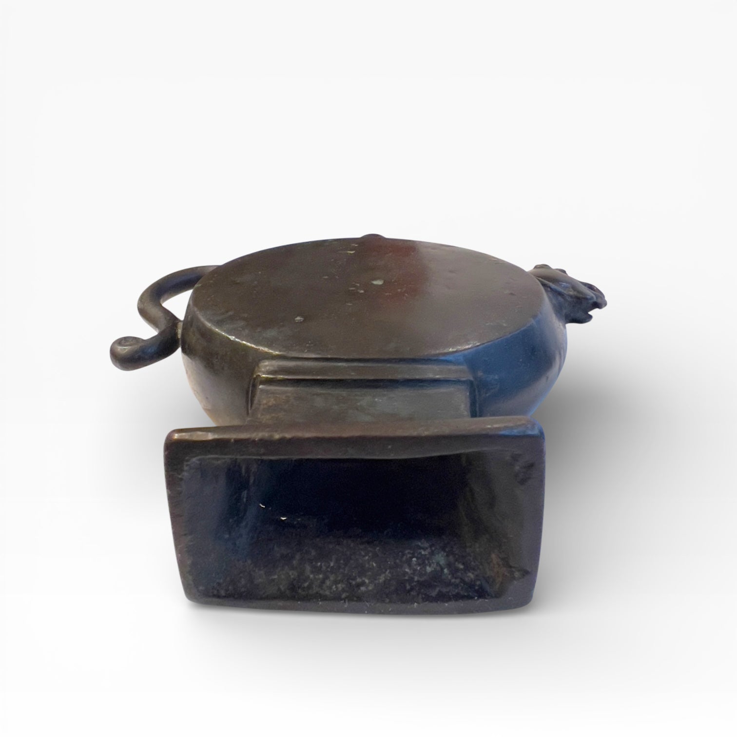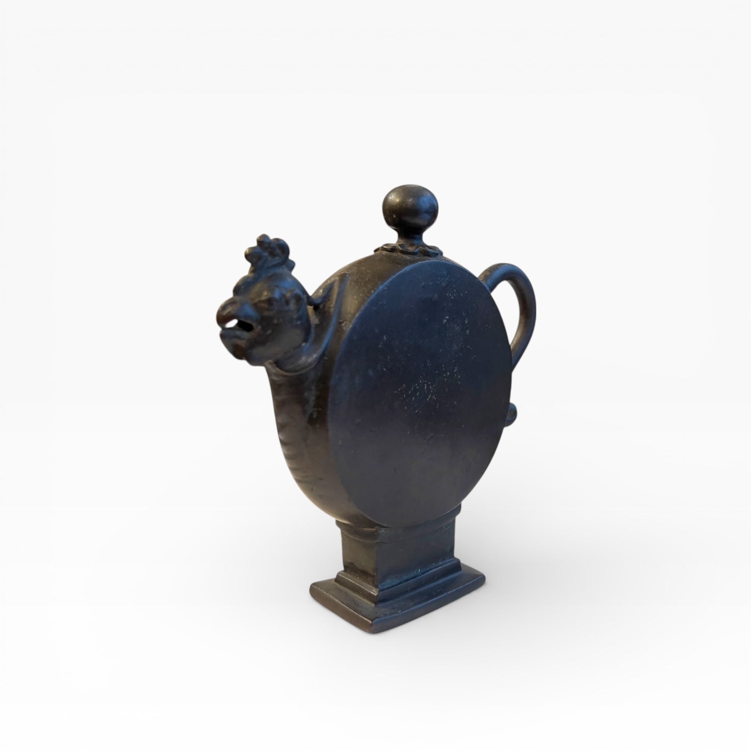 This small bronze ewer, with its flattened, disc-like body, belongs to the family of daoliuhu (倒流壺), also known as inverted-fill ewers. It is filled from the bottom, and the liquid circulates through an internal tube, a design that allows pouring from the spout while keeping the filling opening hidden during use. Its size and comfortable grip suggest it was a typical object for a scholar's study, used for water or ink, with a controlled flow.