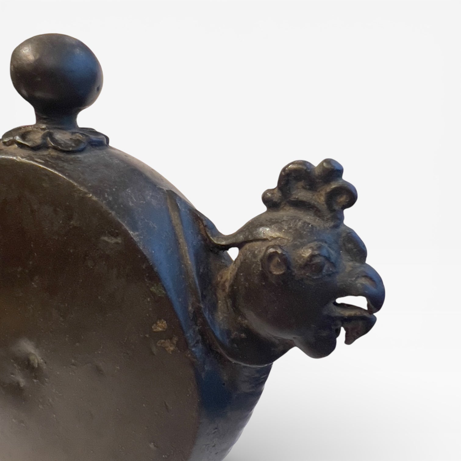 The form is constructed with great economy of lines. A looped handle contrasts with the sculpted, three-dimensional spout: a bird's head, likely a phoenix, with its beak slightly open. At the top, a spherical knob rests on a small corolla. The whole rests on a rectangular pedestal with molded profiles, hollowed out underneath, designed to stabilize the object while protecting the infill area. The patina is brownish-black, punctuated by slight oxidation and a repair on the side of the base.