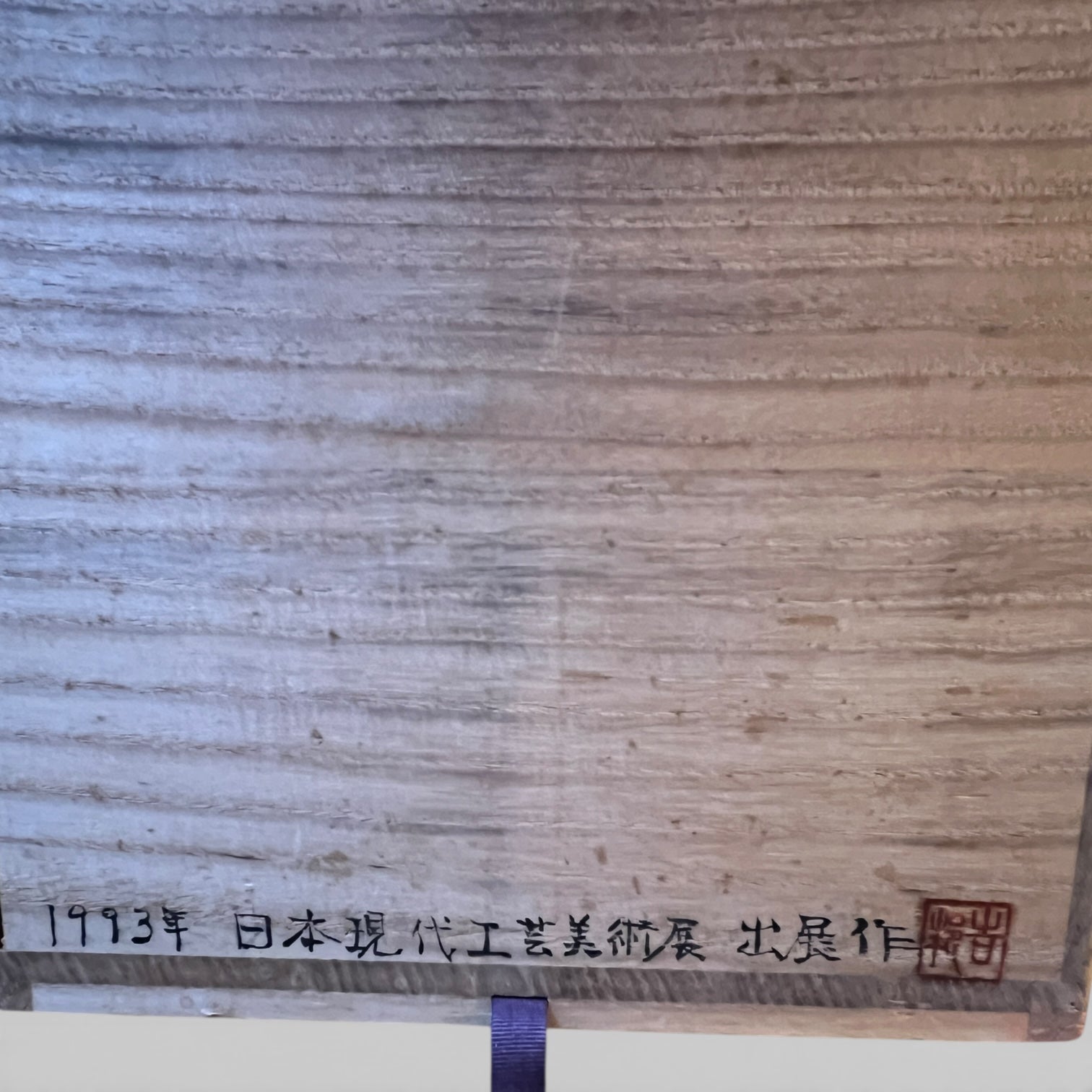 The original tomobako bears the title "方象", translated here as "square figure", as well as an inscription indicating that it is a work presented at the Japan Contemporary Craft Art Exhibition (日本現代工芸美術展) in 1993. The bottom of the vase is incised and dated.