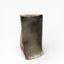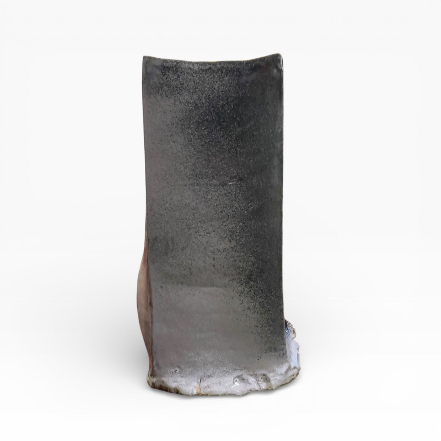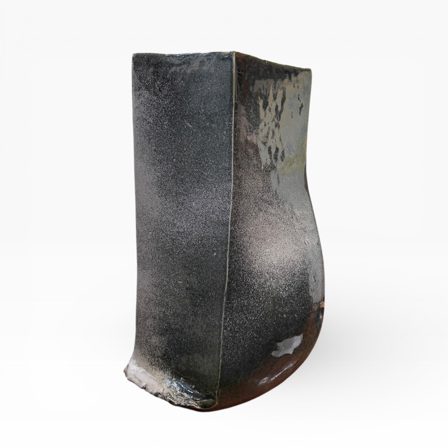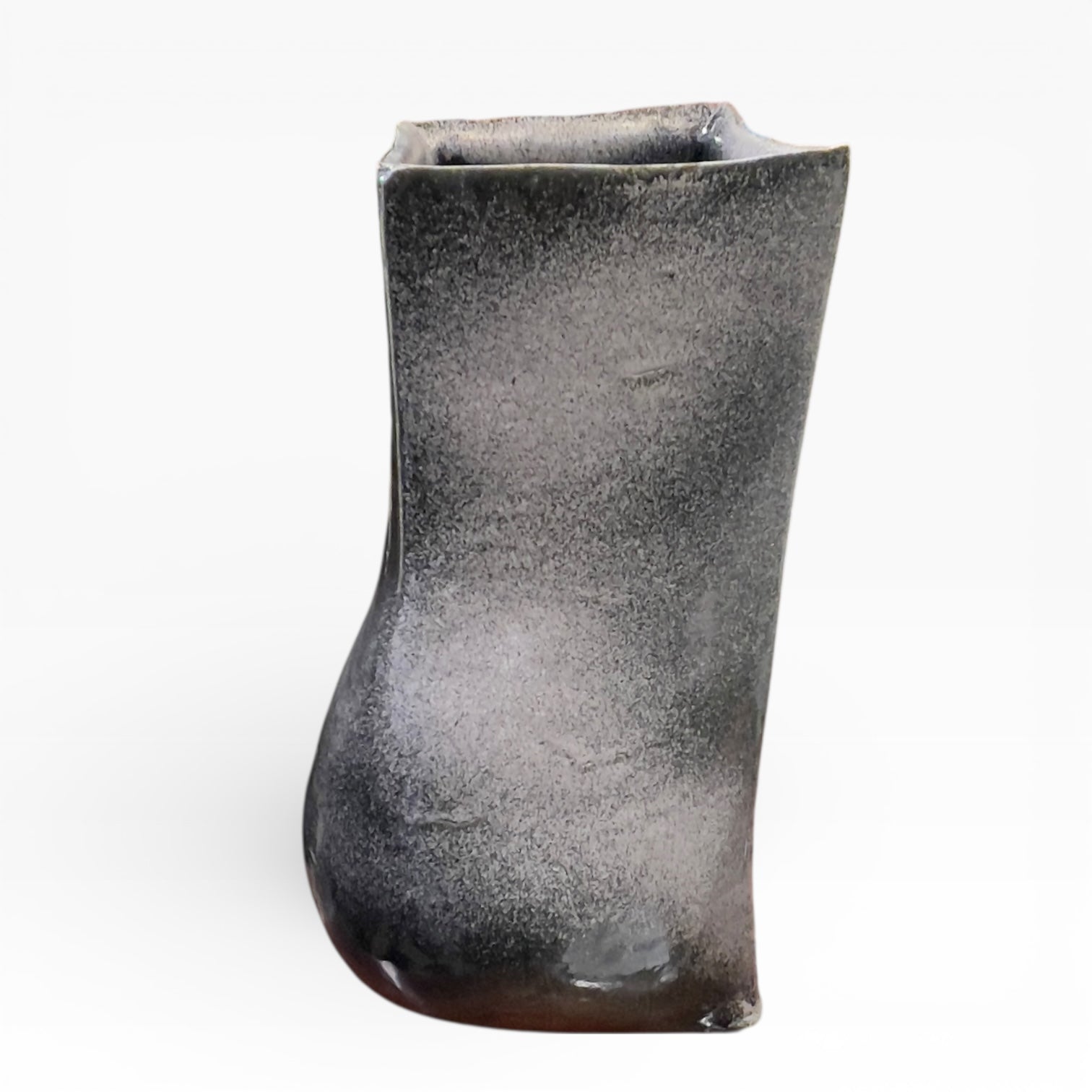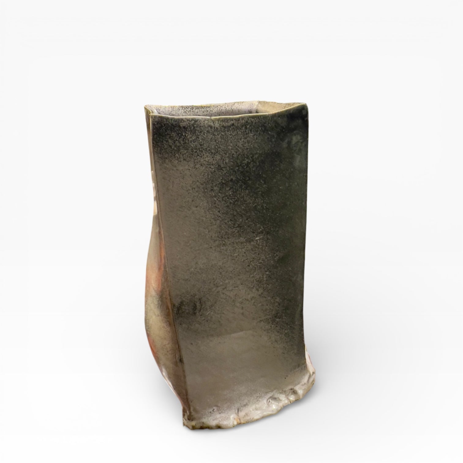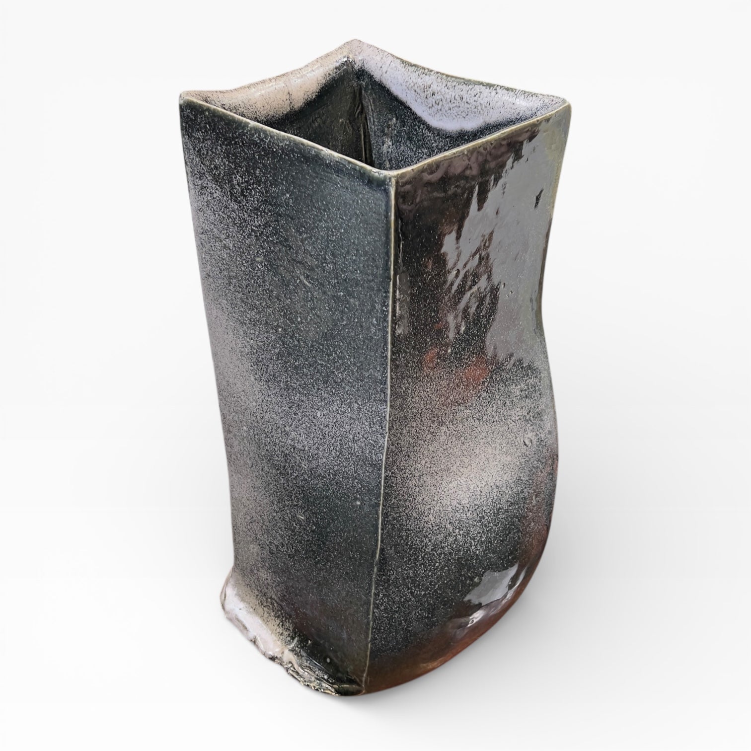 The vase presents itself as a vertical volume with a square cross-section, constructed on a deliberately inflected geometry. The edges remain sharp, but the walls are not perfectly flat: one face bulges and the silhouette shifts, giving the whole the presence of a sculptural object. The base is very distinctive, with wider, thicker rims that extend beyond the body of the vase and reinforce its visual presence. The opening is wide, the rim thickened and irregular, reflecting the handcrafted nature of the firing process.