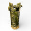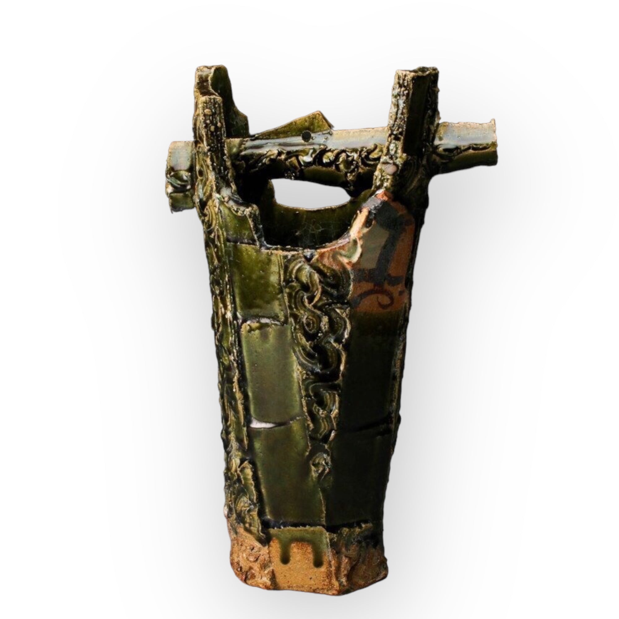 This large vase takes its form from a hooped wooden bucket (te-oke), transposed into ceramic with a very assertive sculptural presence. The body is constructed of slightly faceted vertical panels, the surface of which is punctuated by thick edges and raised areas, as if the material had been carved after assembly. At the shoulder, two uprights frame a horizontal crossbar, a deliberately massive element that reinforces the idea of an assembled object rather than simply thrown on a wheel.
