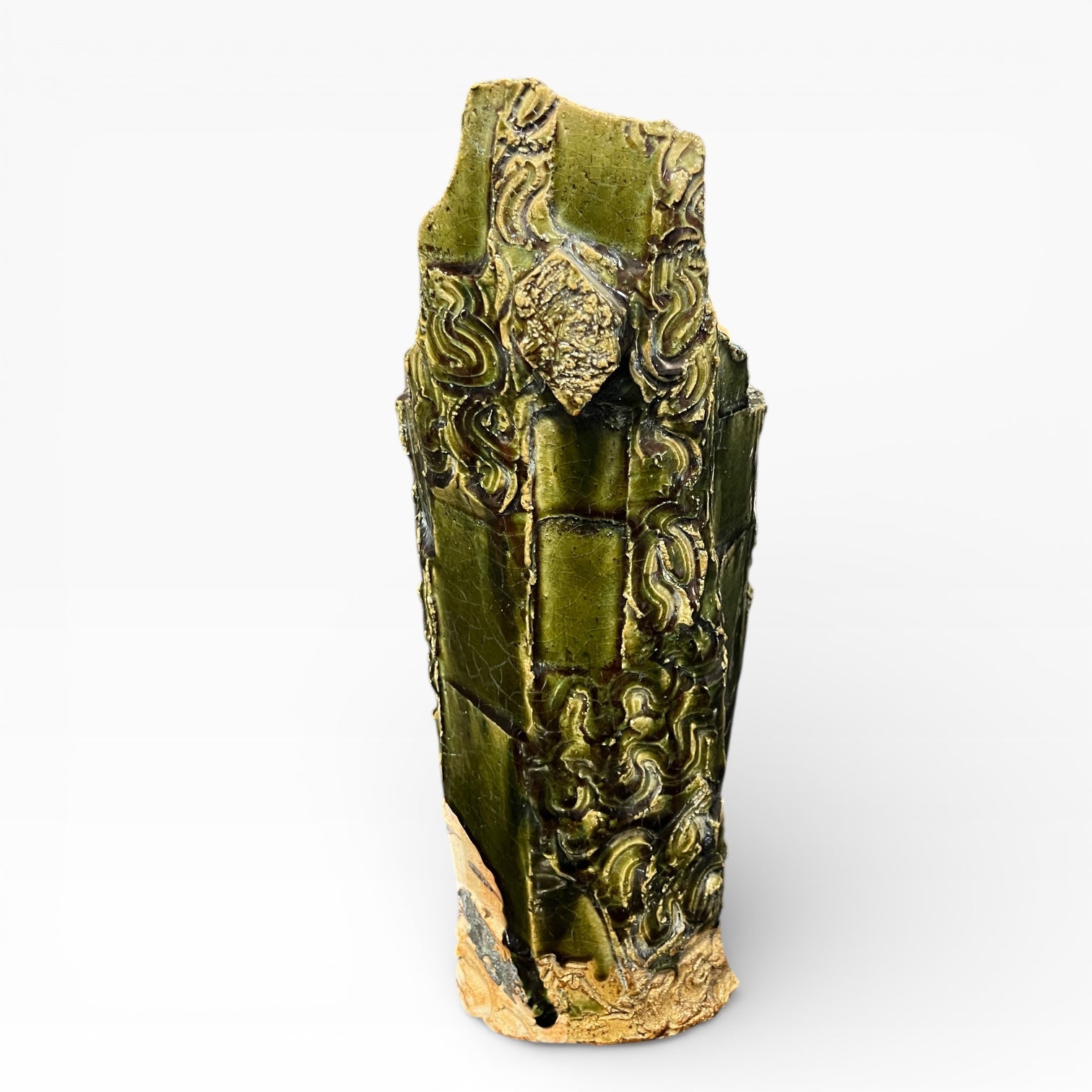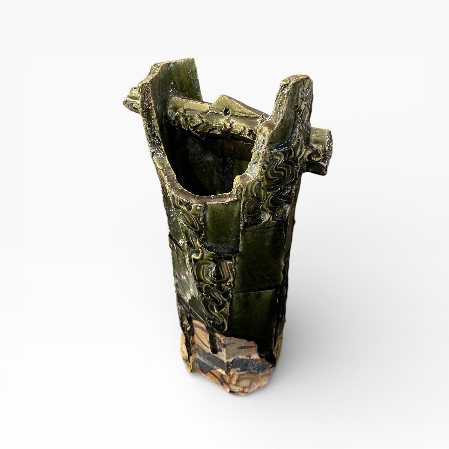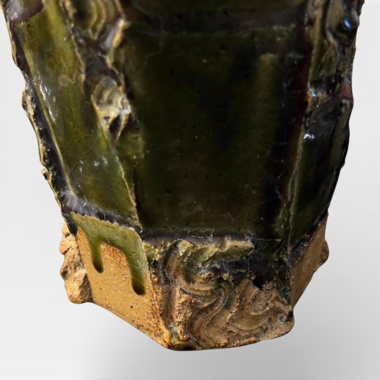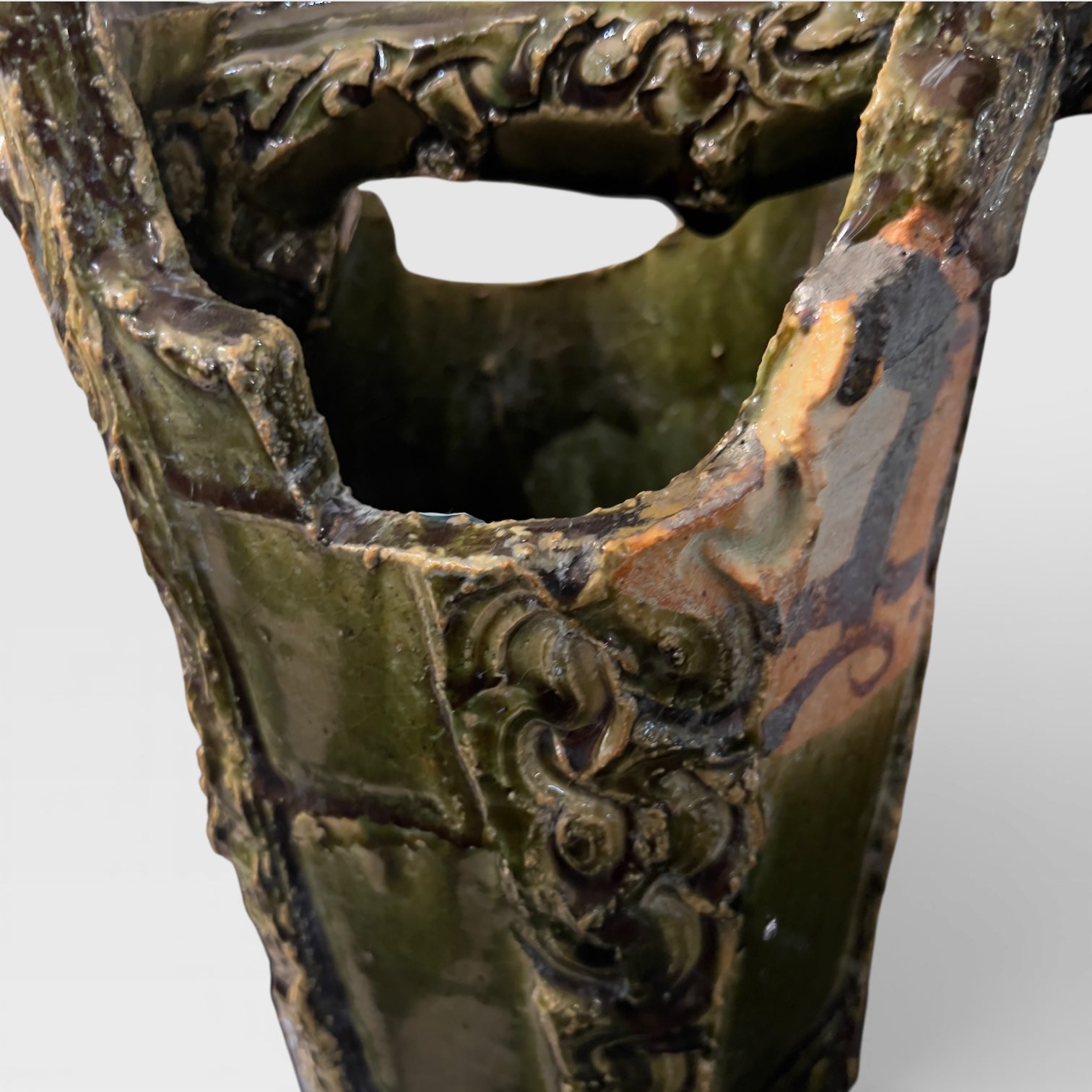 The dense, deep Oribe glaze here oscillates from copper green to dark olive green, with almost black accumulations in the hollows and bold drips that run down towards the base. The sinuous, vibrant reliefs evoke stylized swirls or waves, but without any narrative decoration: they are traces of gesture, ridges of paste and glaze that catch the light. On one face, a deliberate reserve reveals a brown and ochre fragment, like a panel of slip or underglaze paint, intentionally presented as a break in the continuity of the green.