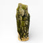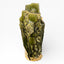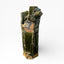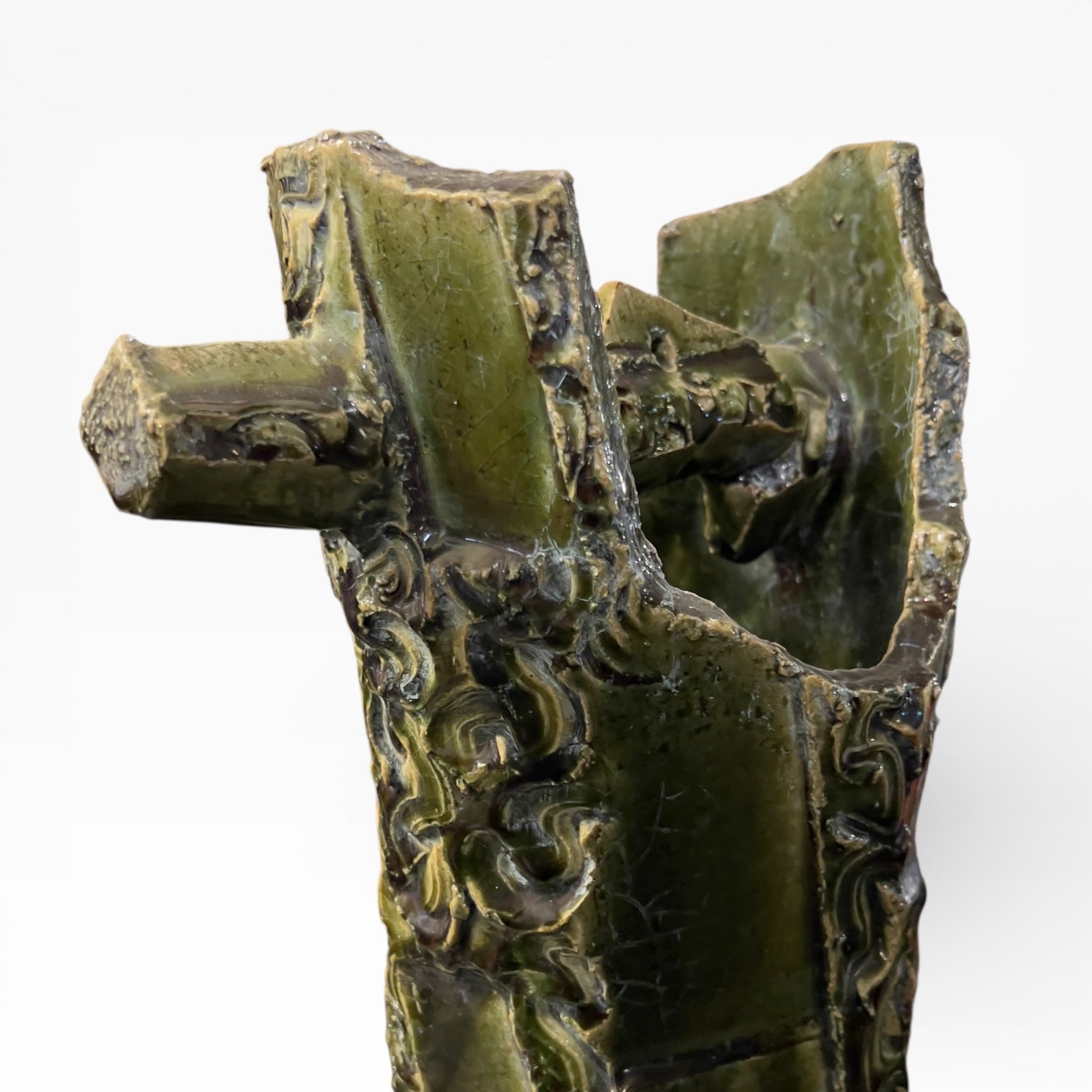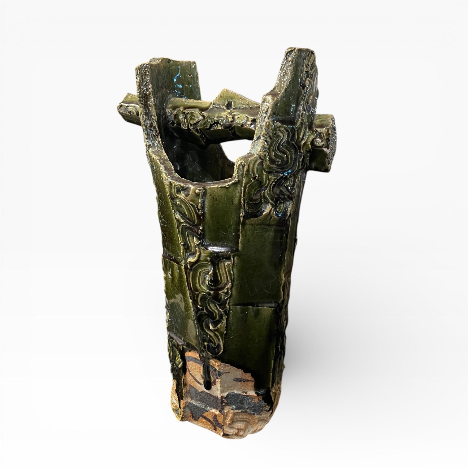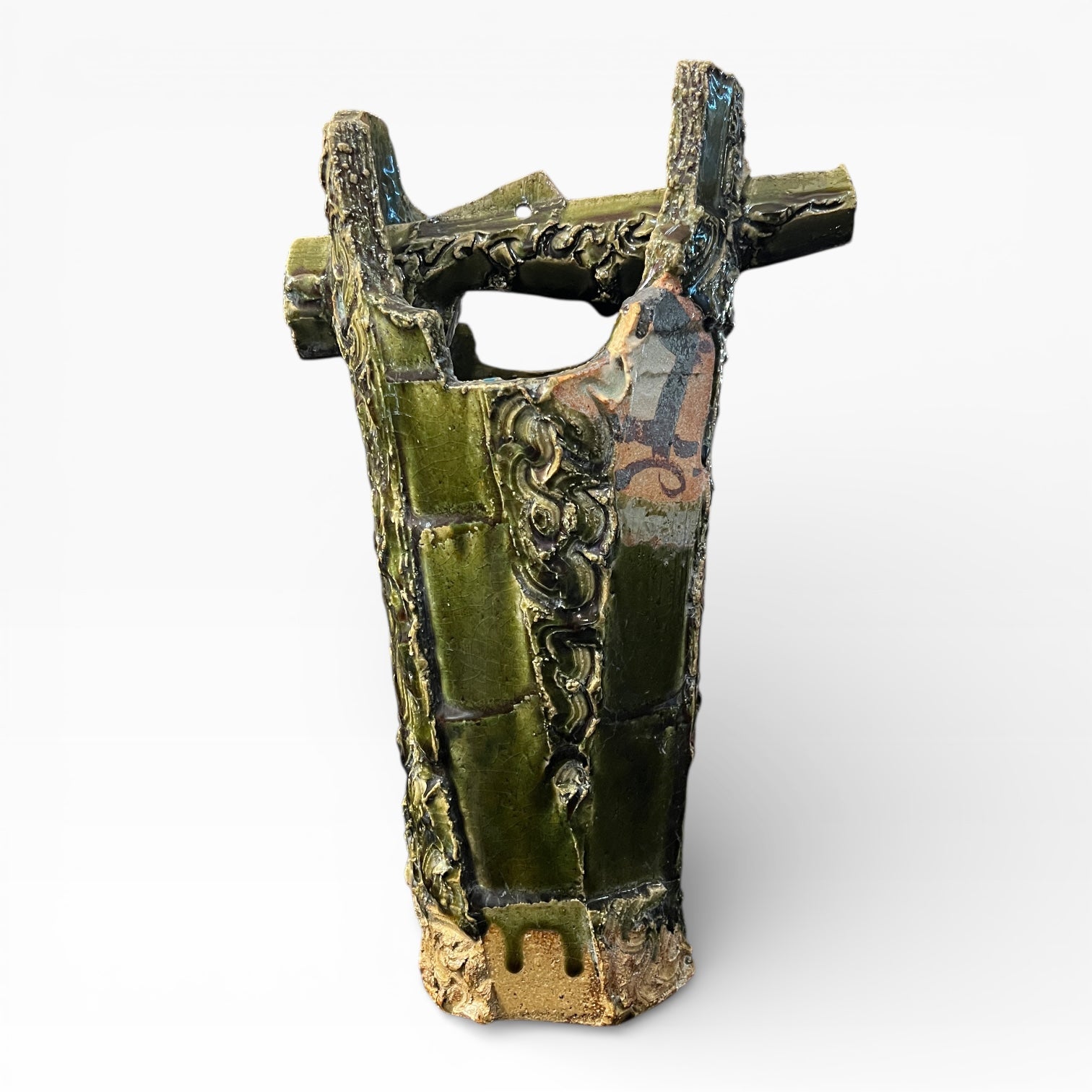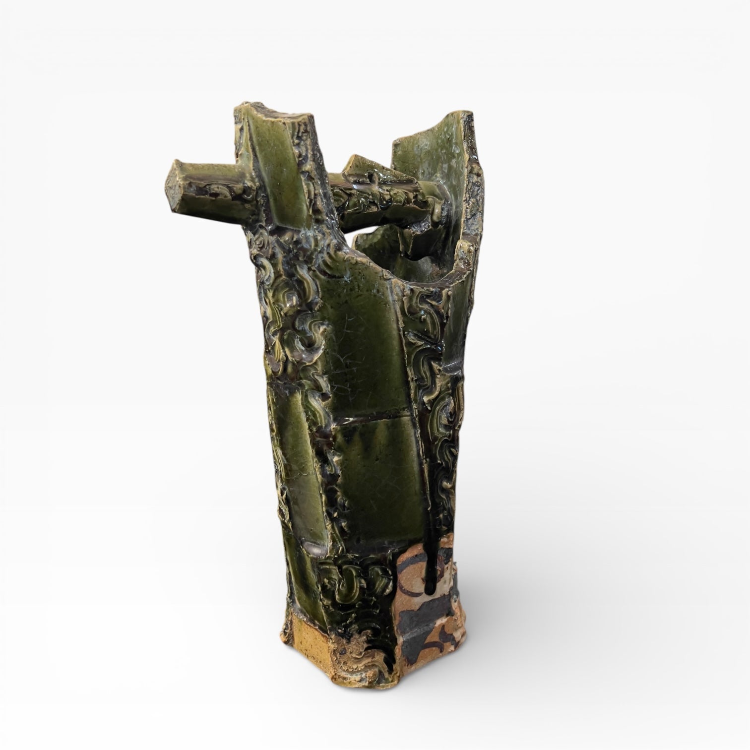 The dense, deep Oribe glaze here oscillates from copper green to dark olive green, with almost black accumulations in the hollows and bold drips that run down towards the base. The sinuous, vibrant reliefs evoke stylized swirls or waves, but without any narrative decoration: they are traces of gesture, ridges of paste and glaze that catch the light. On one face, a deliberate reserve reveals a brown and ochre fragment, like a panel of slip or underglaze paint, intentionally presented as a break in the continuity of the green.