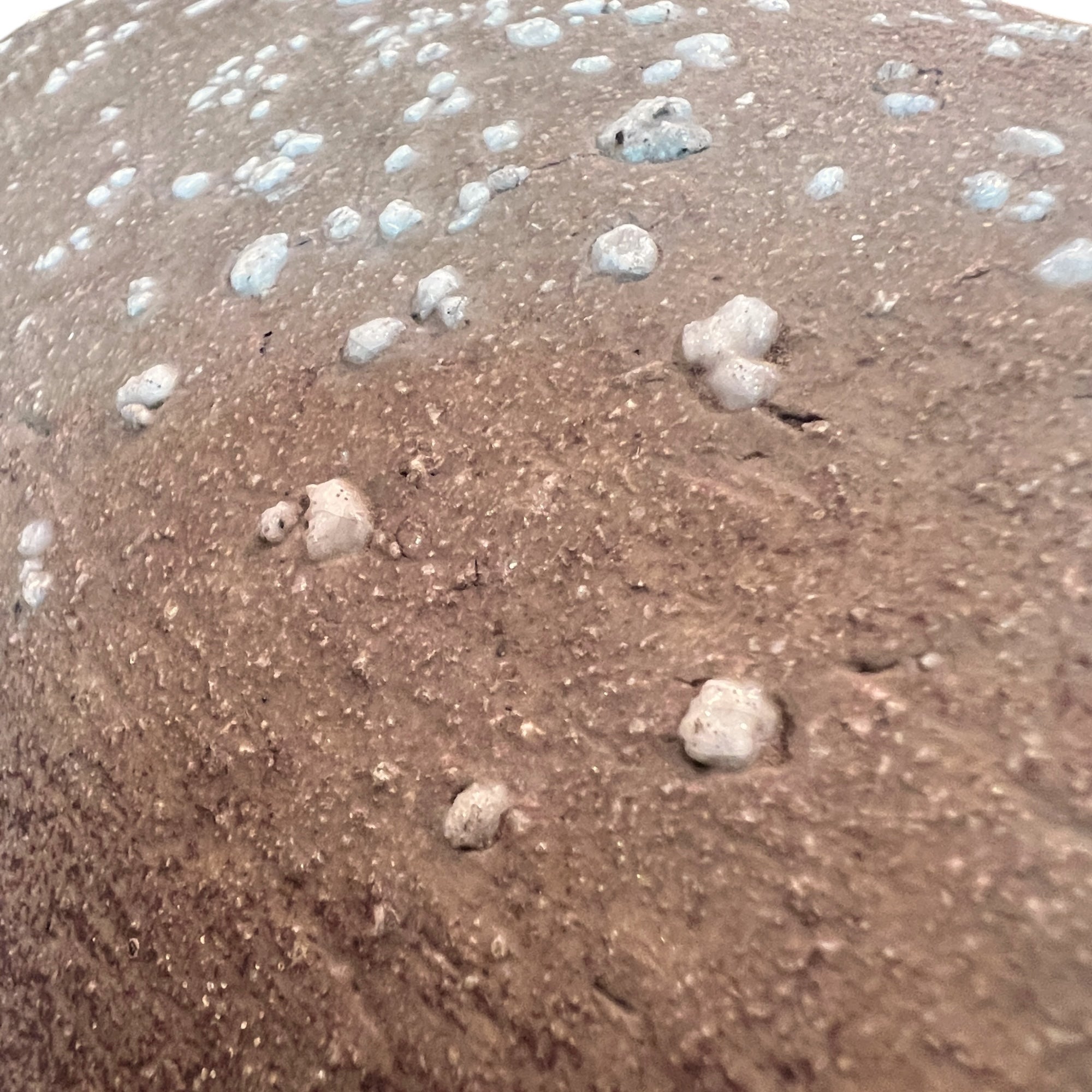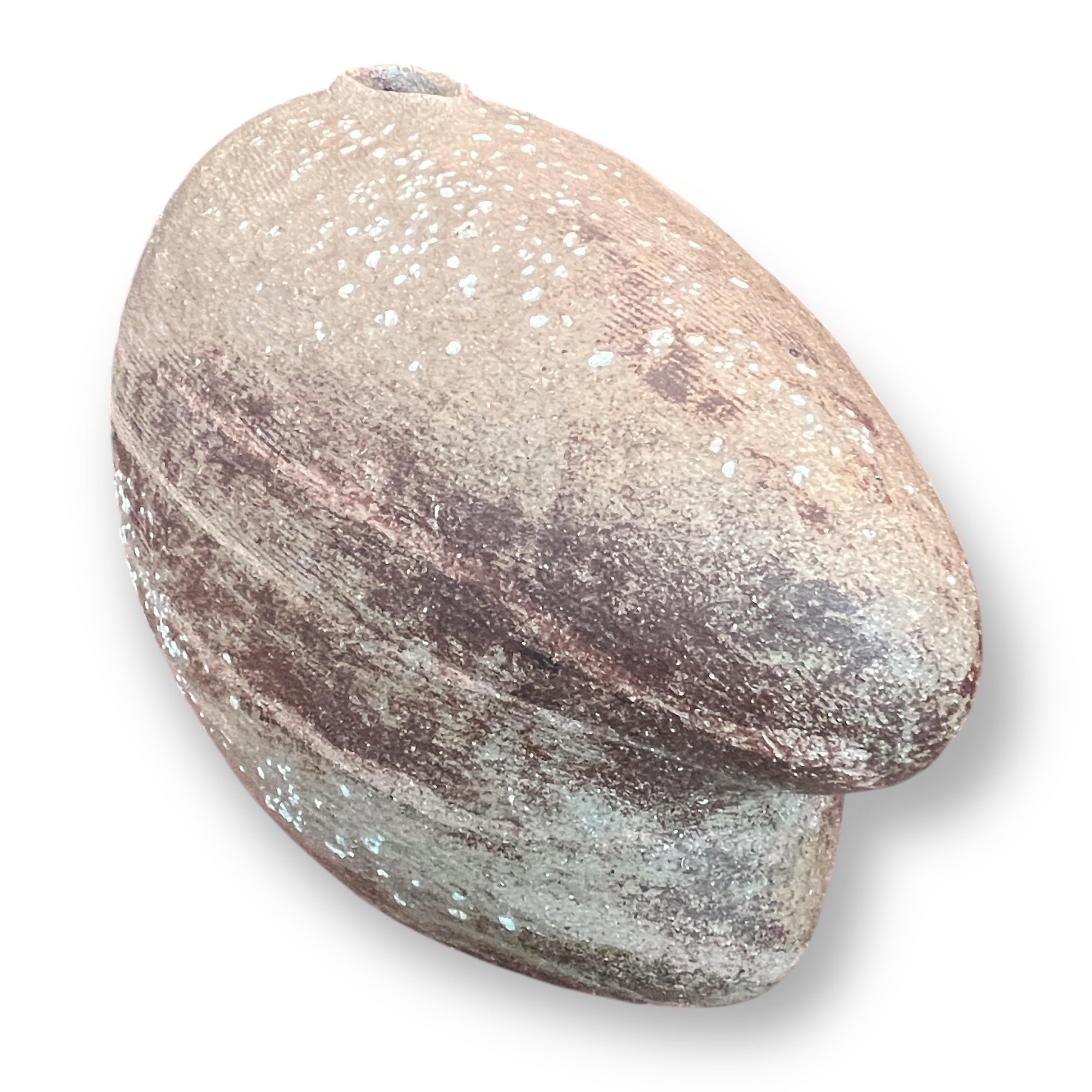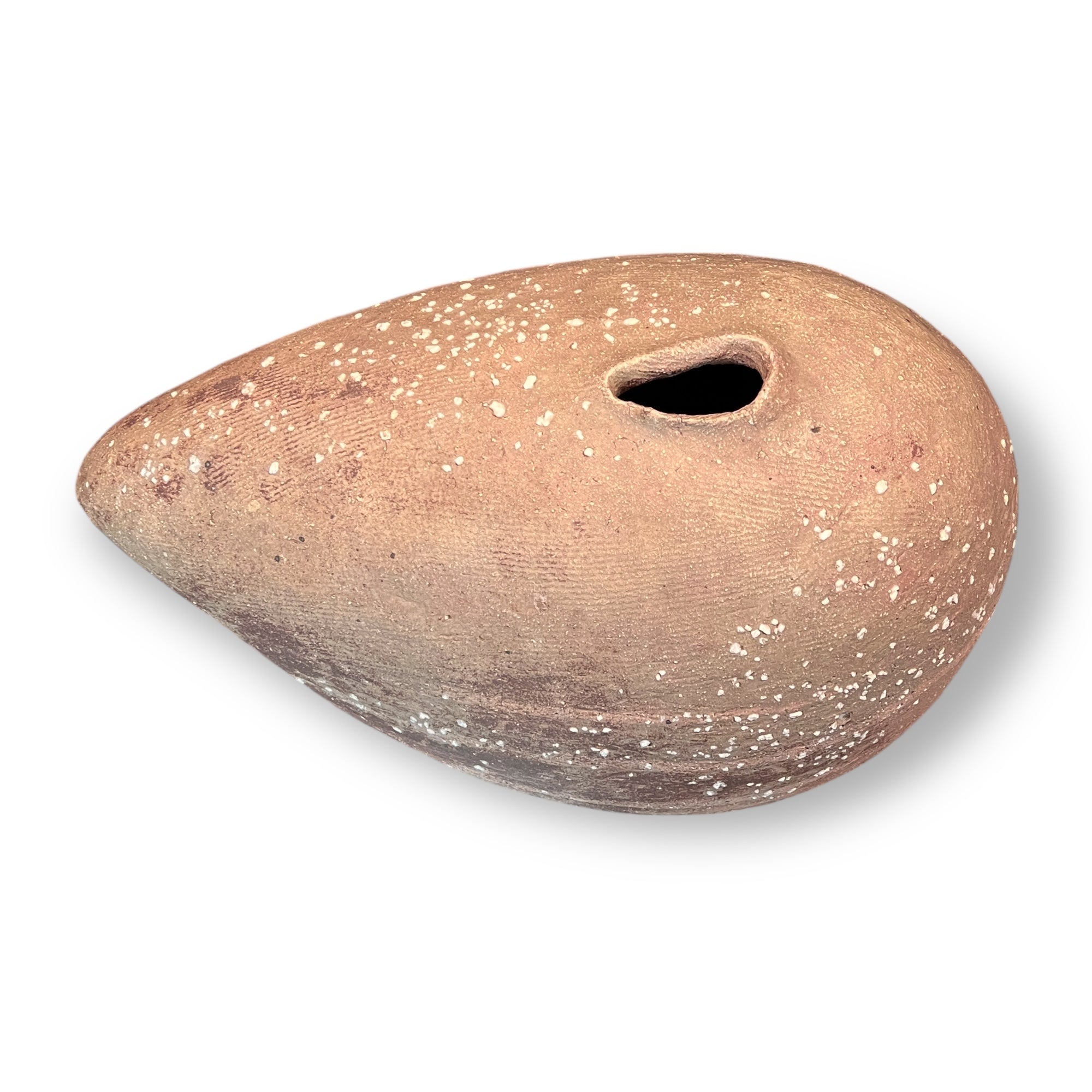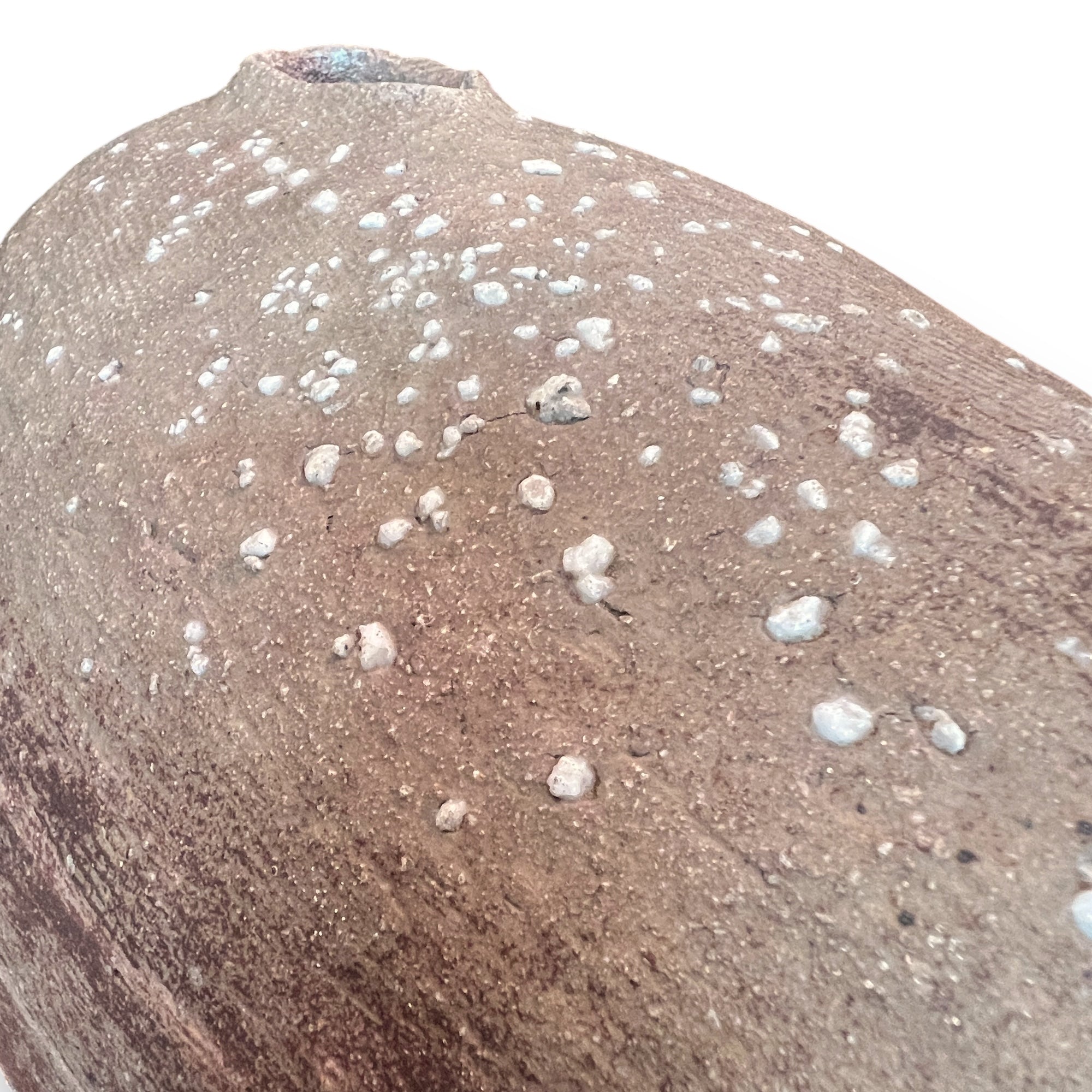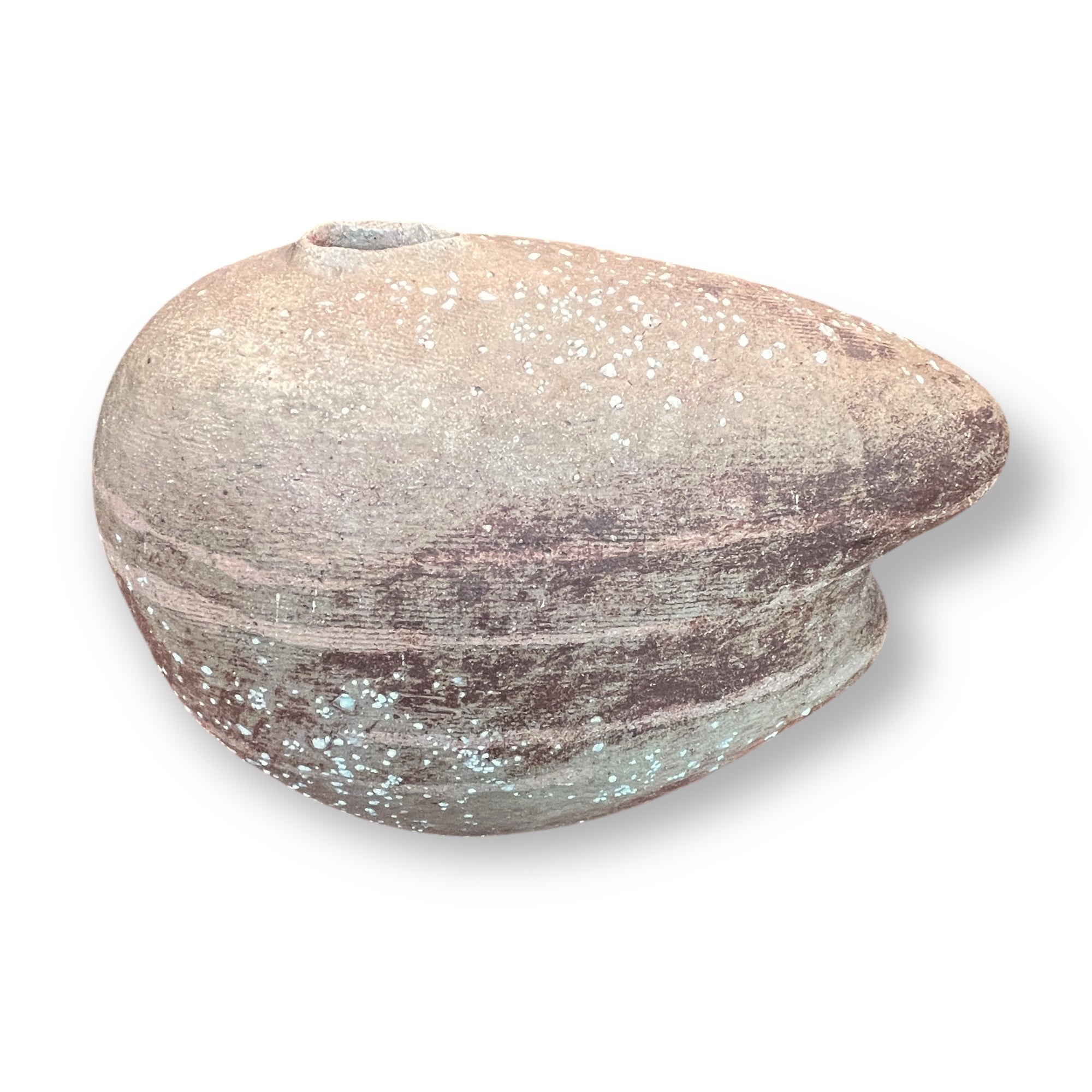 This study vase by Mizuno Sōkaku (1912-1997) captivates with its organic, flattened, and slightly bulbous shape, reminiscent of both a polished pebble and a seed ready to bloom. Made from very rough chamotte clay, the surface reveals white inclusions reminiscent of porcelain shards, while fine circular striations mark the throwing and shaping work. The small, discreet neck emphasizes the piece's intentional asymmetry. Under the base, a period label specifies that this is a study vase, testifying to a bold formal research for the time and in the artist's early years.