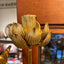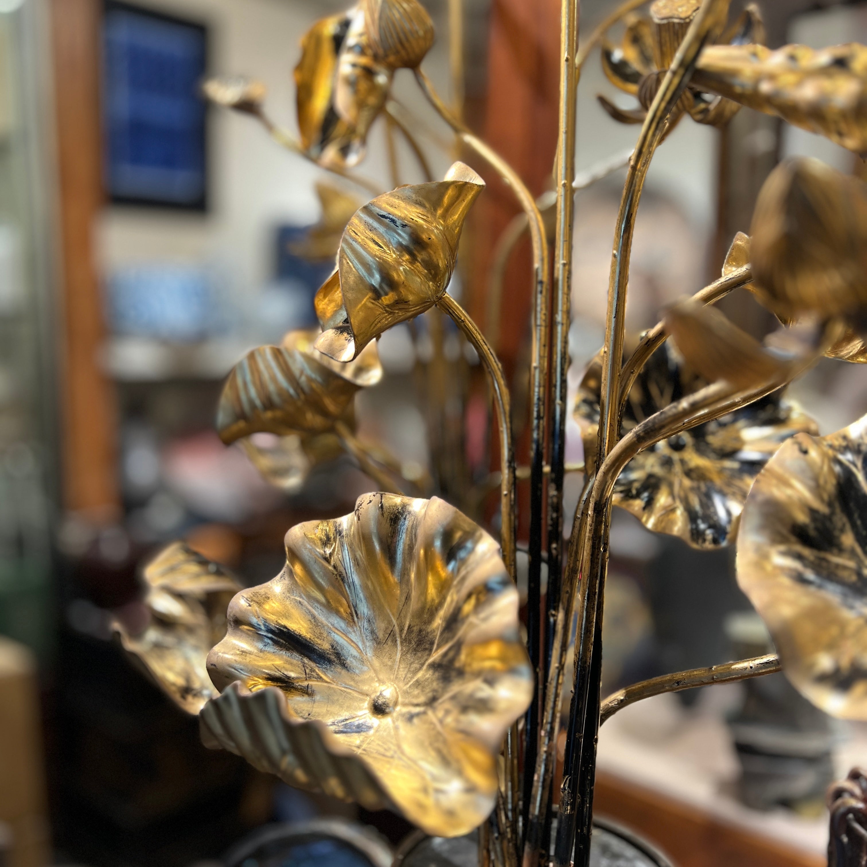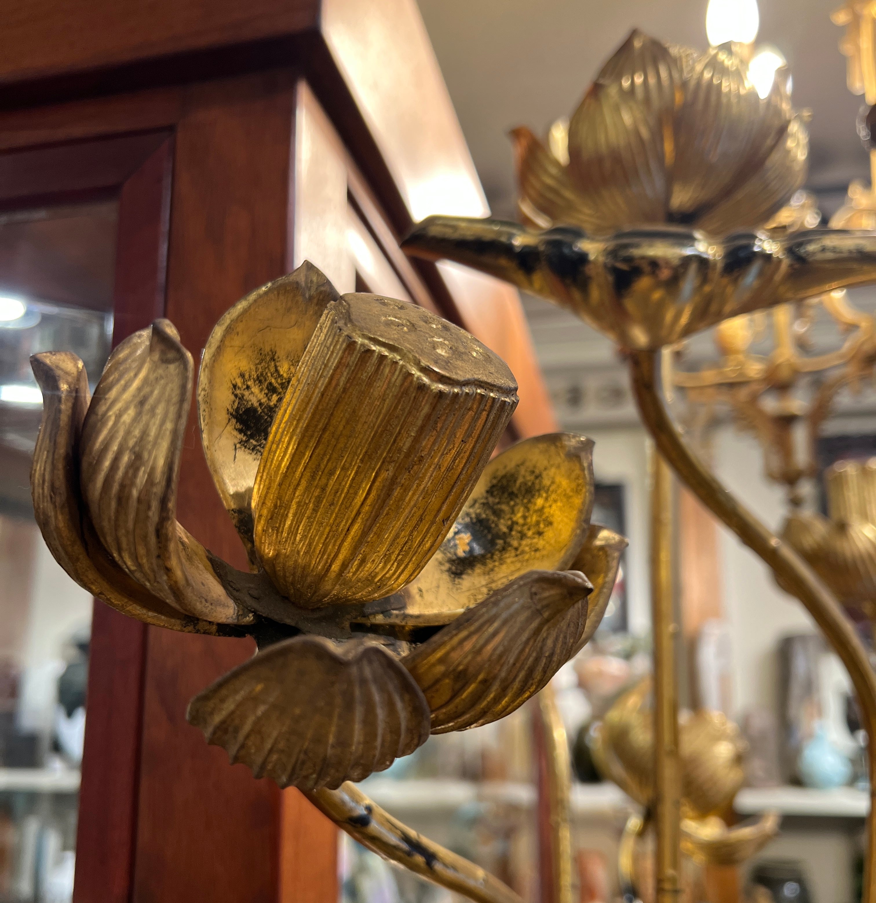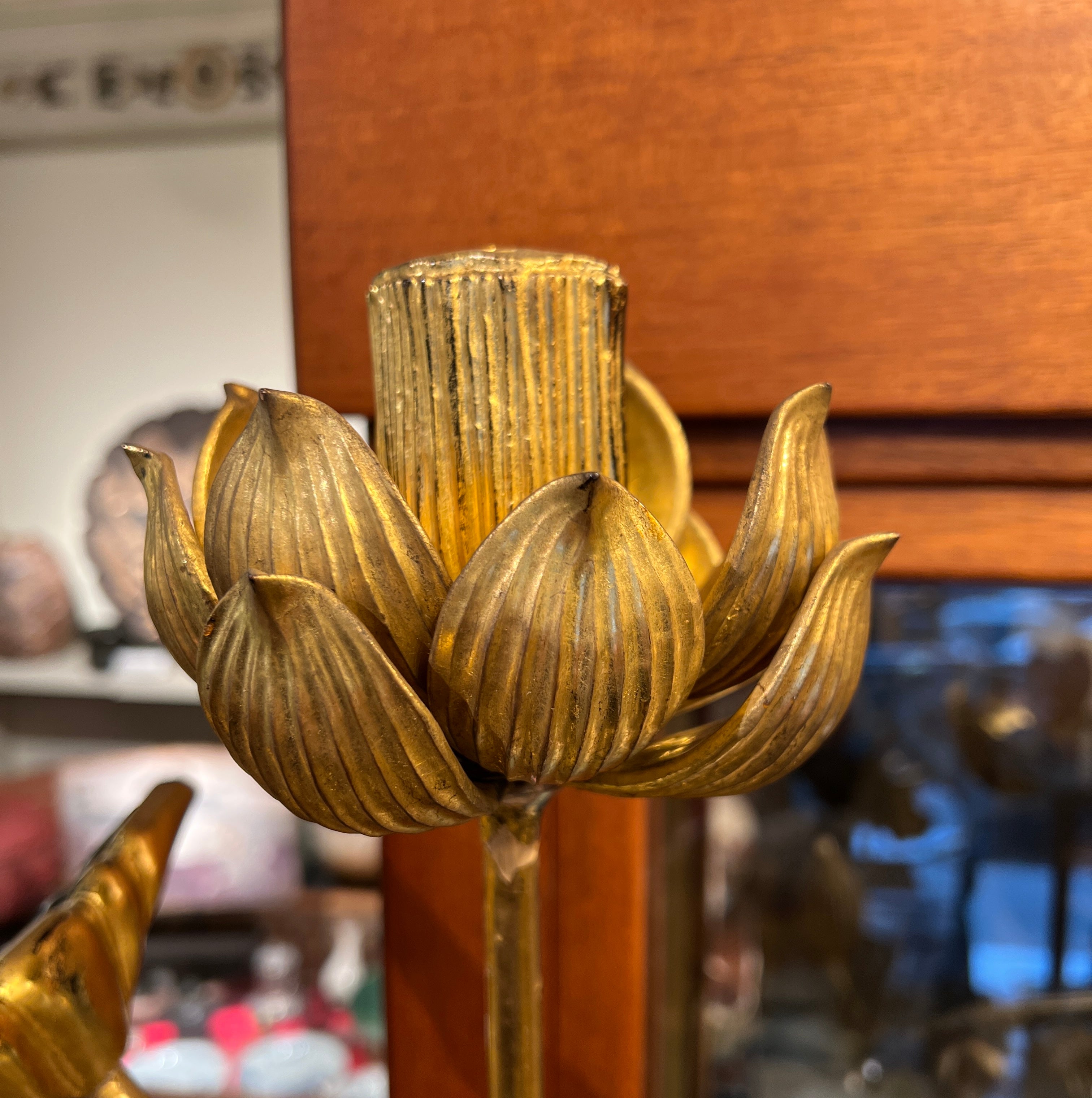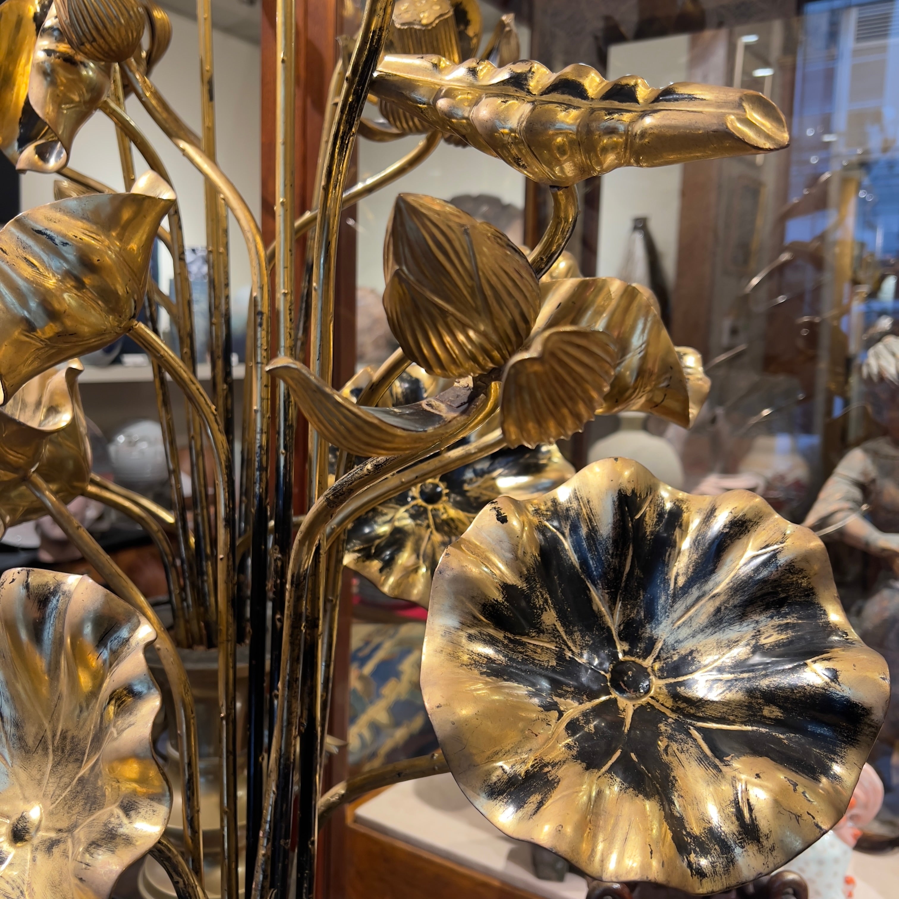 Spectaculaire paire de compositions florales japonaises d’époque Meiji, réunissant vingt-deux fleurs, boutons et feuilles de lotus en bois sculpté et doré. Chaque bouquet est présenté dans un vase en bronze et reste amovible, permettant une présentation modulable et cohérente avec l’usage ancien de ce type d’ornements, souvent associés aux décors rituels et aux espaces de temples.