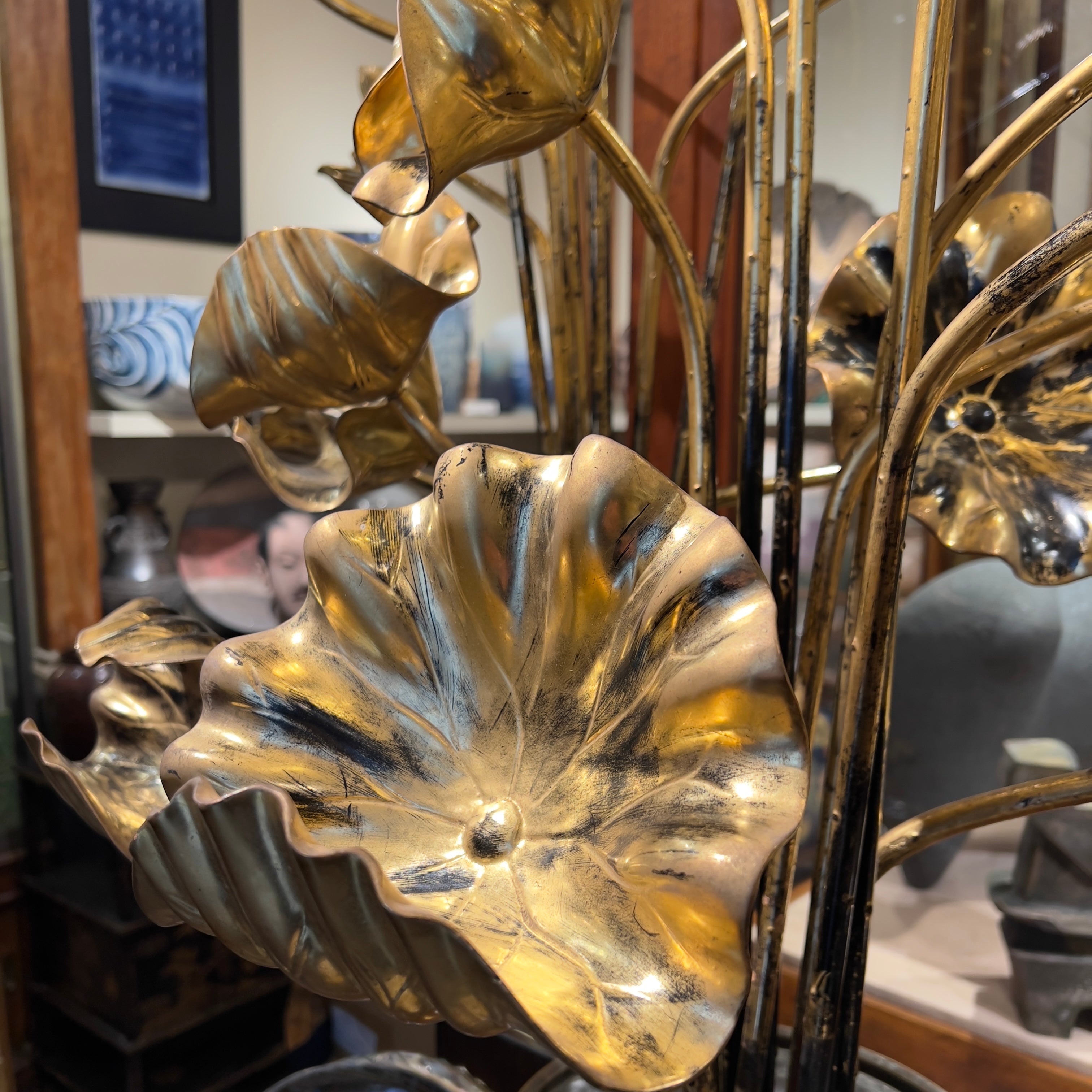 Le lotus est ici porteur d’un sens directement lié au bouddhisme : il naît dans l’eau trouble et s’élève vers la lumière sans se souiller, image du chemin spirituel. L’ouverture progressive des feuilles et l’épanouissement de la fleur symbolisent l’éveil. Cette idée est rendue par le rythme des tiges, l’alternance des boutons et des fleurs ouvertes, et le relief très lisible des nervures des feuilles, conçu pour être perçu à distance.