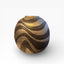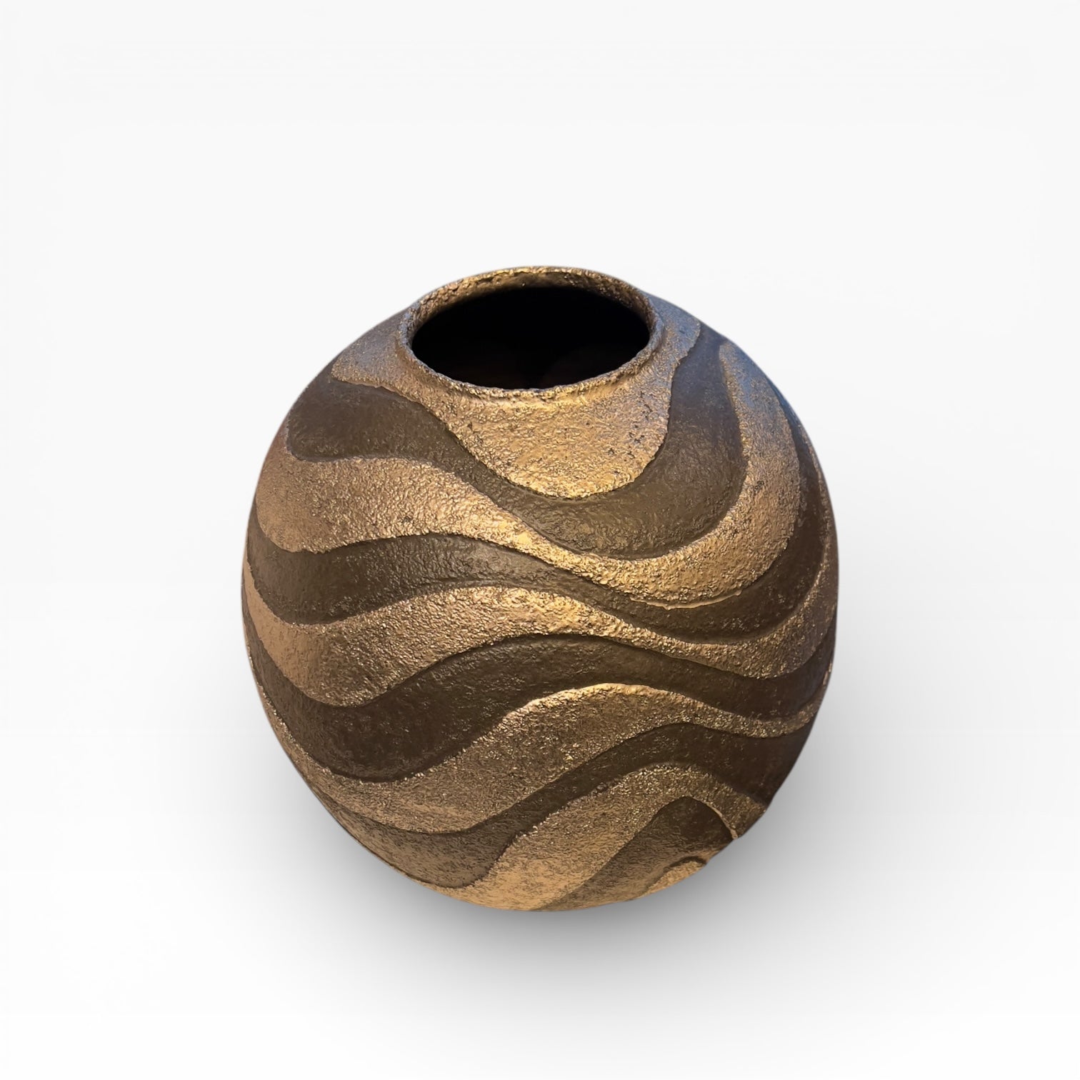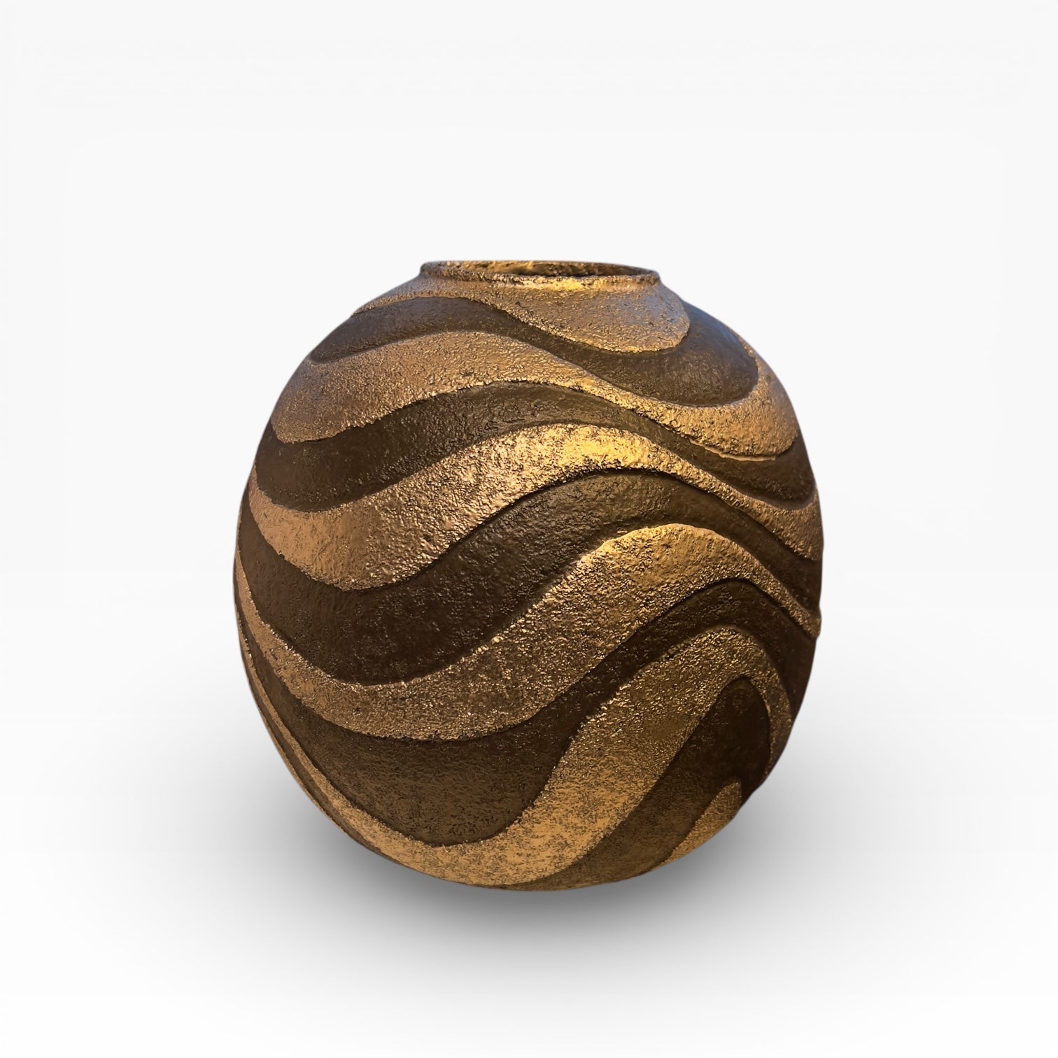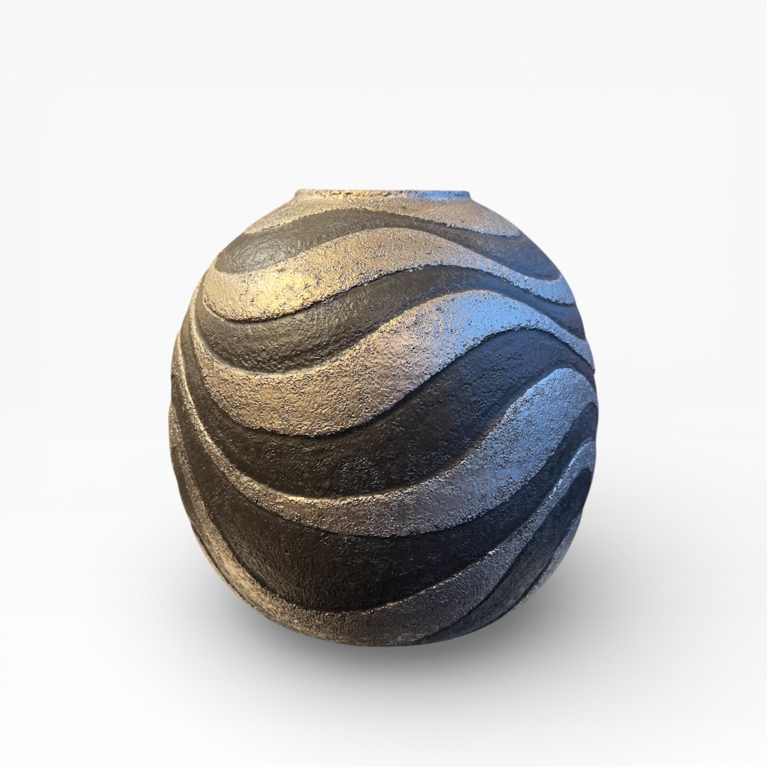 This globe-shaped vase, narrowing at the opening, presents a striking contrast between a dark, matte black background and wide, undulating ribbons with a silvery sheen. The abstract, continuous decoration unfolds around the body like a rhythmic line, creating a highly graphic presence.