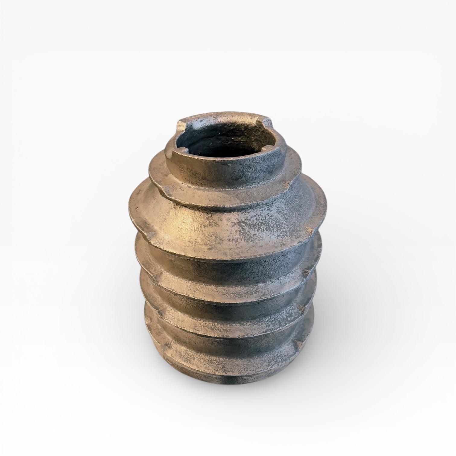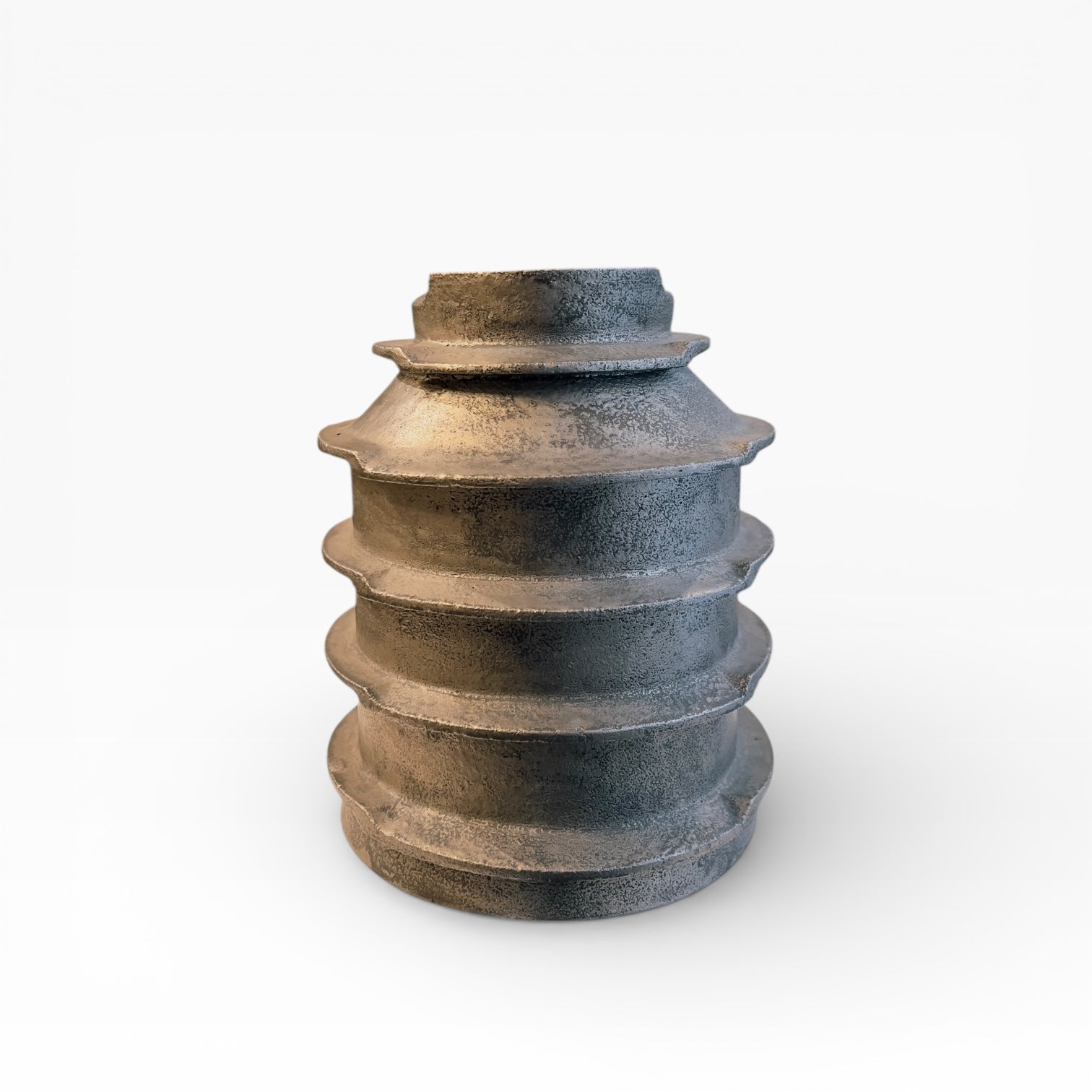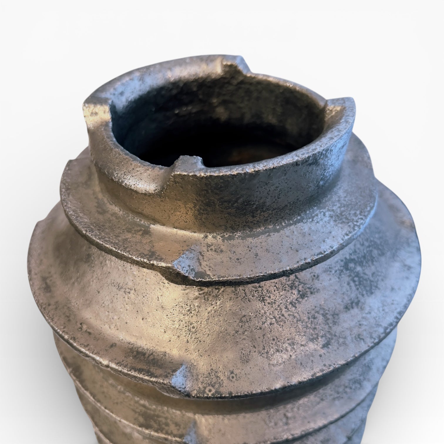 This vase is constructed like a cylinder with superimposed registers, clearly distinguishing the successive "levels." Its deliberately compact profile evokes a notched mechanical part: an almost industrial form, based on the rigor of its volume rather than ornamentation. The thick, slightly incised lip reinforces the impression of a sculpted and assertive form.