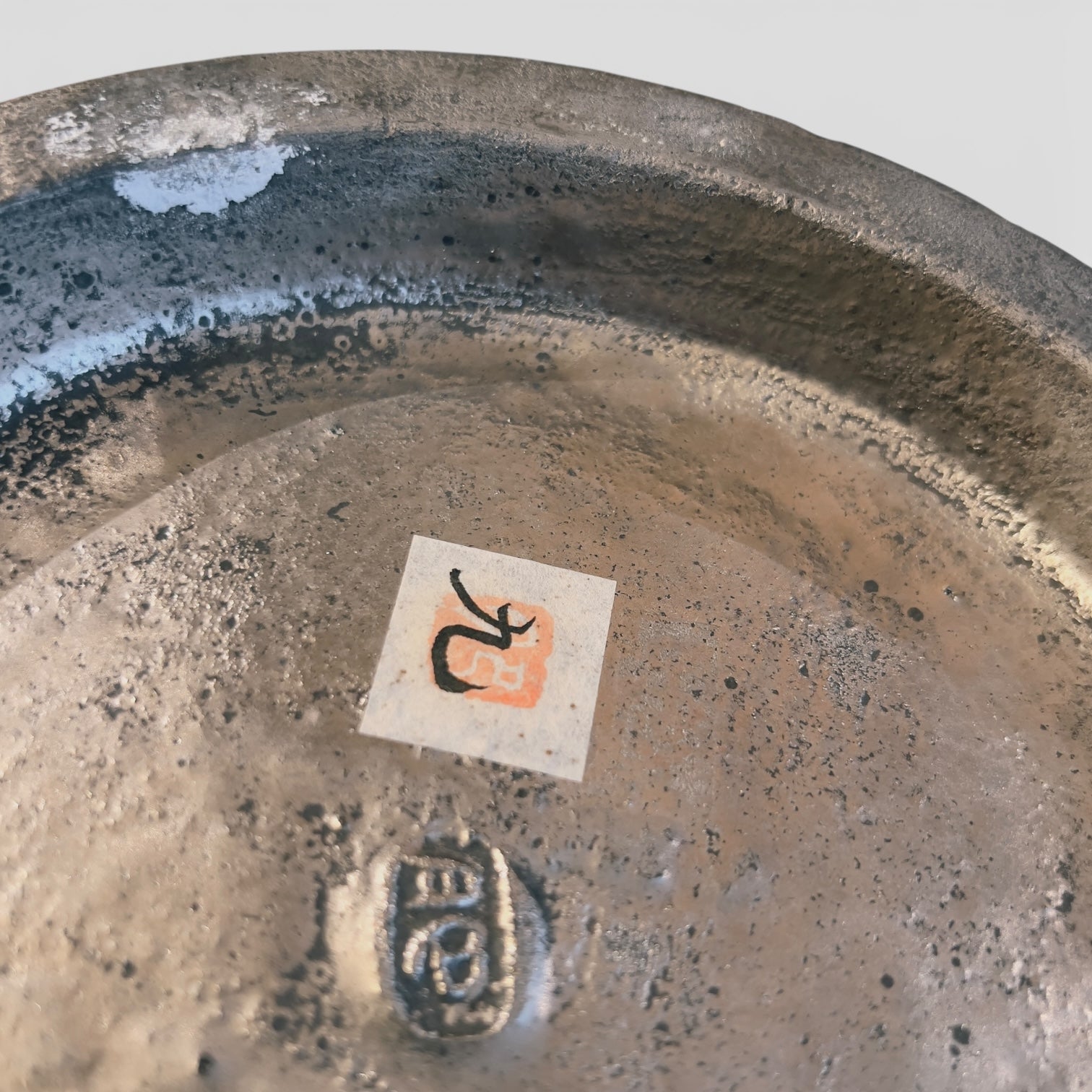 The entire surface has a continuous, metallic, silvery sheen that catches the light across the whole piece. The variations in gray, from dark to light, are achieved solely through the material and firing process, without any added decoration. The piece is signed underneath and does not have a tomobako (a decorative element).