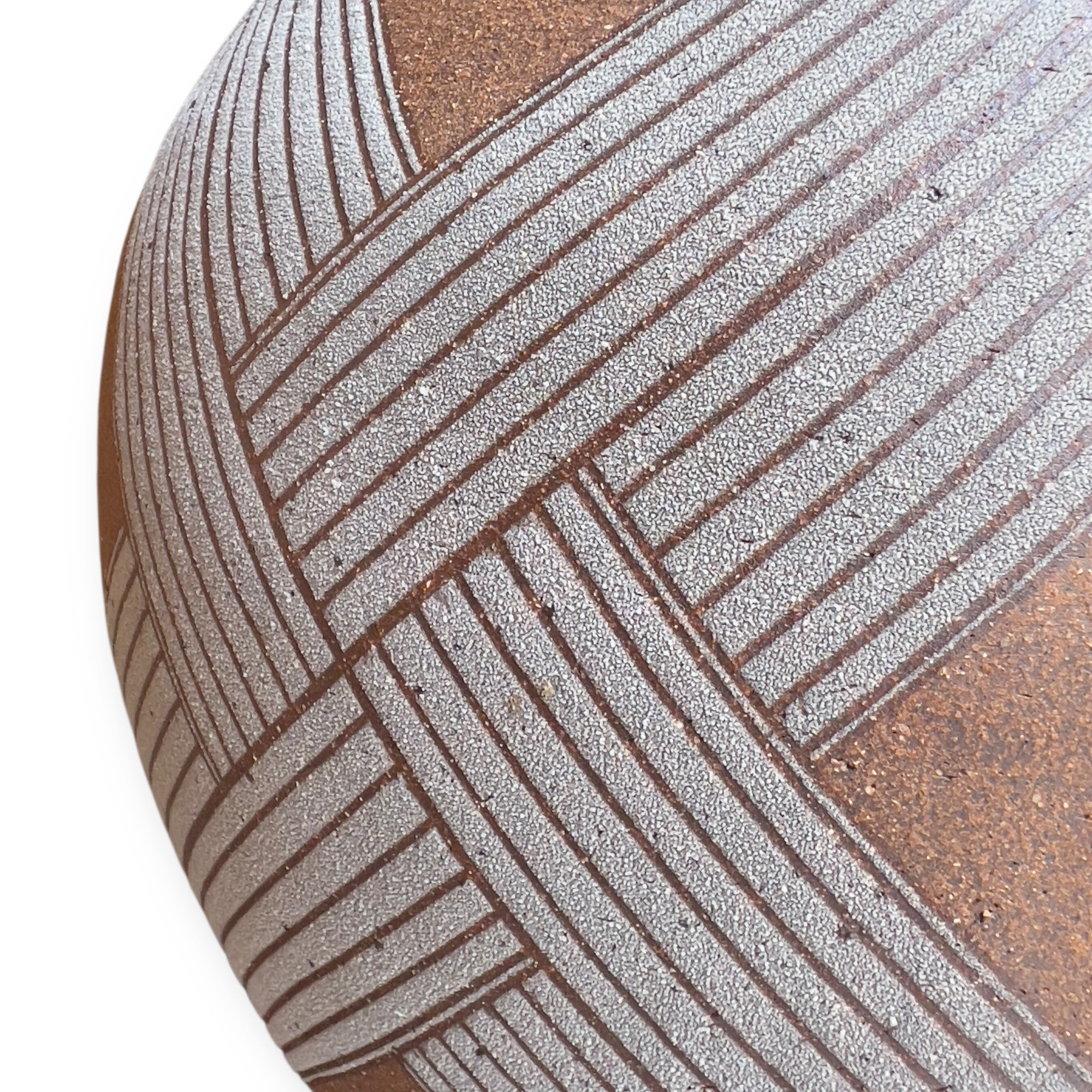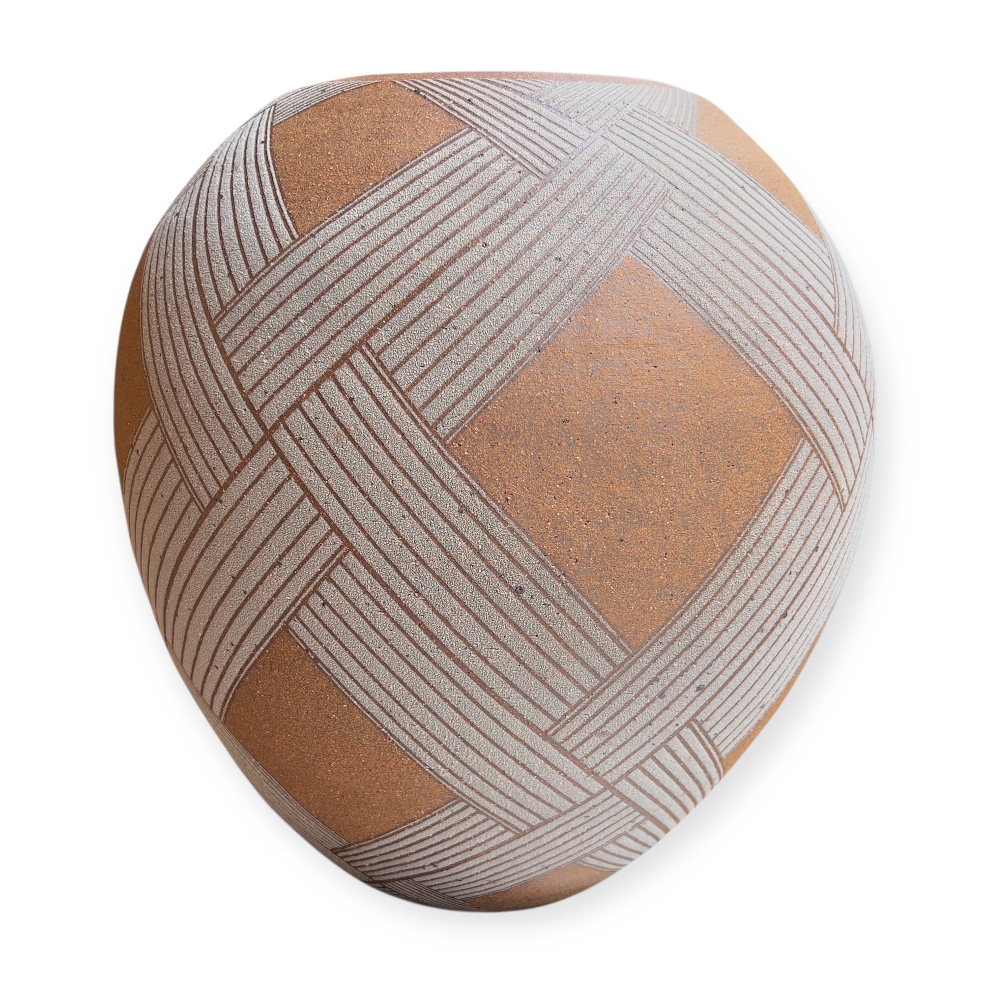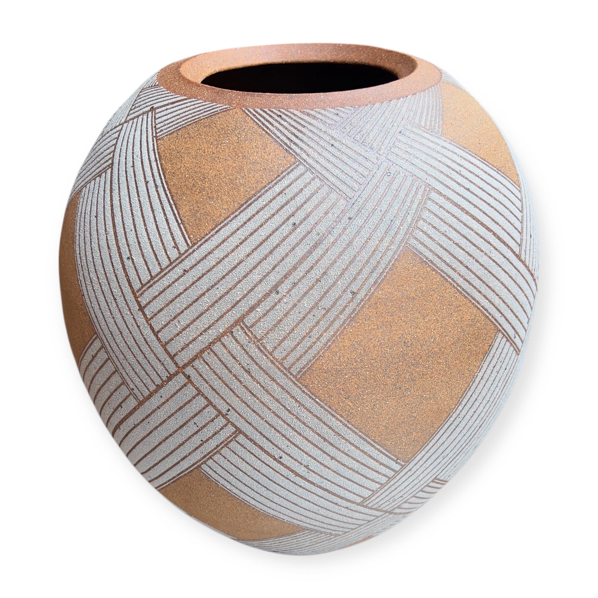 The vase entitled White Wicker Pot, presented at Toki Nishikawa's solo exhibition in 2006 at the Keyaki Gallery in Osaka, is a stoneware piece measuring 36 cm in height and 34 cm in diameter. Its surface is punctuated by white bands with a grainy texture, demarcated by sharp incisions that structure the form. The contrast between the rough areas and the smoother parts is based on a sober and precise plastic logic. The spherical volume is slightly tightened at the neck.