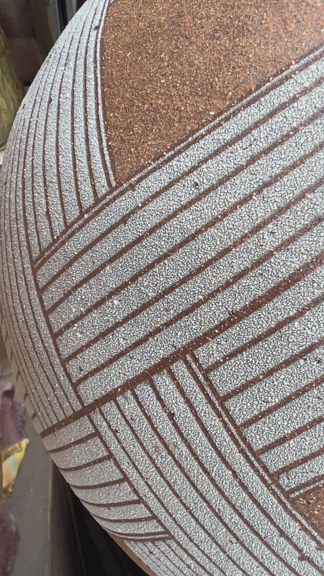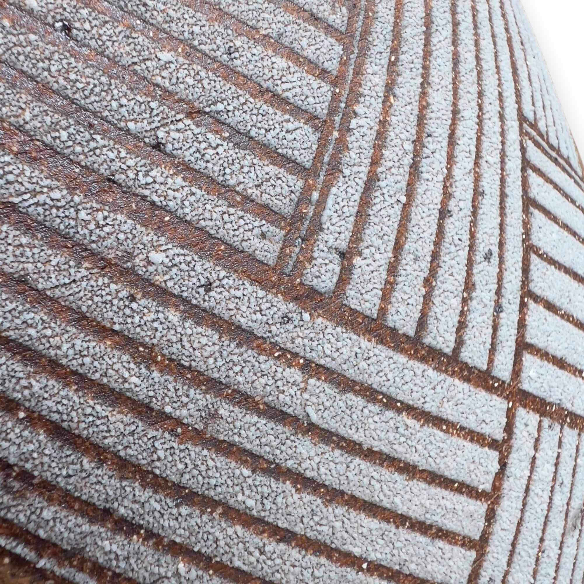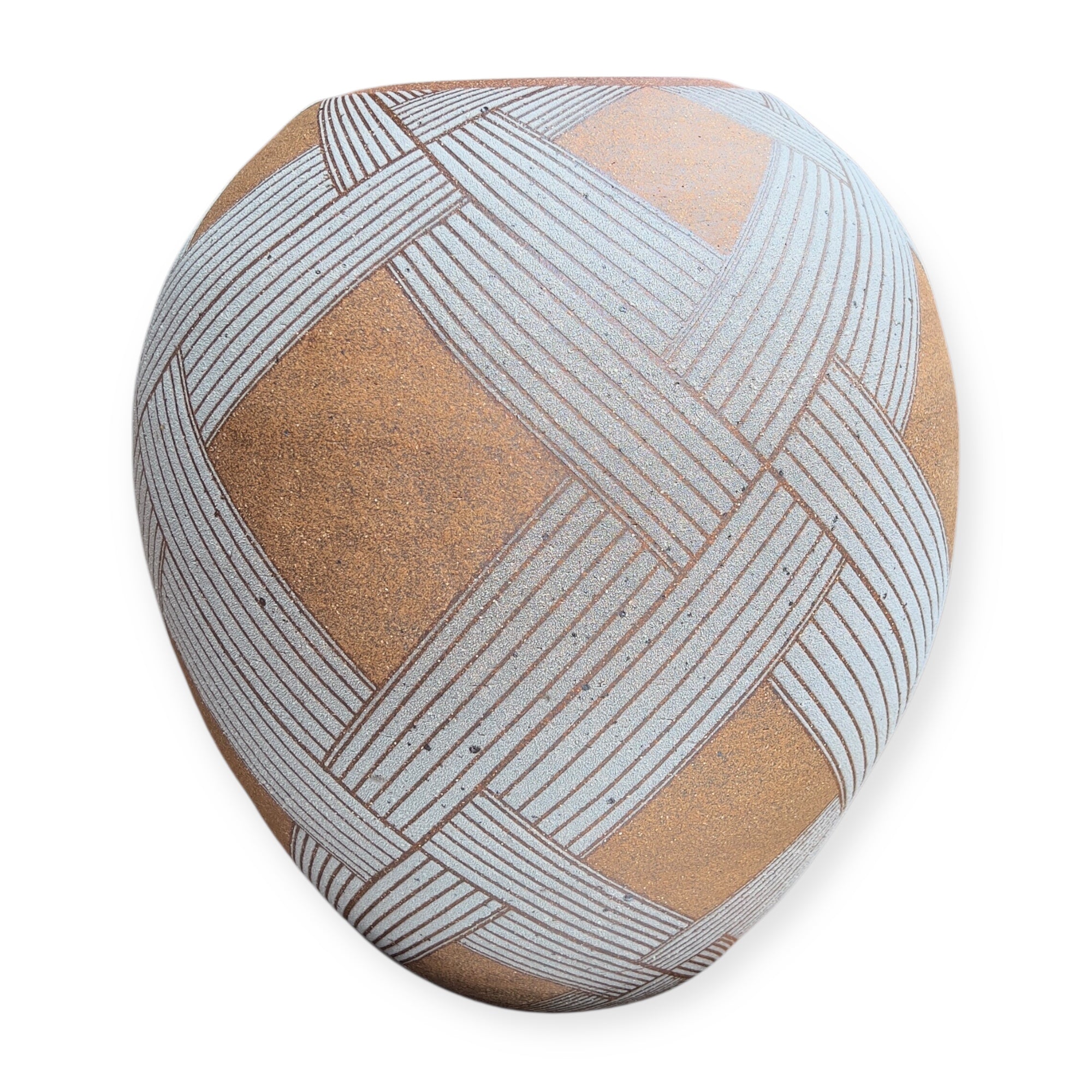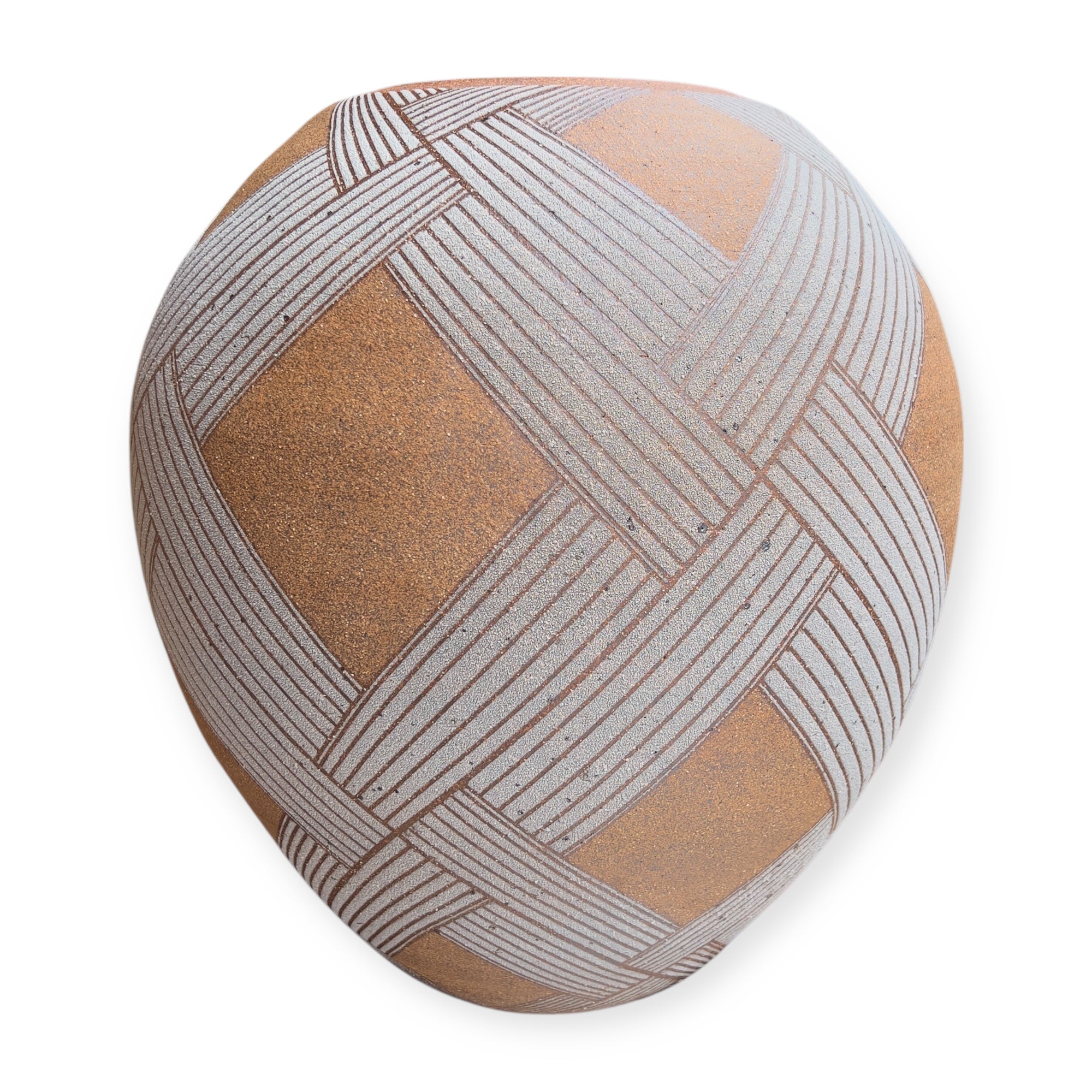 The vase entitled White Wicker Pot, presented at Toki Nishikawa's solo exhibition in 2006 at the Keyaki Gallery in Osaka, is a stoneware piece measuring 36 cm in height and 34 cm in diameter. Its surface is punctuated by white bands with a grainy texture, demarcated by sharp incisions that structure the form. The contrast between the rough areas and the smoother parts is based on a sober and precise plastic logic. The spherical volume is slightly tightened at the neck.